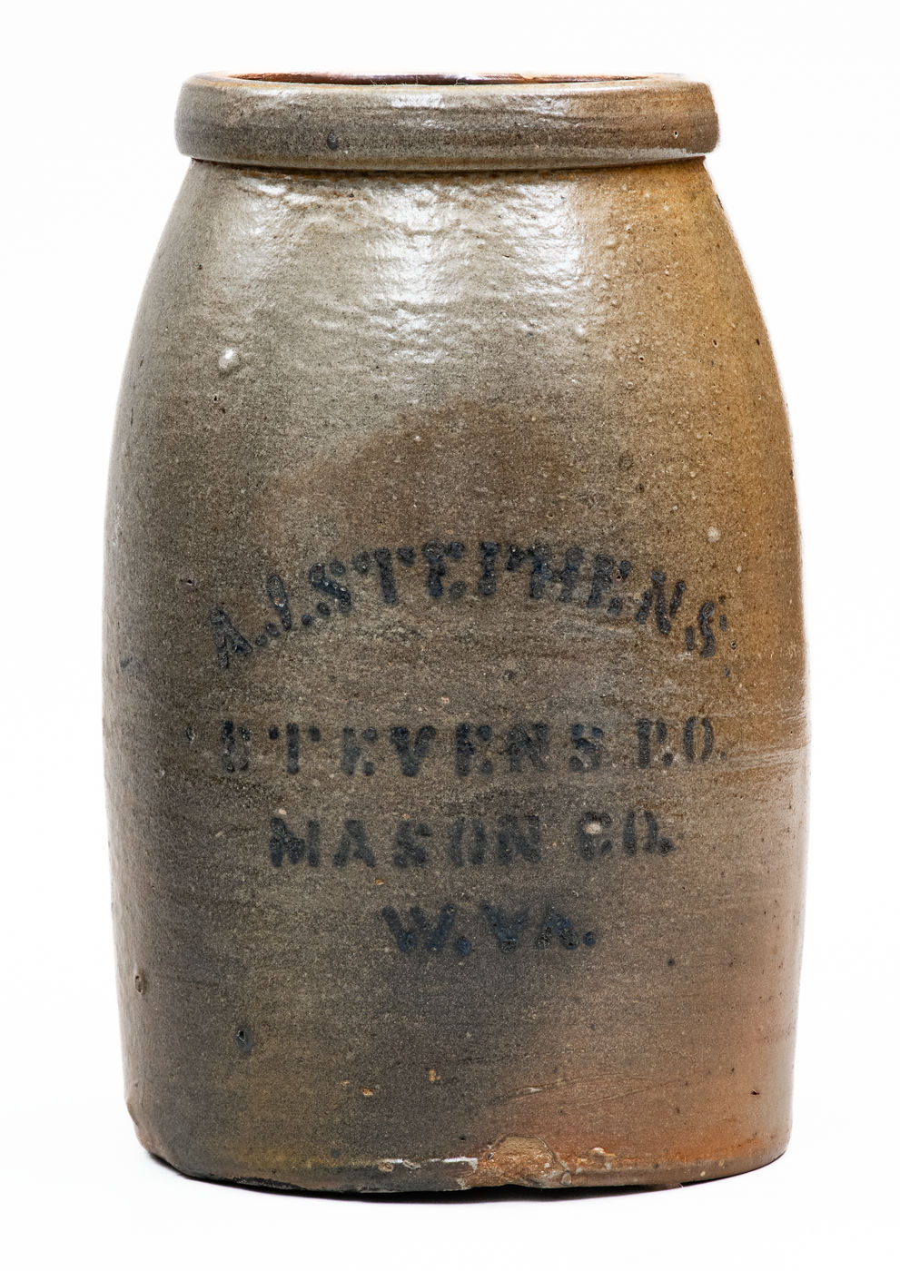 ×Very Rare A. J. STEPHENS / STEVENS P.O. / MASON CO., W. VA Stoneware Stenciled Canning Jar