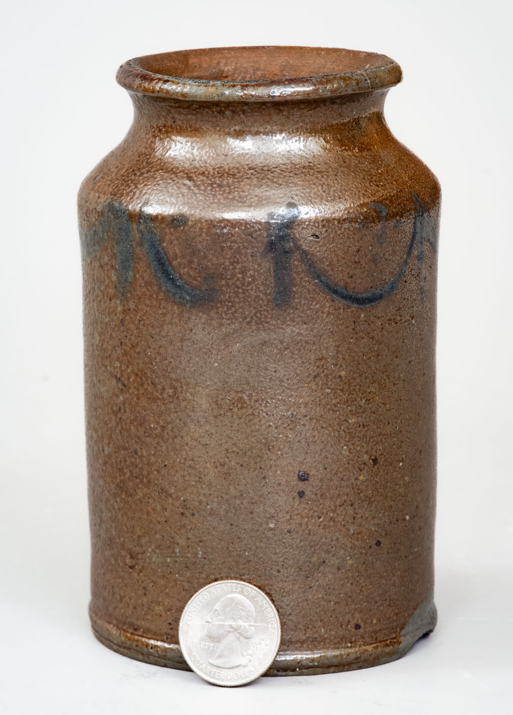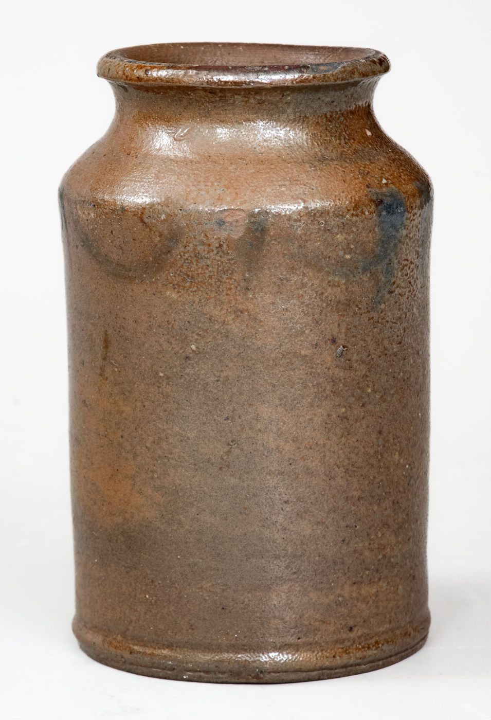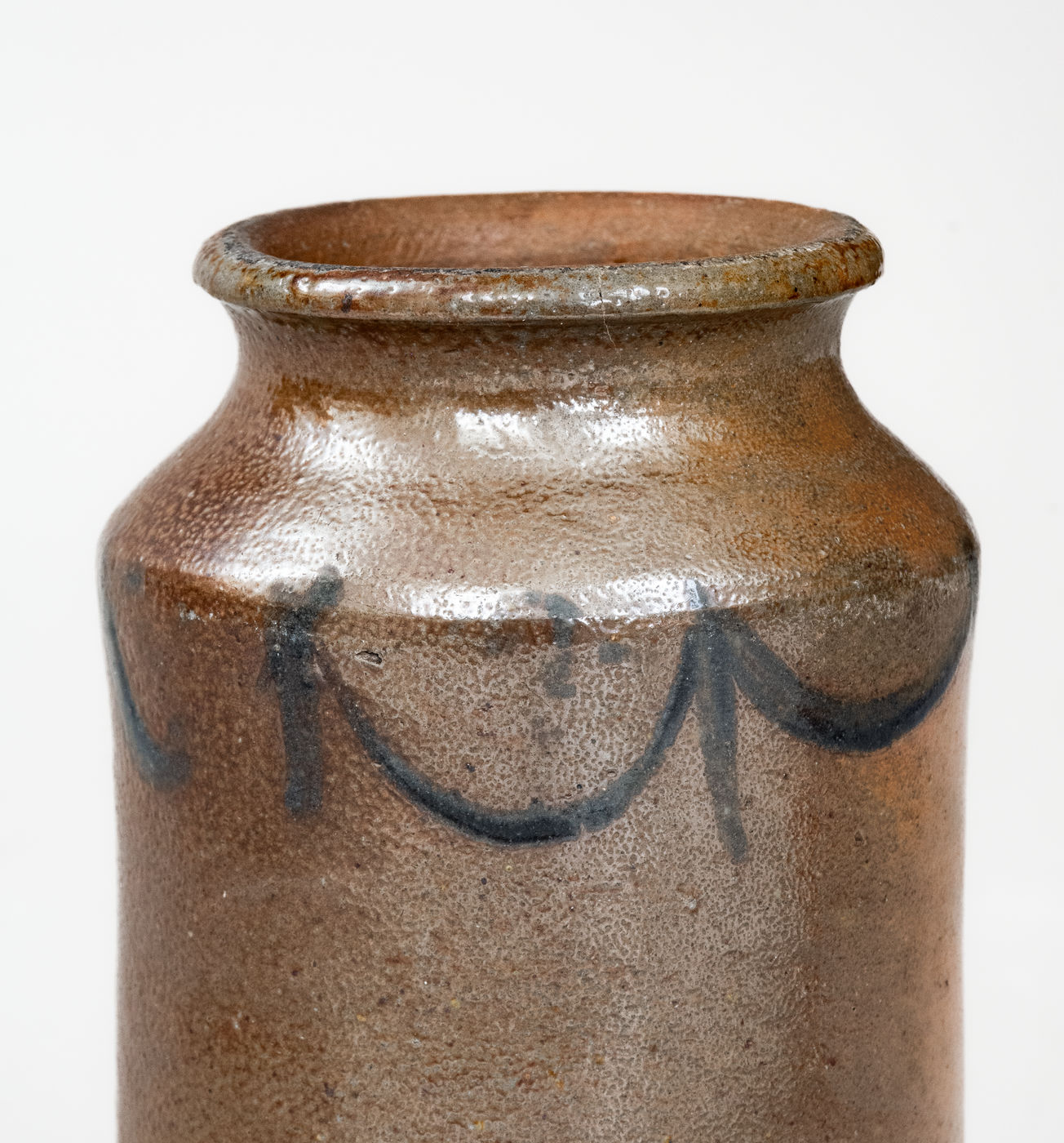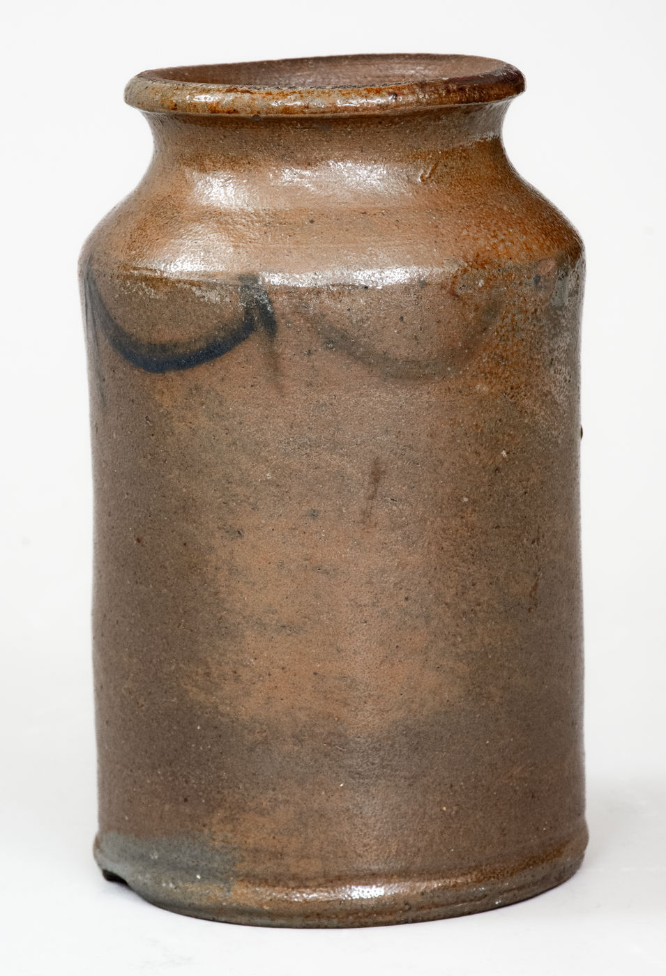Very Rare Diminutive Stoneware Jar with Cobalt Drape-and-Tassel Decoration, attributed to Samuel Wilson, probably at the Benjamin DuVal & Co. Pottery, Richmond, VA, circa 1817-1820, cylindrical jar with footed base, tapered shoulder, and rounded rim, brush-decorated around the shoulder with a Federal drape-and-tassel motif related to Northeastern designs of the period. This vessel, possibly the smallest known attributable to Wilson, was likely made circa 1817-1820 at the pottery of Richmond druggist, Benjamin DuVal, shortly after the former's training in Albany, New York circa 1813-1816. Its highly unusual size and scarce form suggest it may have been made as an apothecary jar for DuVal's pharmacy. Literature: Robert Hunter and Marshall Goodman, in their Ceramics in America 2005 article, "The Destruction of the Benjamin DuVal Stoneware Manufactory, Richmond, Virginia," illustrate jar fragments from this site in figure 28 that "probably represent the 1/8-gallon (one pint) jars advertised by DuVal, which undoubtedly he used in his apothecary business." Essentially as-made condition with a narrow 1" in-the-firing base flake, a minor in-the-firing contact mark to rim and shoulder, and minor shoulder wear. H 5 1/2".