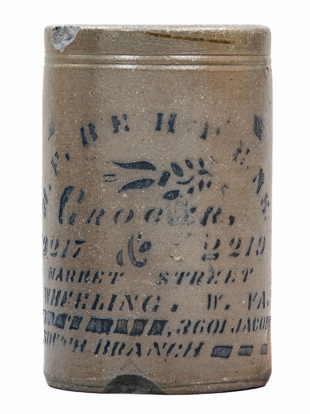 ×Wheeling, W. VA Stoneware Stenciled Canning Jar w/ Elaborate Advertising