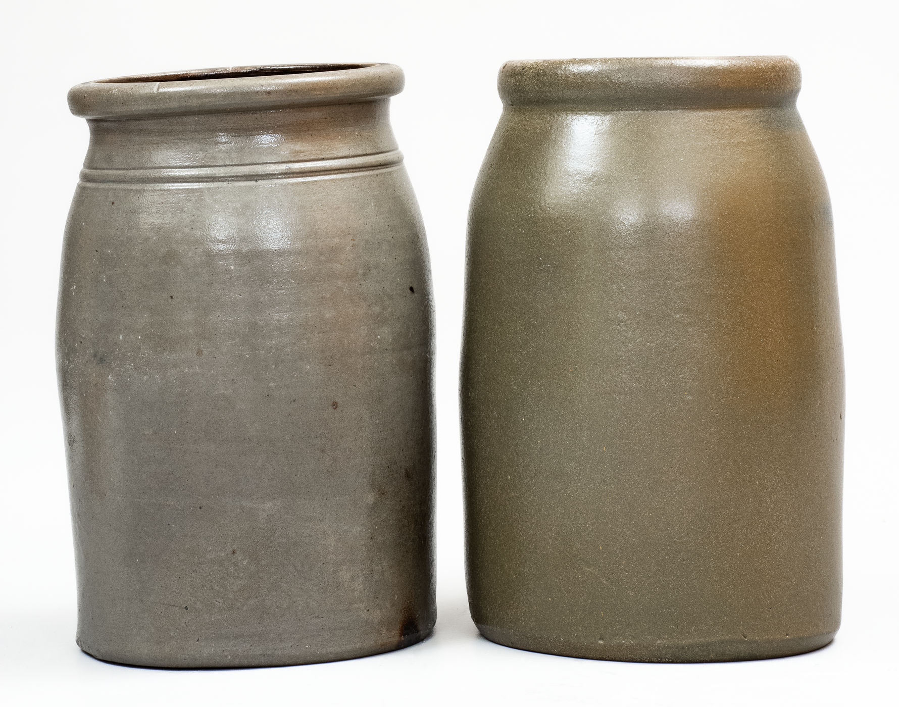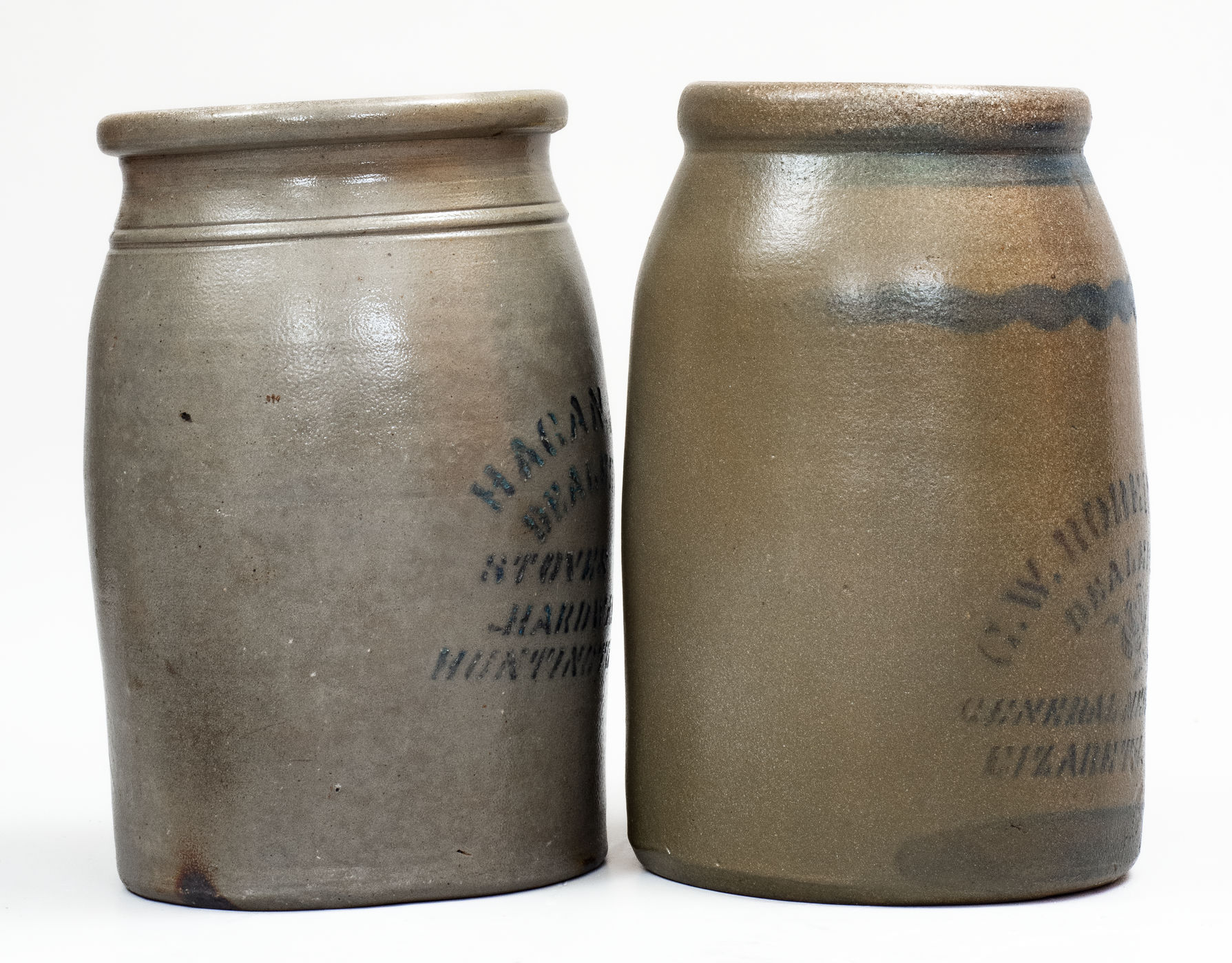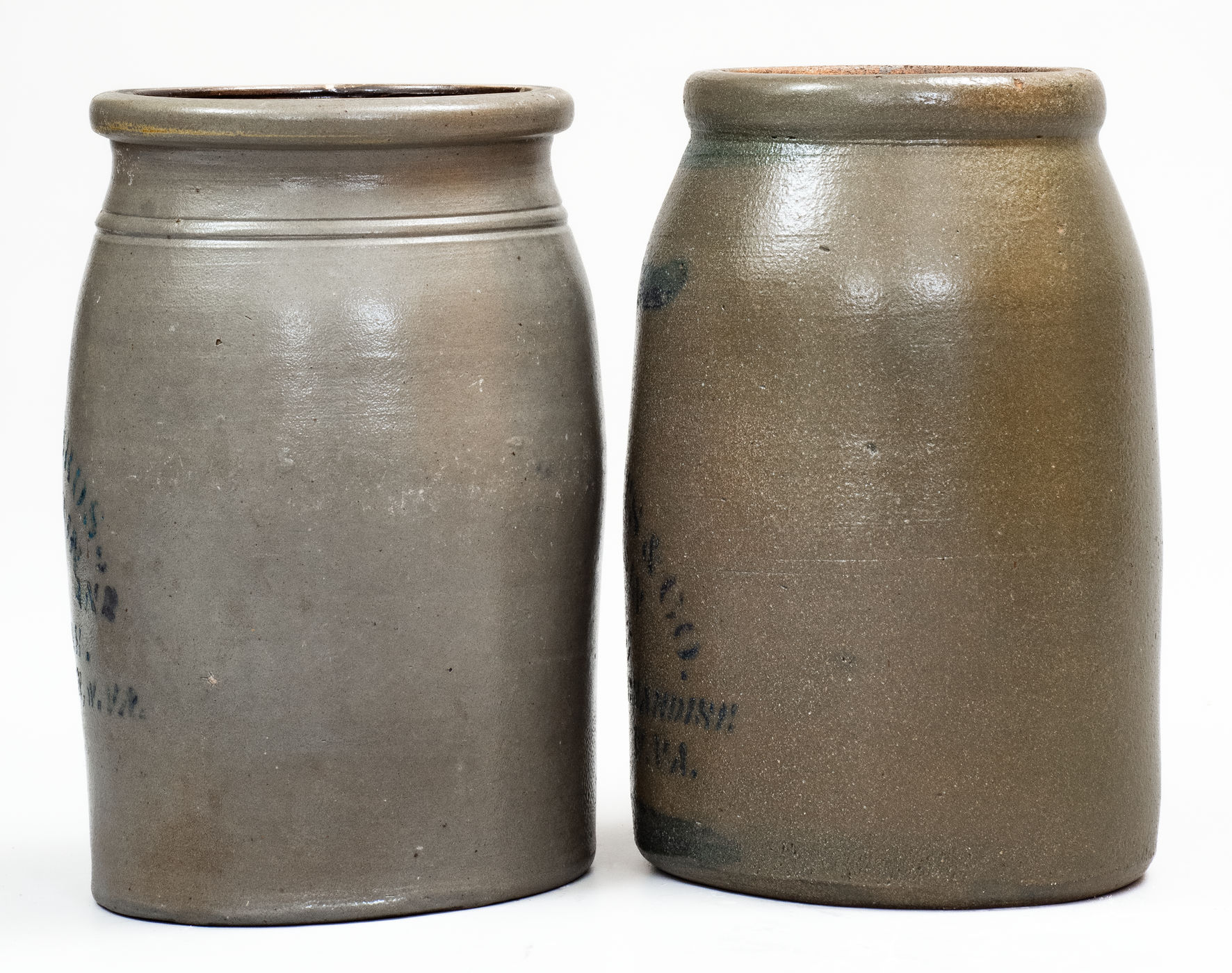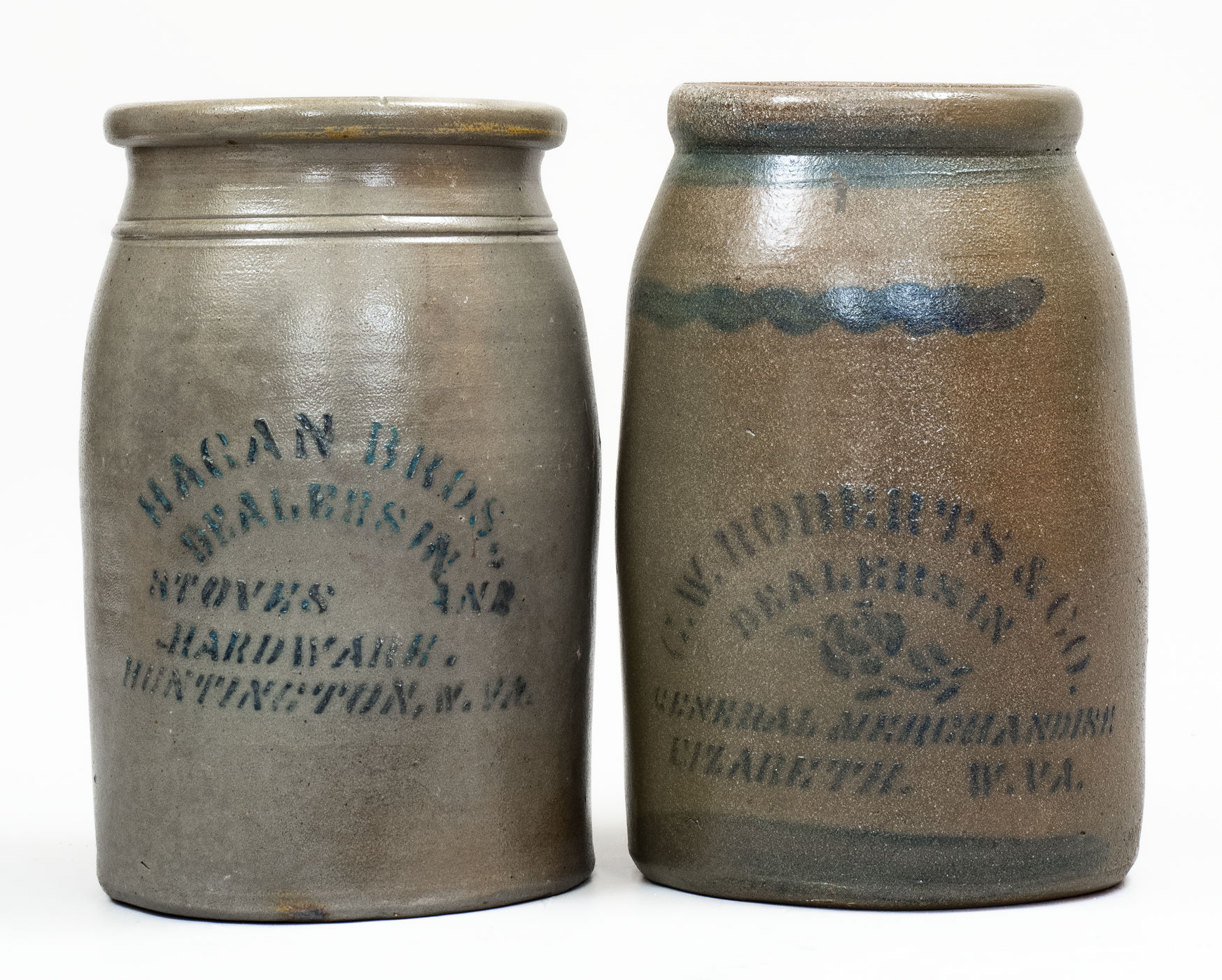 ×Lot of Two: HUNTINGTON, W. VA. and ELIZABETH, W. VA. Stoneware Advertising Canning Jars
