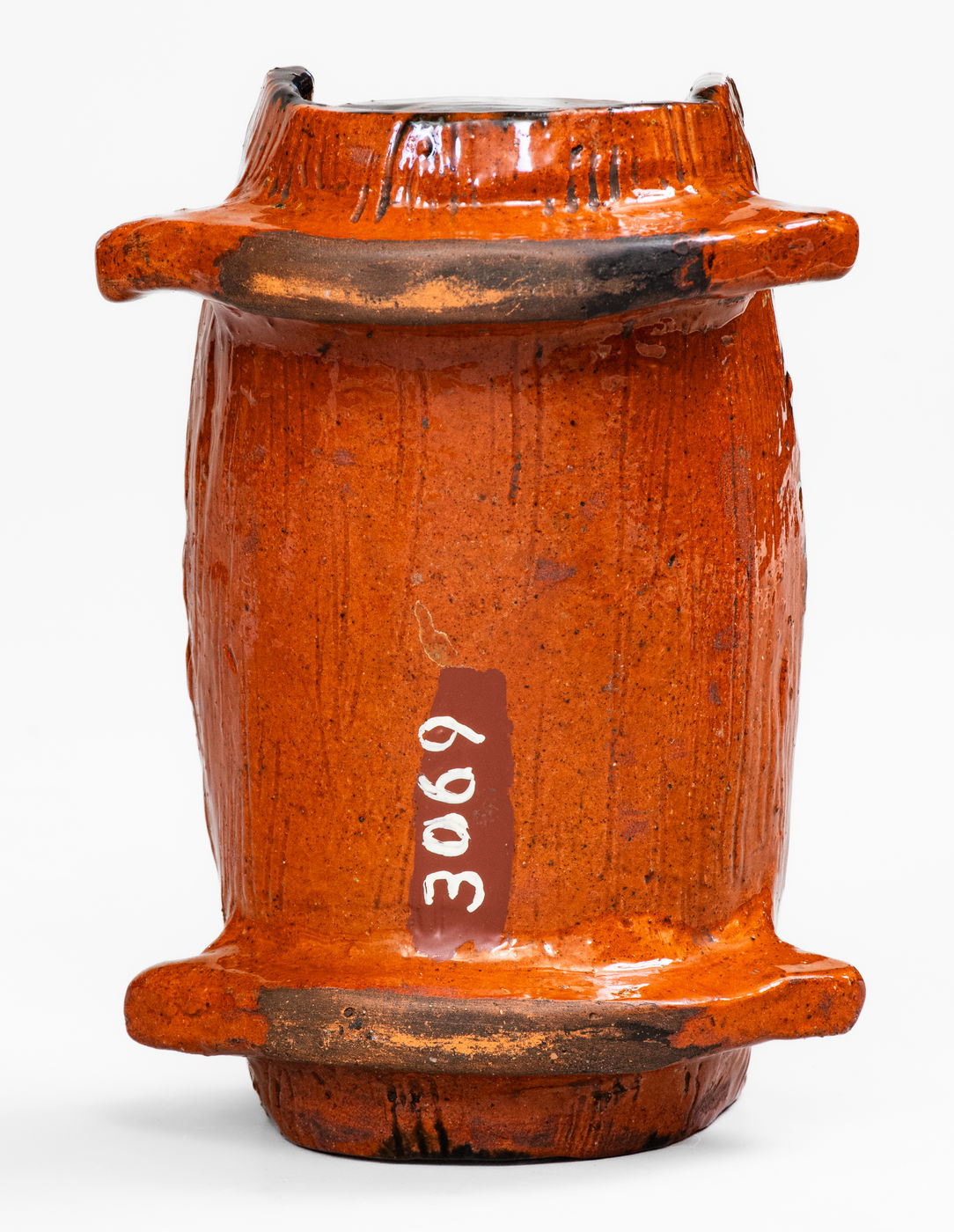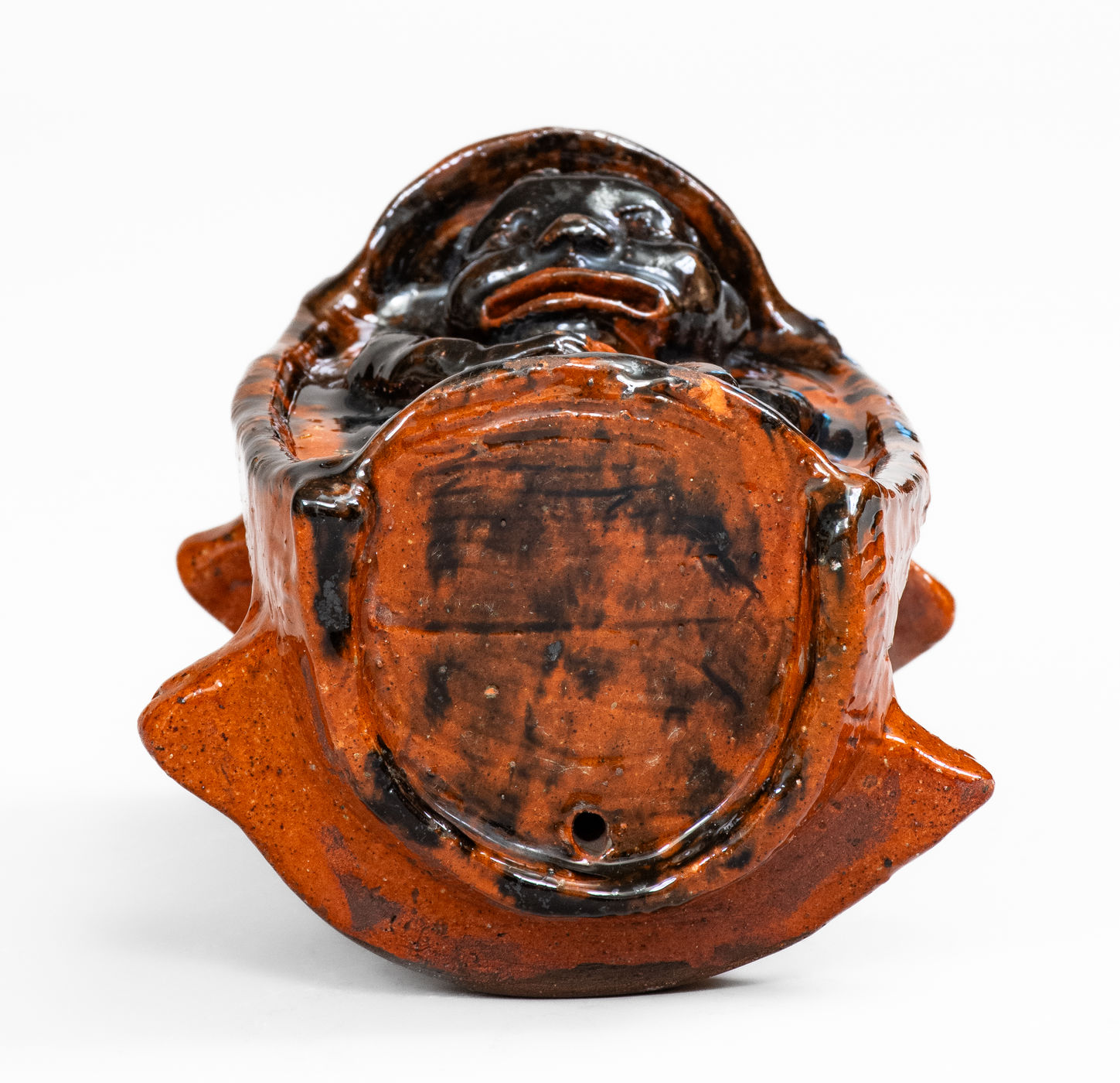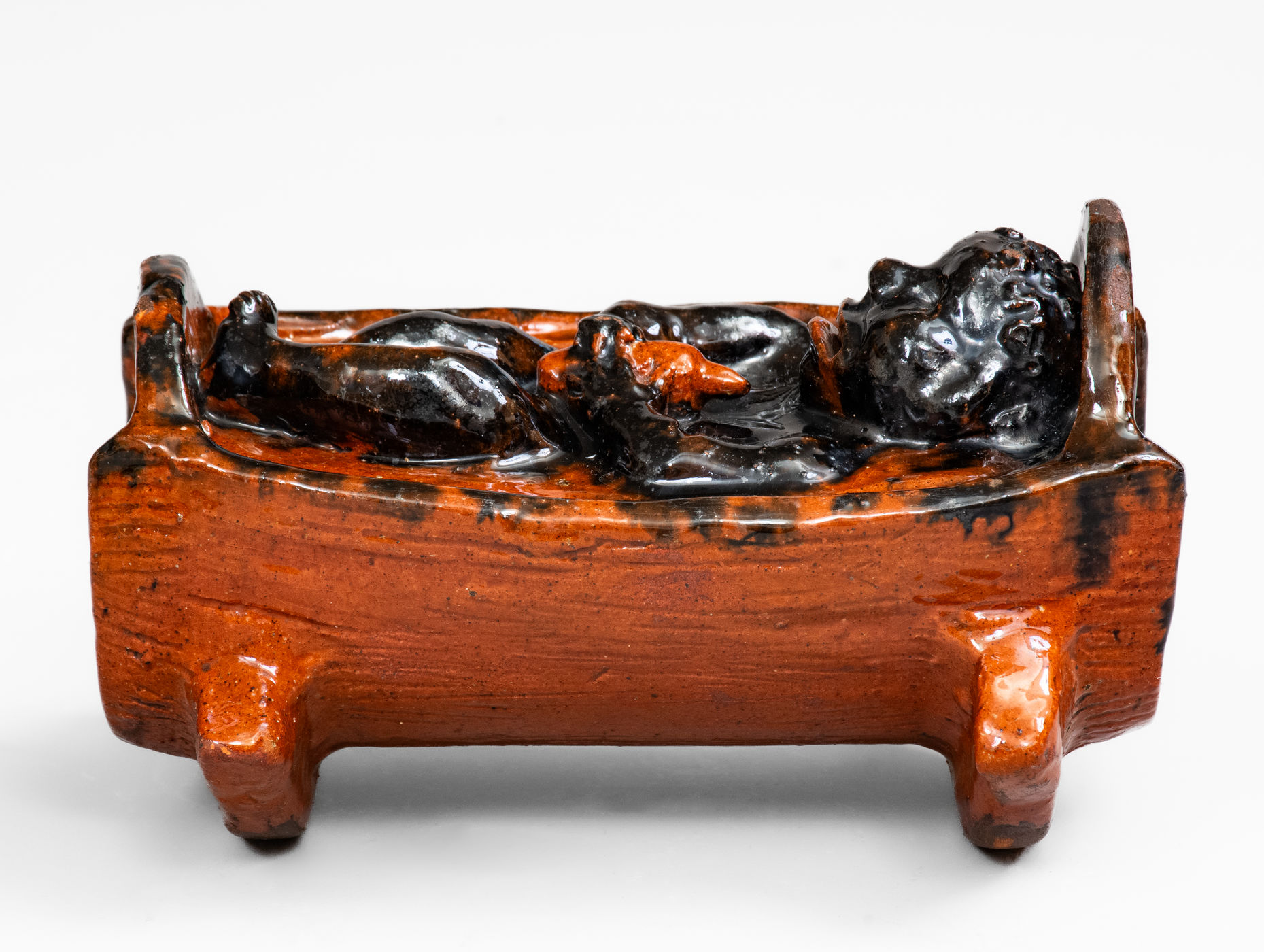 ×Rare and Important Figural Redware Baby-in-Cradle Bank, probably Pennsylvania