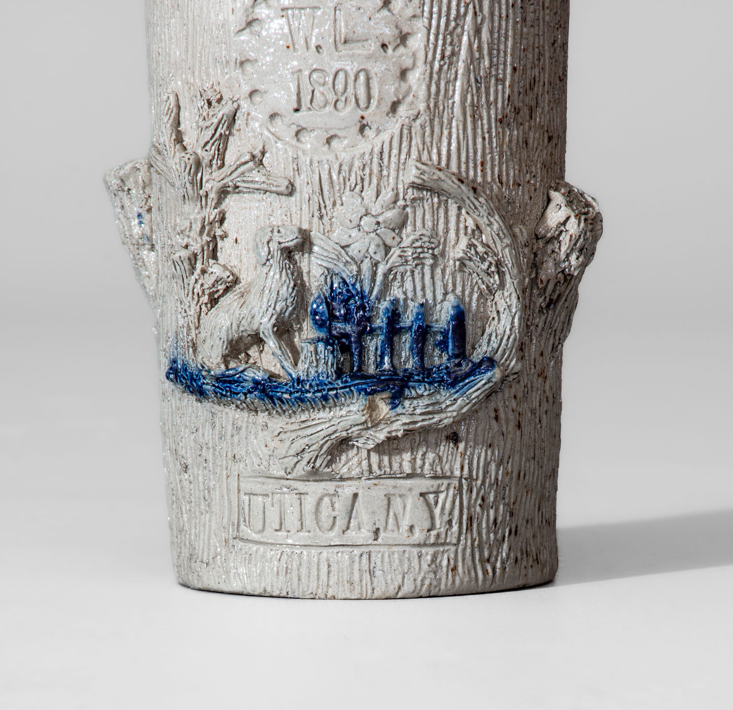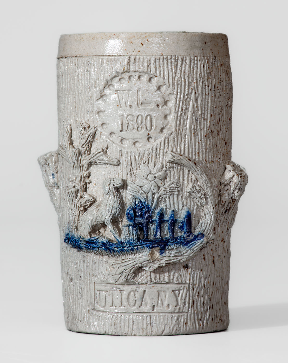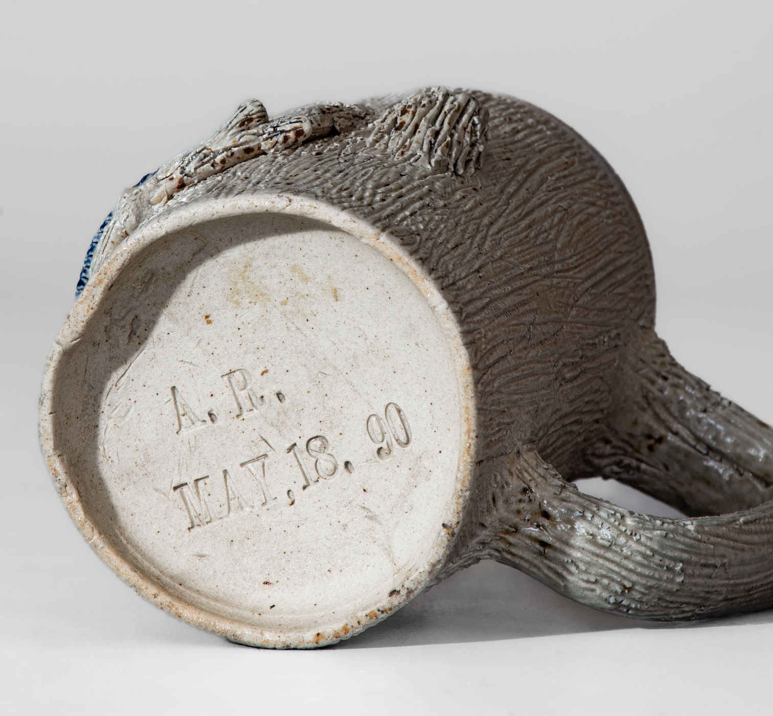 Exceptional Cobalt-Decorated Stoneware Presentation Mug with Applied Dog Scene, Stamped "W.L. / 1890 / UTICA, N.Y." and "A.R. / MAY 18, 90," Adam Richthammer at Central New York Pottery, Utica, NY, 1890, cylindrical form with twig-form handle and incised bark surface, the front decorated with a hand-modeled, applied, and incised design of a seated dog between a tree and stump, facing a fence with large flower. A curving branch extends from the wall of the vessel, framing the design. Two pieces of clay modeled and incised to resemble sawed limbs are applied to the sides of the mug. Impressed "W.L. / 1890" within a circular medallion featuring impressed dots at the border. Base impressed "UTICA, N.Y." within an incised border. Underside incised "A.R. / MAY, 18. 90." Salt-glazed surface with cobalt highlight to decoration. Albany-slip-glazed interior. Among the finest examples of late-period Utica stoneware that we have ever offered, this mug features a remarkably delicate design that is entirely hand-modeled and carefully incised, differing markedly from the molded relief motifs for which this pottery is known. A match safe with applied lamb by the same maker is illustrated in Scherer, Art for the People: Decorated Stoneware from the Weitsman Collection, p. 140. The match safe is impressed "WM. PFEIFER" and made for the infant son of Central New York Pottery potter, Henry Pfeifer, and, like the mug in this auction, is stamped with the initials, "A.R.," clearly referring to Adam Richthammer, a German-born potter who appears in period documents--including city directories and the 1900 federal census--as a potter in Utica. Richthammer immigrated to the United States in 1882 and obviously became an important part of the city's well-known stoneware craft. (See lot 409 in this auction for another example made for William Pfeifer.) Excellent, essentially as-made condition with a small glazed-over loss to branch at base of design. H 4 7/8".