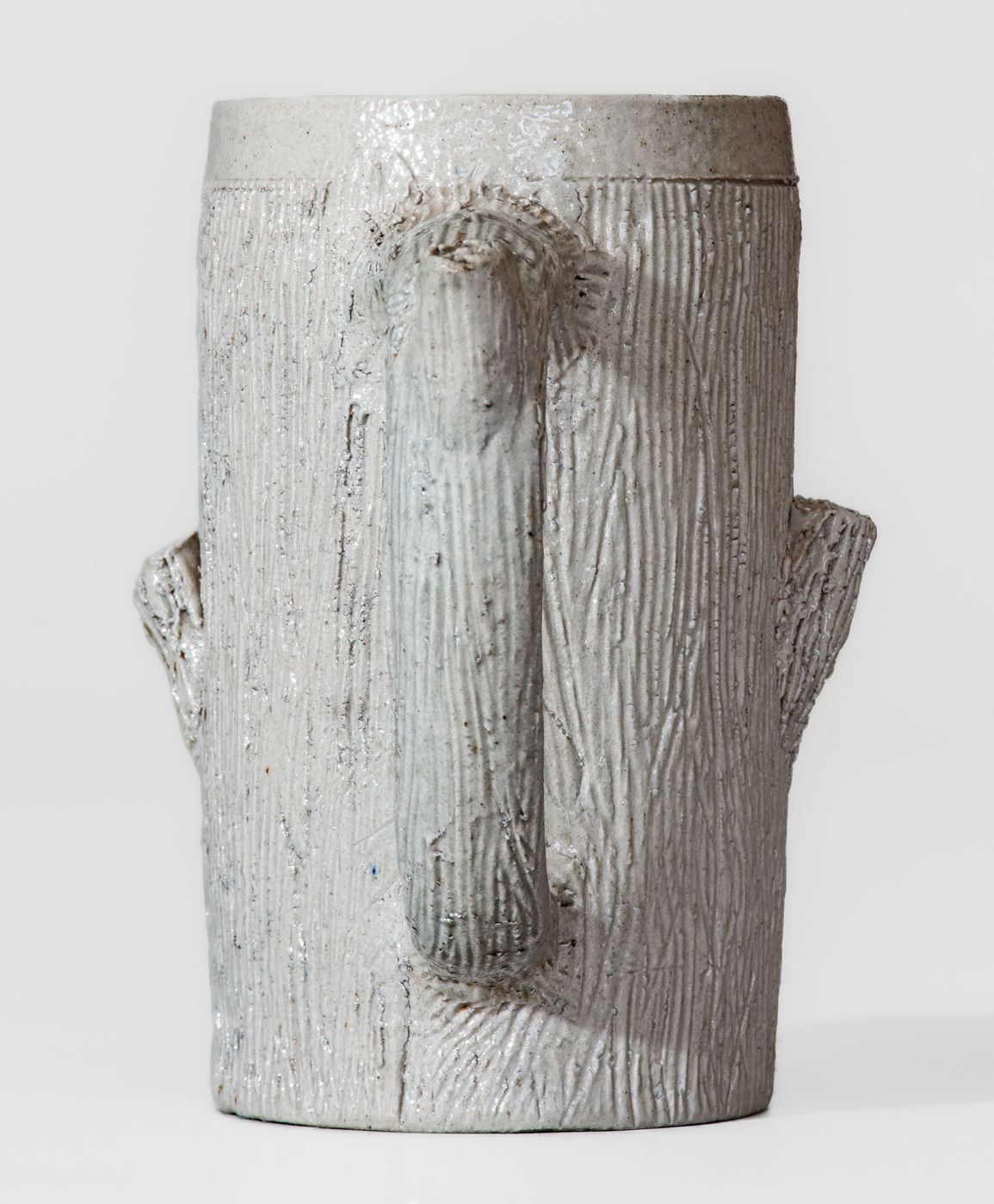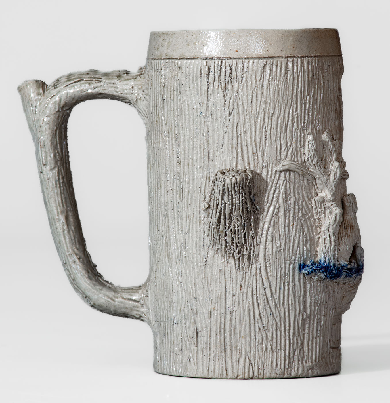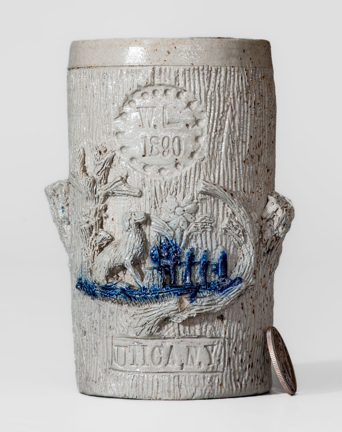 Exceptional Cobalt-Decorated Stoneware Presentation Mug with Applied Dog Scene, Stamped "W.L. / 1890 / UTICA, N.Y." and "A.R. / MAY 18, 90," Adam Richthammer at Central New York Pottery, Utica, NY, 1890, cylindrical form with twig-form handle and incised bark surface, the front decorated with a hand-modeled, applied, and incised design of a seated dog between a tree and stump, facing a fence with large flower. A curving branch extends from the wall of the vessel, framing the design. Two pieces of clay modeled and incised to resemble sawed limbs are applied to the sides of the mug. Impressed "W.L. / 1890" within a circular medallion featuring impressed dots at the border. Base impressed "UTICA, N.Y." within an incised border. Underside incised "A.R. / MAY, 18. 90." Salt-glazed surface with cobalt highlight to decoration. Albany-slip-glazed interior. Among the finest examples of late-period Utica stoneware that we have ever offered, this mug features a remarkably delicate design that is entirely hand-modeled and carefully incised, differing markedly from the molded relief motifs for which this pottery is known. A match safe with applied lamb by the same maker is illustrated in Scherer, Art for the People: Decorated Stoneware from the Weitsman Collection, p. 140. The match safe is impressed "WM. PFEIFER" and made for the infant son of Central New York Pottery potter, Henry Pfeifer, and, like the mug in this auction, is stamped with the initials, "A.R.," clearly referring to Adam Richthammer, a German-born potter who appears in period documents--including city directories and the 1900 federal census--as a potter in Utica. Richthammer immigrated to the United States in 1882 and obviously became an important part of the city's well-known stoneware craft. (See lot 409 in this auction for another example made for William Pfeifer.) Excellent, essentially as-made condition with a small glazed-over loss to branch at base of design. H 4 7/8".