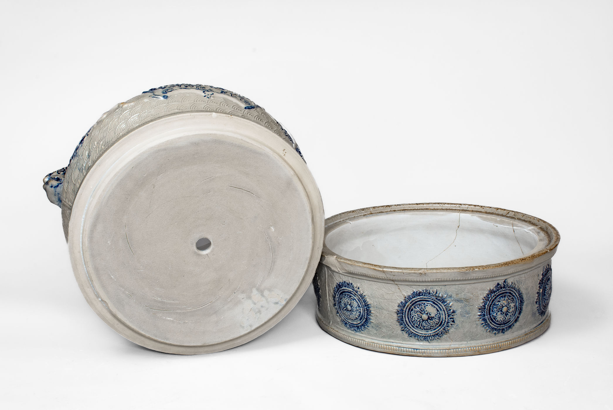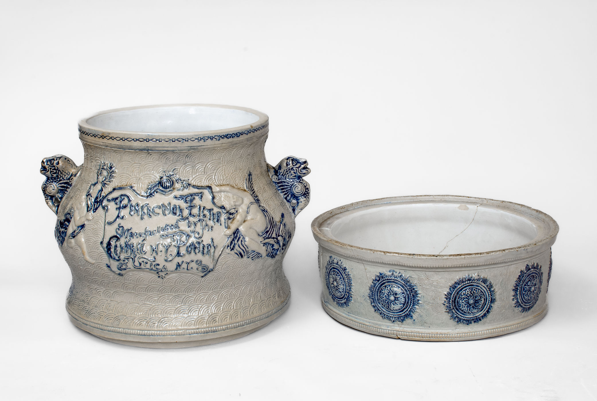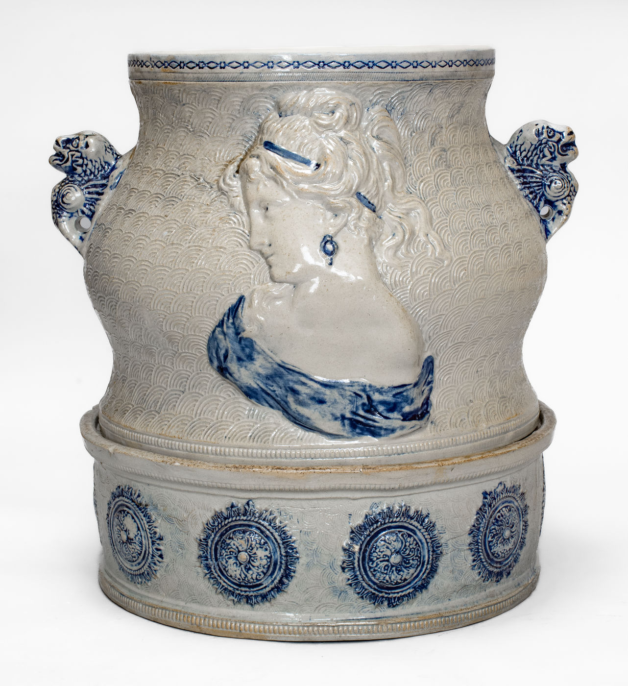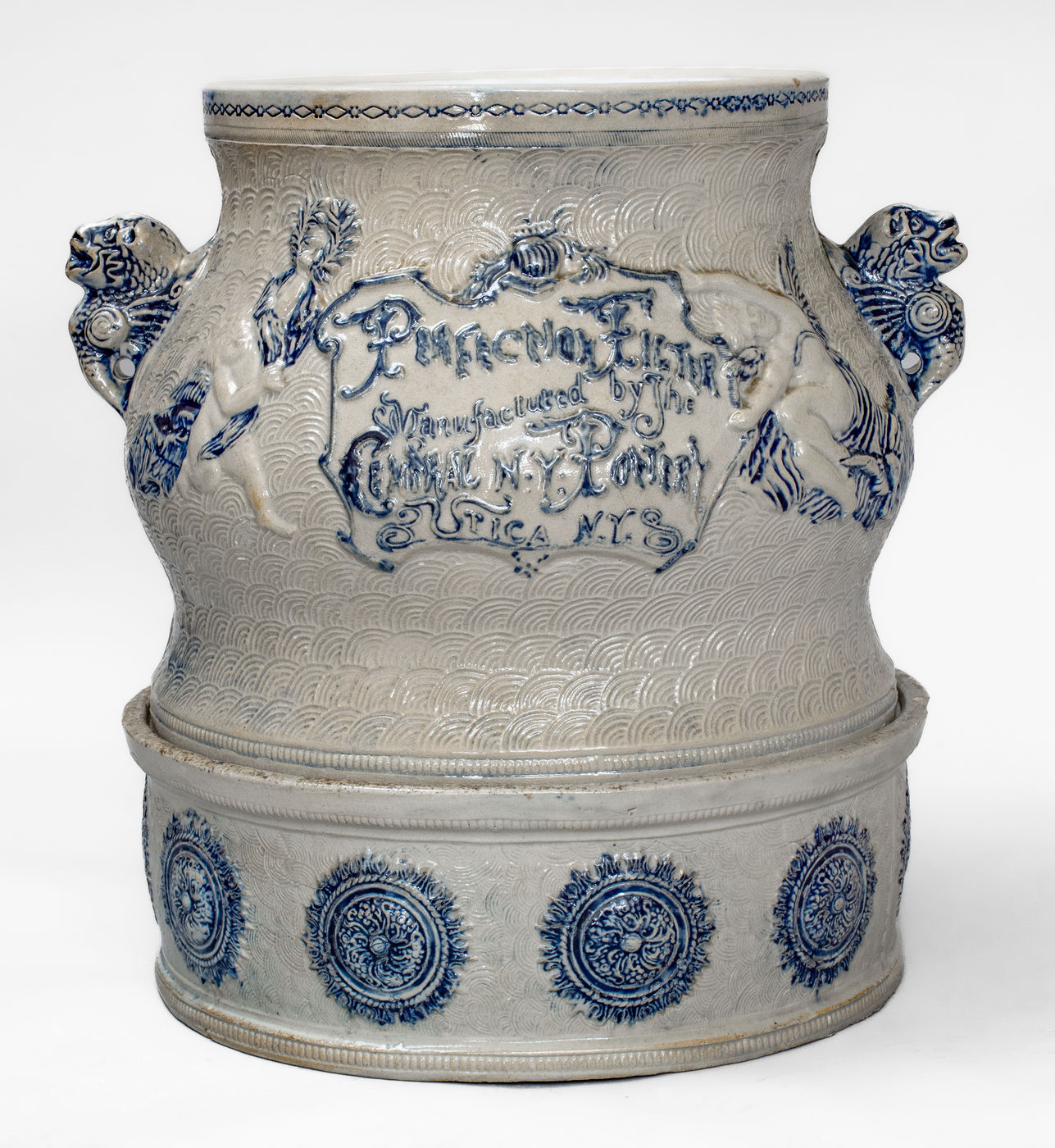 Two-Piece Molded Stoneware Water Cooler, Marked "PERFECTION FILTER / Manufactured by The / CENTRAL N.Y. Pottery / UTICA N.Y.," late 19th century, curvaceous form with winged sea serpent handles and original drain hole in underside, decorated on the front with two cherubs holding a banner, inscribed "PERFECTION FILTER / Manufactured by The / CENTRAL N.Y. Pottery / UTICA N.Y.." Reverse with relief bust of a woman with headband and earring. Separate base decorated with relief floral medallions. Bristol-slip-glazed surface with cobalt highlights throughout. Cooler in very nice condition with a 1" post-firing base chip, a few other small base chips, mostly in-the-firing, a short vertical line at base, and in-the-firing fissures in underside, not visible on interior. Base with large section reglued, a large Y-shaped crack from rim, a 2 1/4" chip to its rim, and other small chips. H 15".