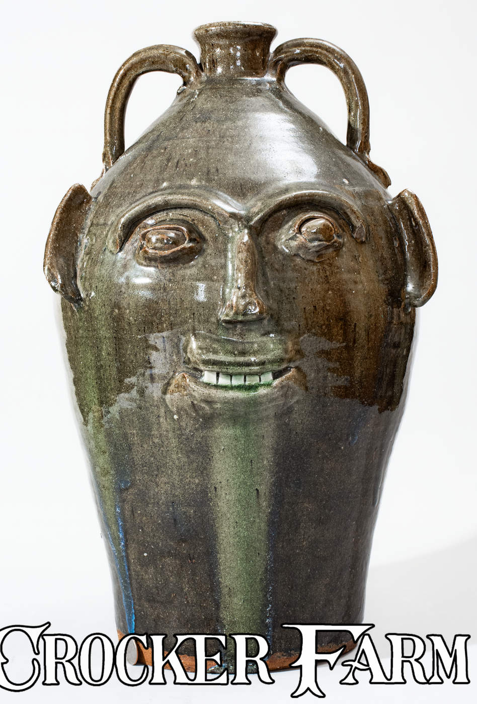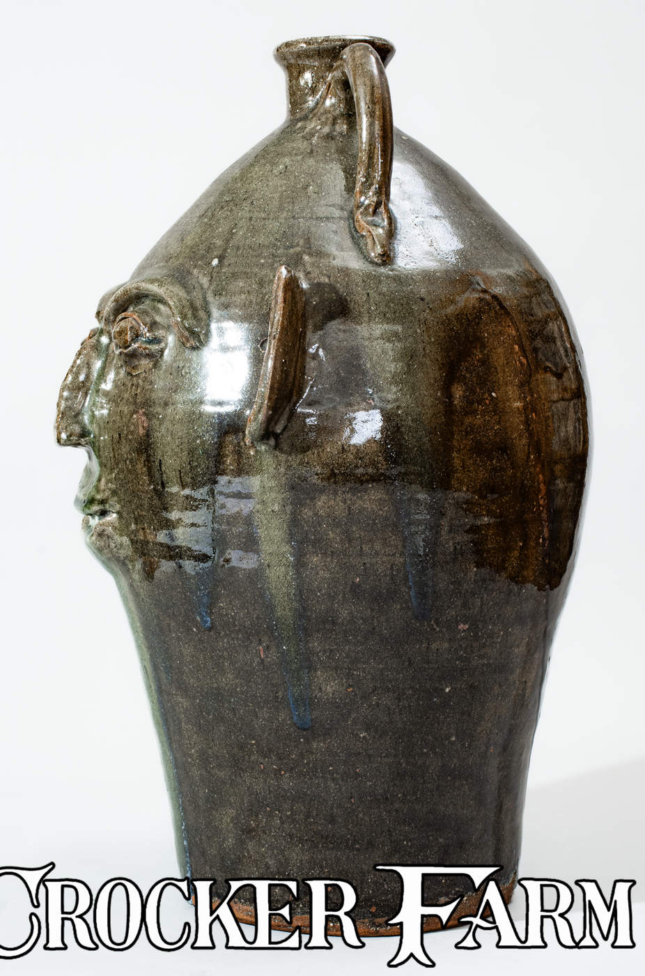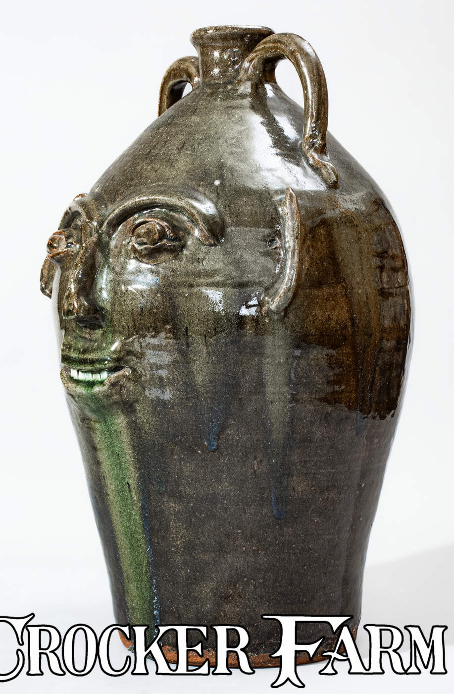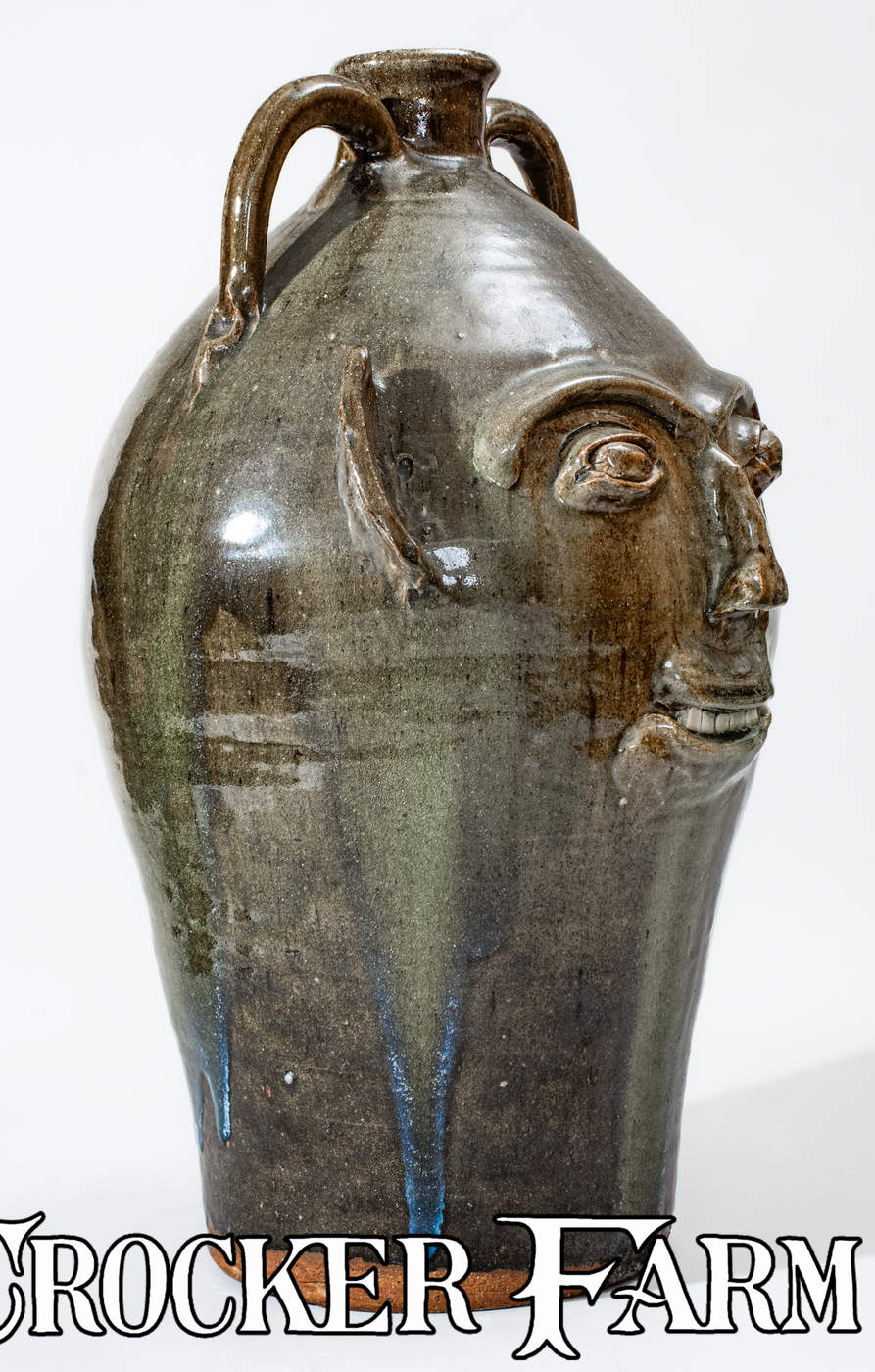 Monumental Alkaline-Glazed Stoneware Face Jug, Stamped "B.B. CRAIG / VALE, N.C.," 1979, ovoid jug with flared spout and two rounded vertical handles, decorated with a hand-modeled and applied clay face featuring bulging eyes with eyebrows, curved ears, nose with pierced nostrils, and smiling mouth with china teeth. Surface covered in a mottled green alkaline glaze with heavy glass runs including traces of rutile. Underside impressed with Burlon Craig maker's mark. Exceptional size. Provenance: Underside includes a printed label, reading, "G. Hale bought this / 23" high B.B. Craig- / signed grotesque-face / jug from E.E. Mallar , Jr. / (residing in Raleigh, N.C.) / on Nov. 13, 1979. E.E. Mallar, / Jr. was told by B.B. Craig / that this is one of only / two or three of the largest / grotesque-face jugs he (B.B. / Craig) has made and will make. Excellent, essentially as-made condition. H 23".