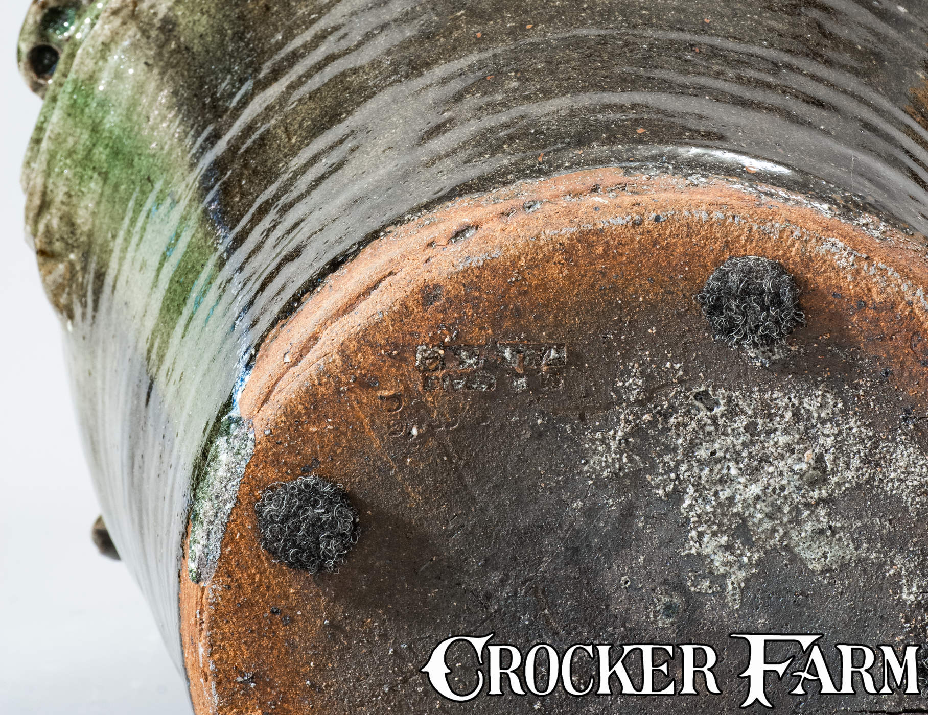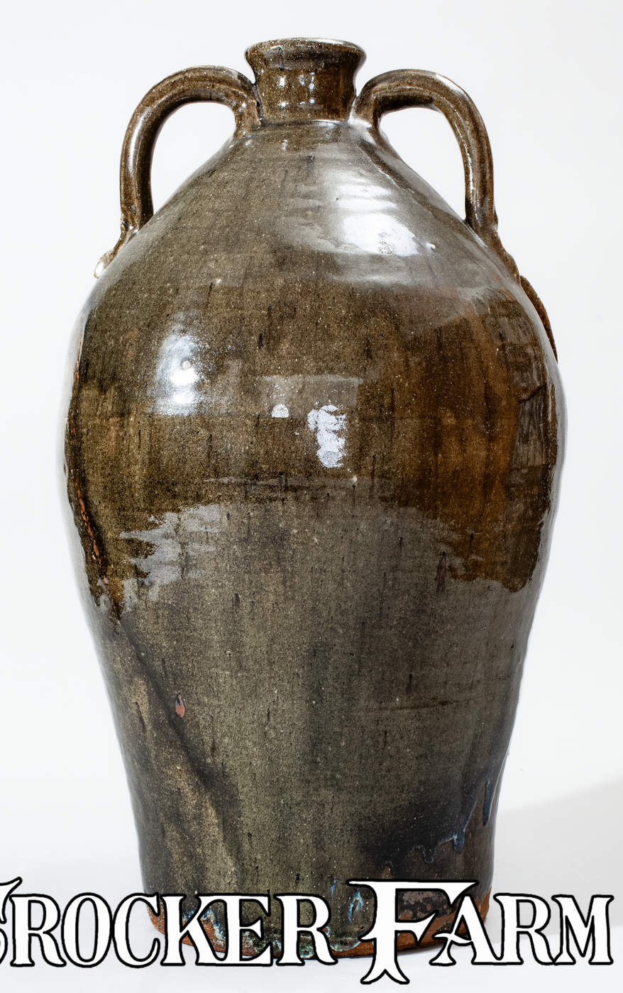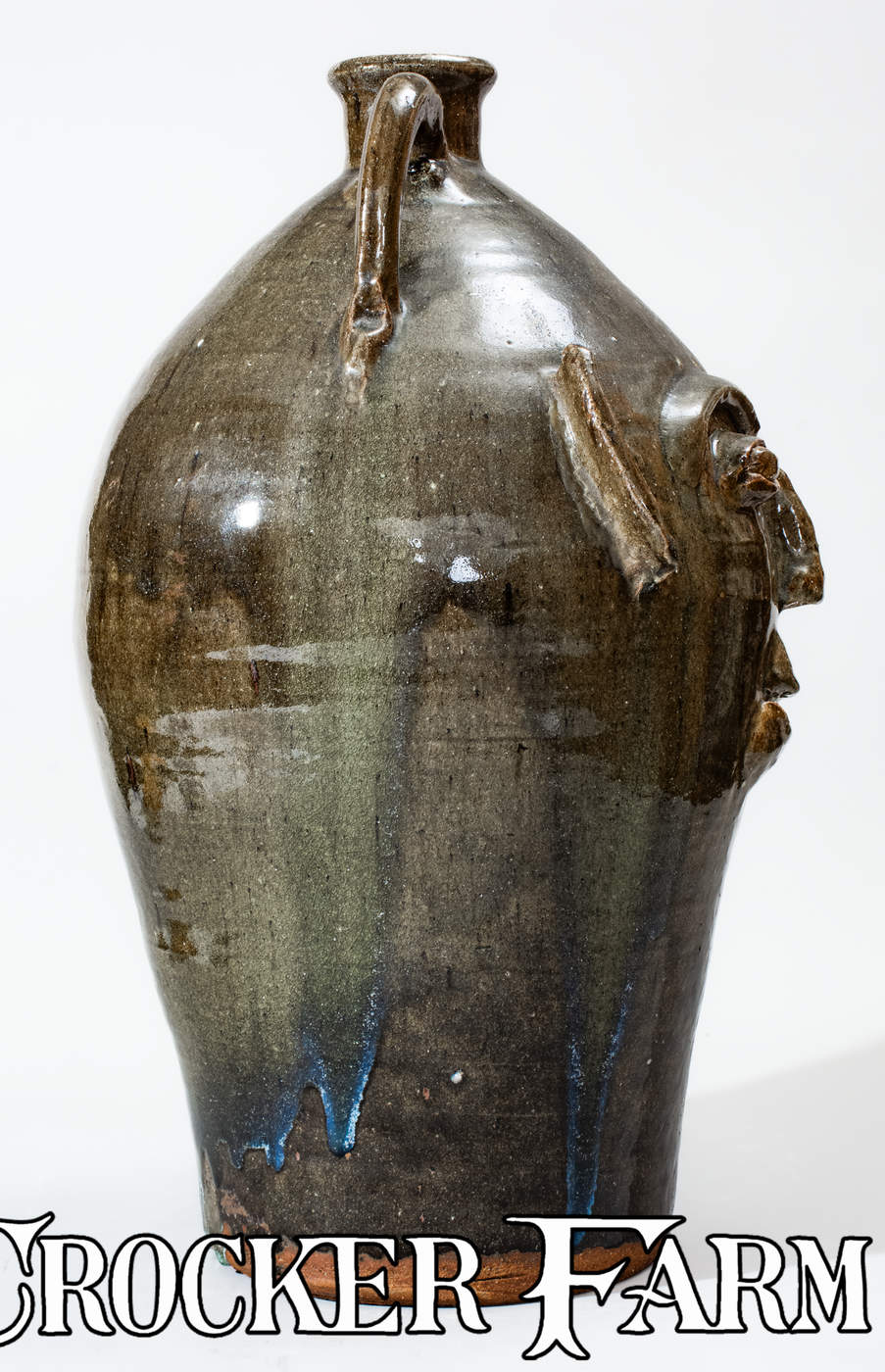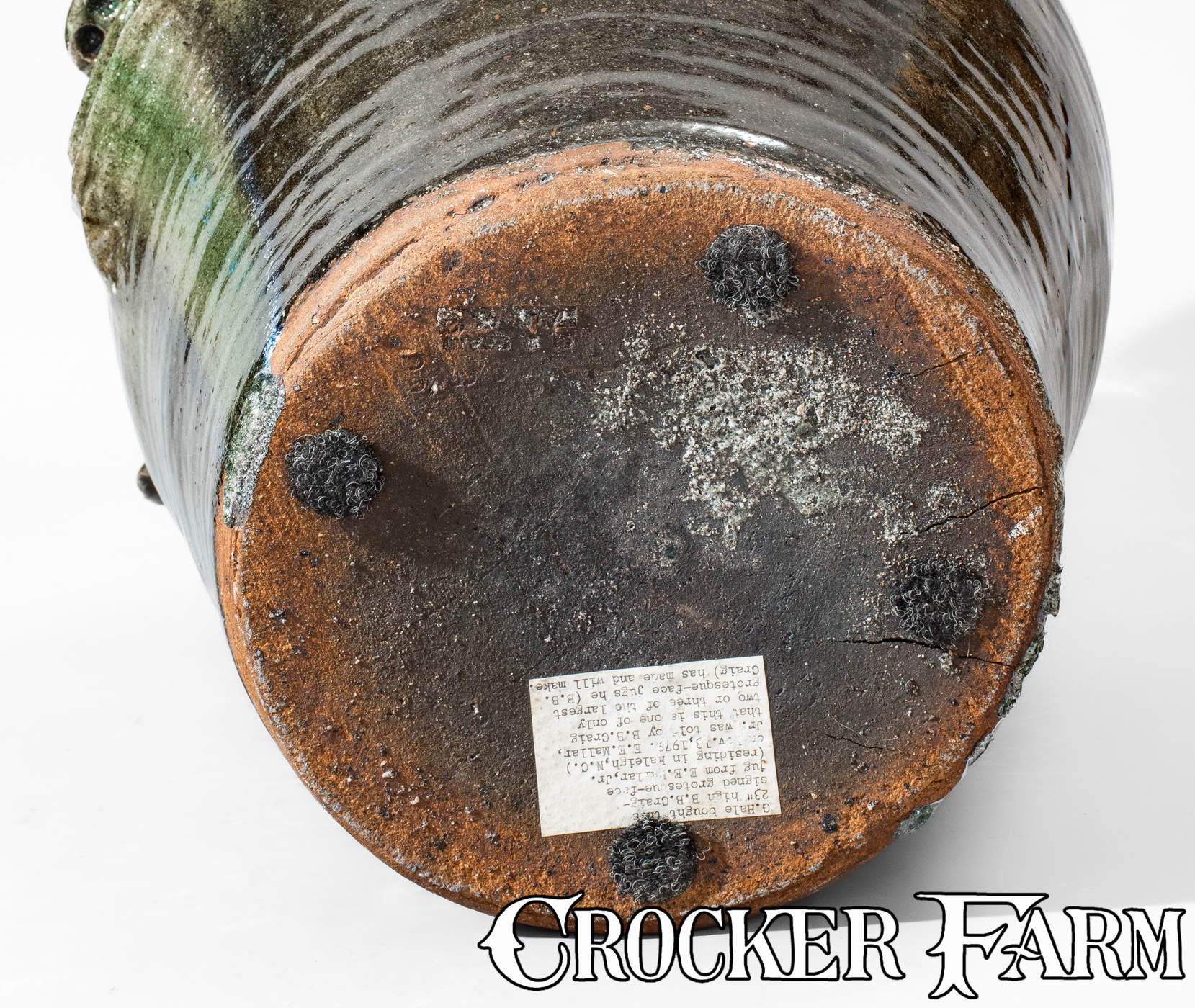 Monumental Alkaline-Glazed Stoneware Face Jug, Stamped "B.B. CRAIG / VALE, N.C.," 1979, ovoid jug with flared spout and two rounded vertical handles, decorated with a hand-modeled and applied clay face featuring bulging eyes with eyebrows, curved ears, nose with pierced nostrils, and smiling mouth with china teeth. Surface covered in a mottled green alkaline glaze with heavy glass runs including traces of rutile. Underside impressed with Burlon Craig maker's mark. Exceptional size. Provenance: Underside includes a printed label, reading, "G. Hale bought this / 23" high B.B. Craig- / signed grotesque-face / jug from E.E. Mallar , Jr. / (residing in Raleigh, N.C.) / on Nov. 13, 1979. E.E. Mallar, / Jr. was told by B.B. Craig / that this is one of only / two or three of the largest / grotesque-face jugs he (B.B. / Craig) has made and will make. Excellent, essentially as-made condition. H 23".