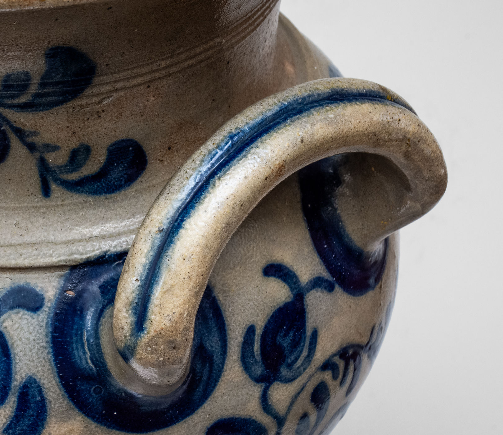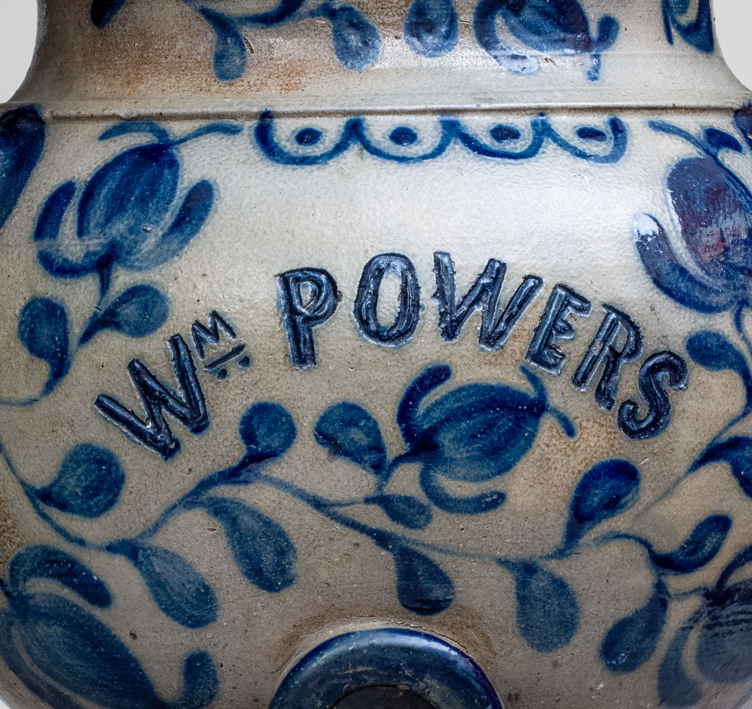 Highly Important Stoneware Pedestal-Based Presentation Water Cooler with Profuse Freehand Cobalt Decoration, Inscribed "WM. POWERS" and "J.H.," Stamped "J. HAMILTON / BEAVER," PA origin, circa 1845, extravagantly-potted form with ovoid body, tall flaring collar, extruded open handles, and applied tubular bunghole, resting on a flaring pedestal base with raised turnings and rounded foot. The cooler is lavishly brush-decorated with undulating fuchsia vines across the front, extending around each side. Front incised with the large cobalt-highlighted name, "Wm.. POWERS," below a spotted drape motif. Collar decorated with an additional large fuchsia vine. The cooler's individually-thrown applied pedestal base is decorated with a looping vine above a series of undulating vines. Foot decorated completely around with a series conjoined leaves. Reverse decorated with the freehand initials, "J.H.," the signature of potter, James Hamilton, within a looping vine border, below the potter's impressed maker's mark. Brushed cobalt forms an oval line accenting the extrusion of the handles, circular highlights surround the handle terminals, and a cobalt band covers the front of the bunghole. Among the most important and decorative examples of Western Pennsylvania stoneware to come to auction in decades, this work presents a young James Hamilton at his very best. The cooler's coveted pedestal-based form is amplified by an over-the-top beverage urn shape, uncharacteristic of the regional style, which showcases Hamilton's artistic abilities. William H. Powers appears in an 1849 local tax record as an innkeeper in the town of Beaver, and it is highly probable that this object was fashioned by Hamilton as a beverage dispenser for Powers' inn. The potter evidently took a level of pride in this work by inscribing his initials boldly on the reverse, a highly unusual treatment. The elaborate fuchsia vine motifs and drape motifs are traits that Hamilton would take with him to Greensboro, Pennsylvania circa 1850 and use for the next twenty-five years, influencing the work of other potters throughout the region. This cooler's extraordinary form and stunning decoration define it as the finest surviving example of Beaver, Pennsylvania stoneware and a masterwork by one of Western Pennsylvania's most famous and skilled potters. Provenance: A fresh-to-the-market example, which recently surfaced in the Midwestern U.S. Exceptional condition for an often-damaged form. A thin, approximately 5 1/4" diagonal crack to pedestal base on proper left side of vessel. Chips to interior edge of underside, only visible when cooler is turned over. Minor chips to interior of rim. Traces of old yellow paint to interior and minor traces of old paint to handles, unrelated to any sort of restoration. H 19 7/8".