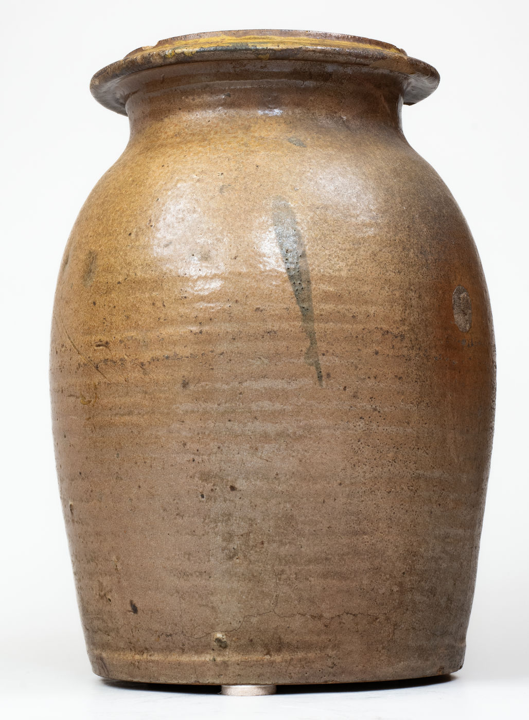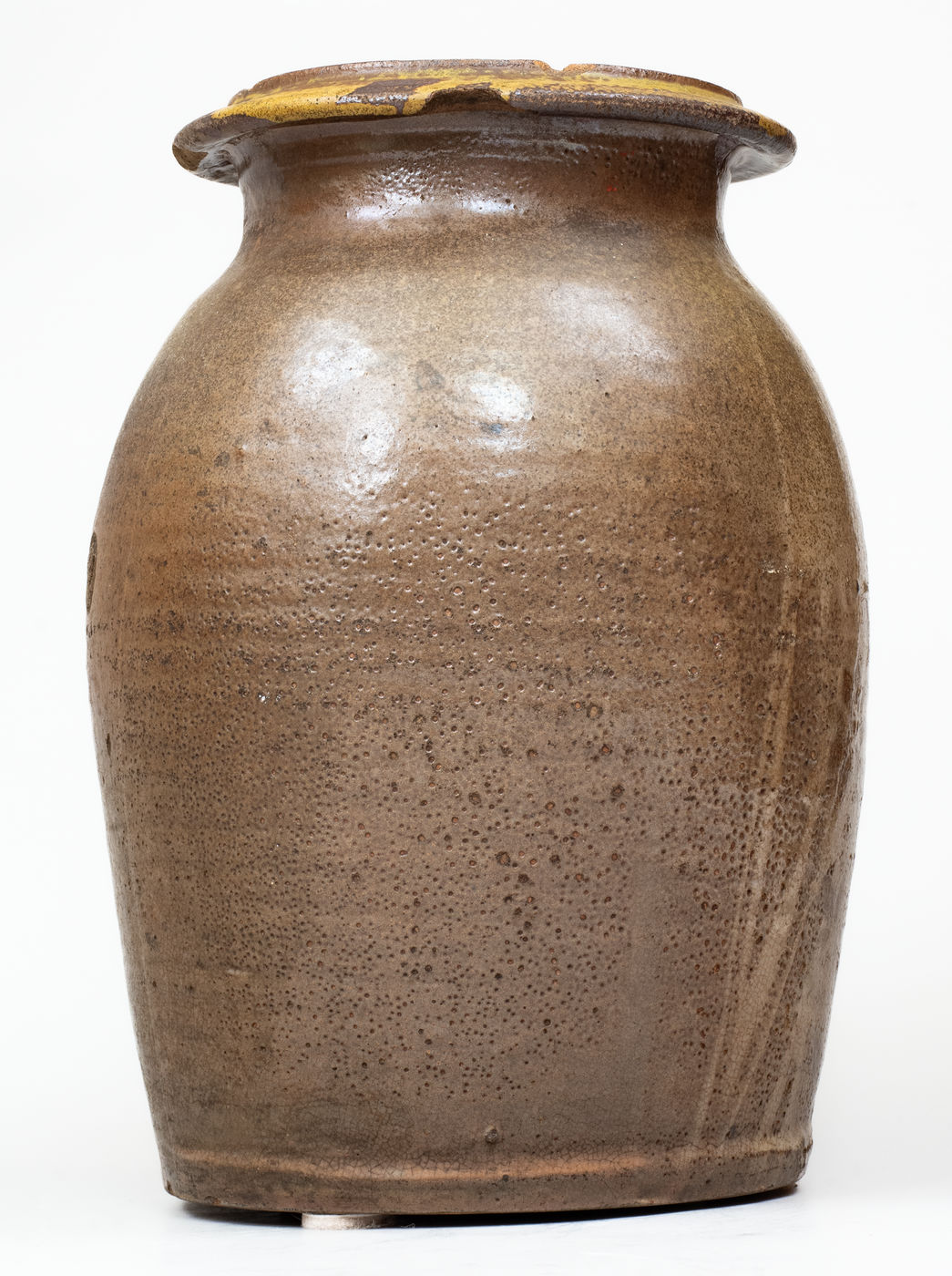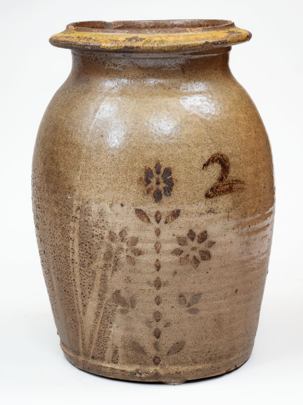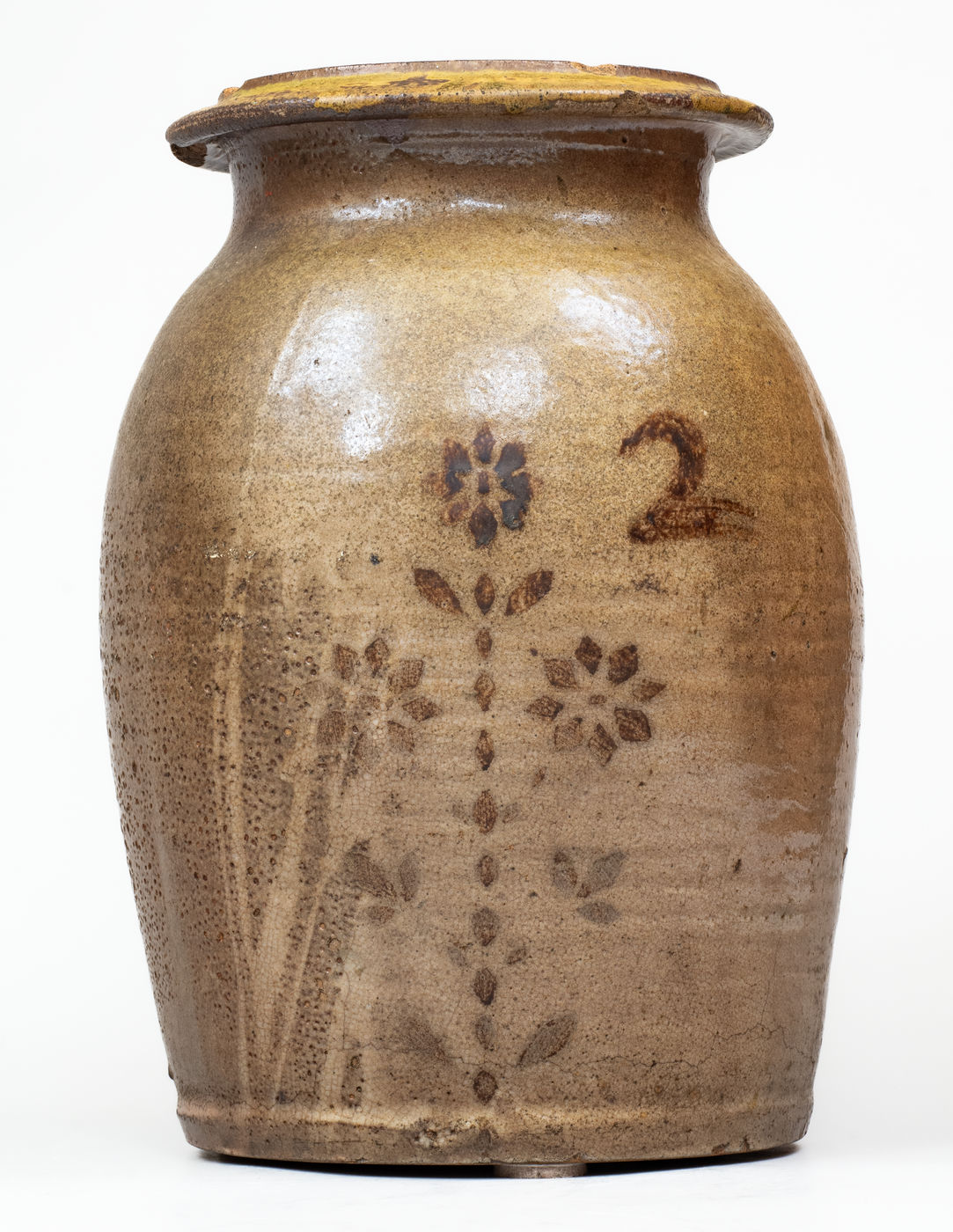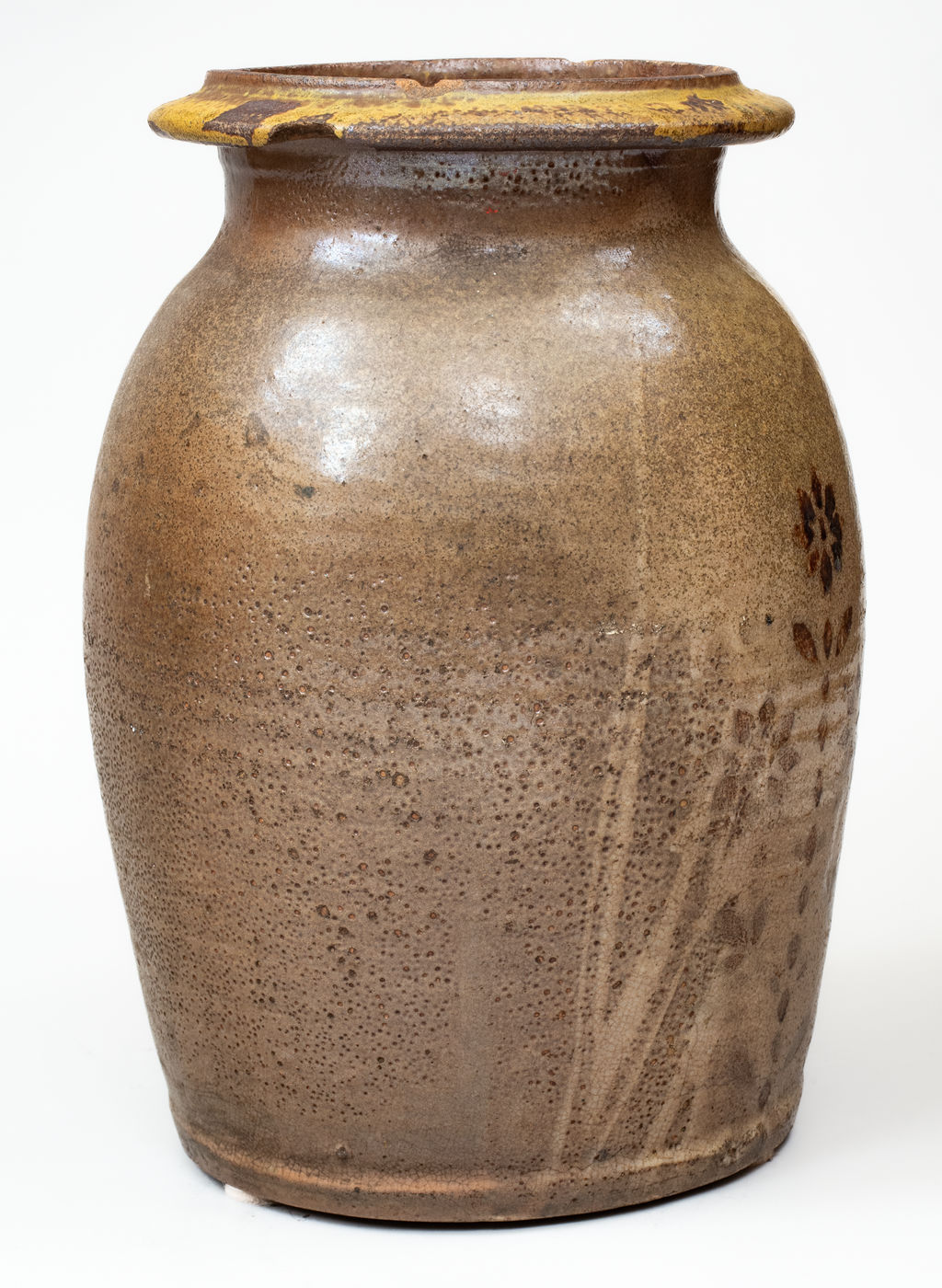 ×Attrib. Whelchel Family, Gaffney, SC Stoneware Jar w/ Brown Slip Floral Decoration,