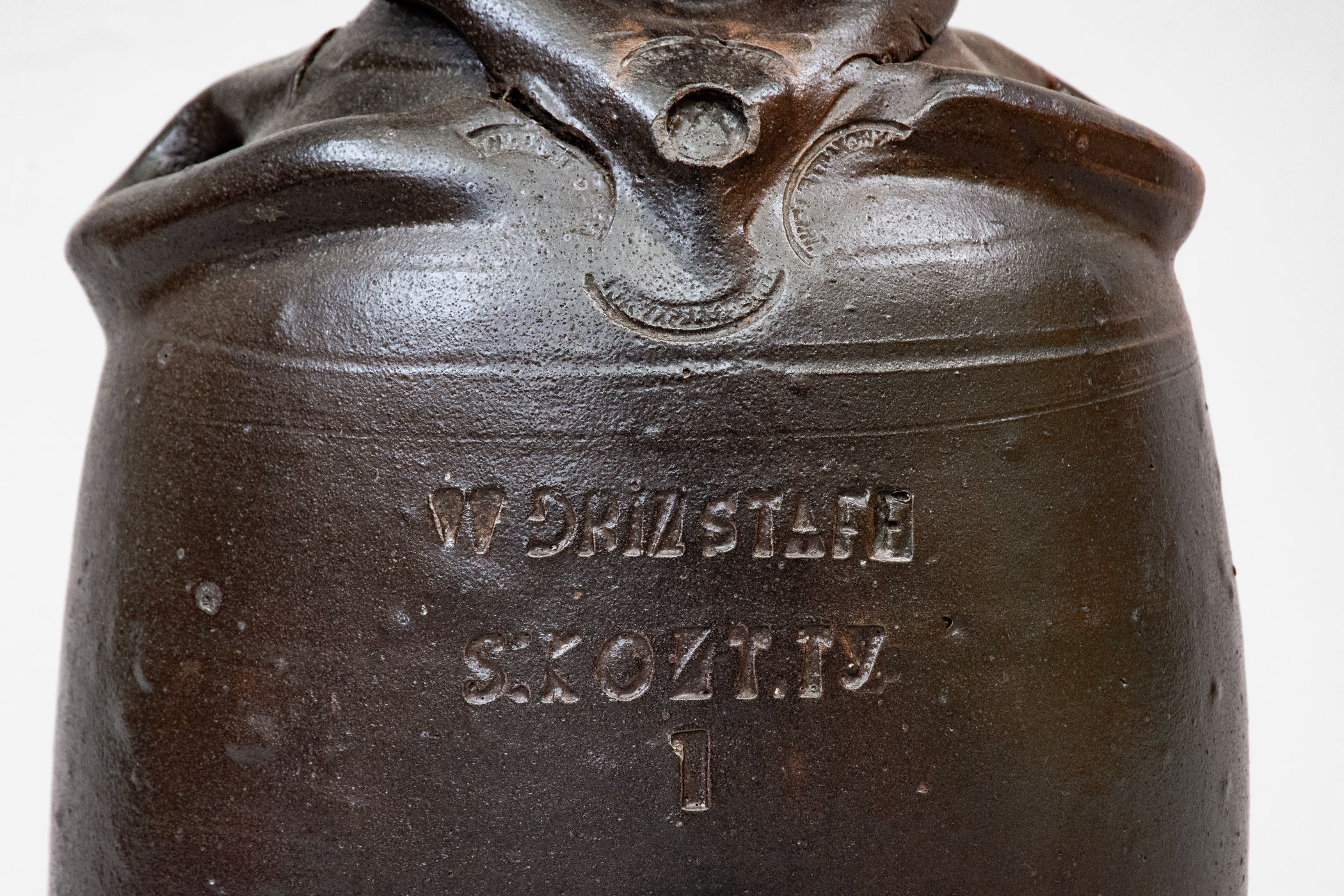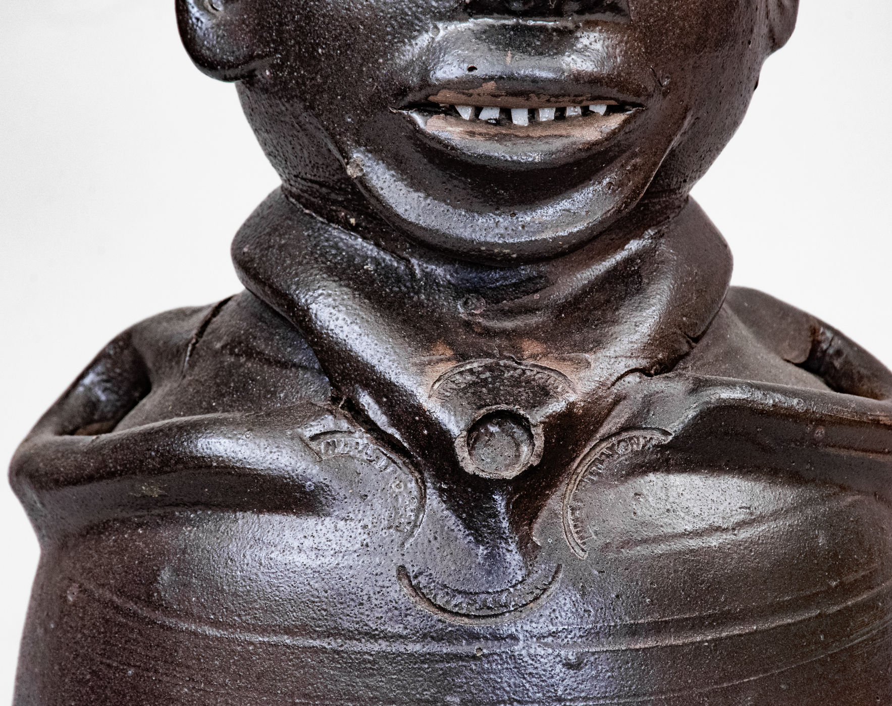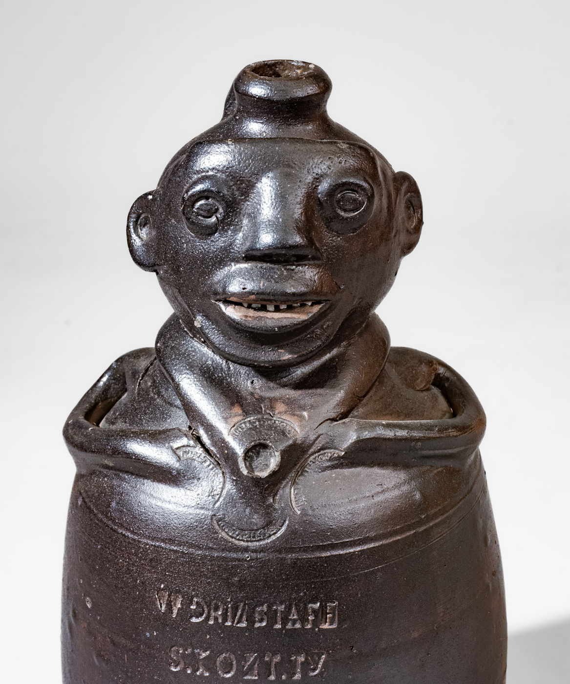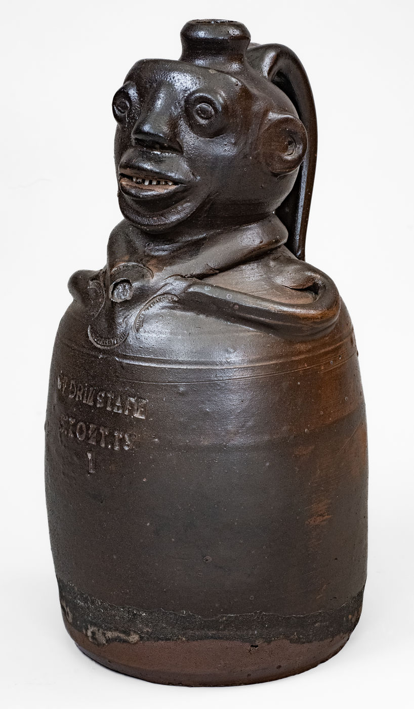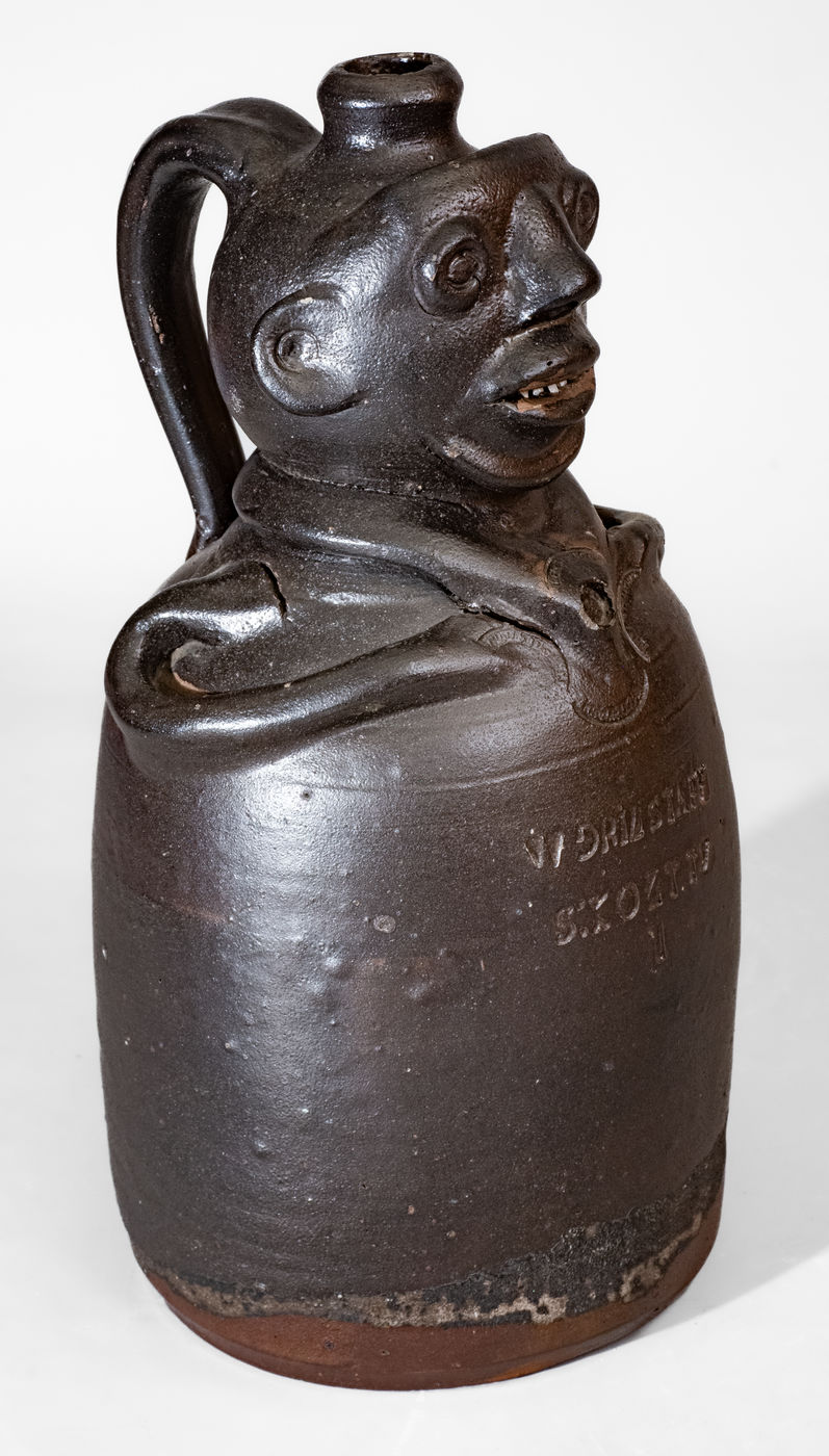 Important and Probably Unique Glazed Stoneware Figural Jug, Stamped "W GRINSTAFF / S:KONT.TY" and "KNOXVILLE TENN." Four Times, Grindstaff Pottery, Knoxville, TN, circa 1885-1895, wheel-thrown vessel creating a human form with semi-ovoid body, rounded head with semi-rounded spout above, and large strap handle on reverse, the head with hand-modeled and applied facial features including a pronounced, flattened forehead with raised and impressed eyes, circular ears with incised details, nose with carved nostrils, open mouth with small applied broken-china teeth, and broad chin. Body of vessel accented with two incised lines, the figure's neck featuring an applied jacket collar with impressed circular detail at center, flanked by four curved stamps, reading "KNOXVILLE TENN." Stylized arms curve around the vessel's sides to the front, meeting at the collar. Impressed at midsection with the maker's mark, "W GRINSTAFF / S:KONTY.TY." followed by the number, "1." Surface covered in a thick, dark-brown slip with light overlying salt glaze. One of the cornerstones of Wahler's collection, this face vessel is distinguished by its strong folk art appeal, large size, and extremely rare maker's mark. Attesting to the object's exceptional rarity, Wahler states, "This is the only known Grindstaff figural, however, a sherd containing these two stamps ["W GRINSTAFF" and "S:KONT.TY"] has been found." Among the most famous examples of Tennessee pottery in existence, this work has several pages of illustration dedicated to it in Wahler's Tennessee Turned, including the back cover. Exhibited: Arts of Tennessee, Frist Center for the Visual Arts, September 13, 2003 - January 18, 2004; Exhibited: Tennessee Turned, Earthenware and Stoneware Made in East Tennessee 1800-1900, Museum of East Tennessee History, May 16-October 30, 2011. Literature: Illustrated in Wahler, Tennessee Turned, Earthenware and Stoneware Made in East Tennessee 1800-1900, Part One, p. 94, p. 96, p. 97, p. 122, pl. 20, p. 230, pl. 20, p. 207, fig. 99, and back cover. Provenance: Wahler states that the jug "descended in the Sullivan Saloon owners family. . . Jane Mays suggests the 'S' may stand for Sullivan." This jug survives in rarely-found excellent condition with minor wear to spout, some light chipping to circular impression at center of jacket collar, and a few in-the-firing fissures at arms. H 14 1/2".