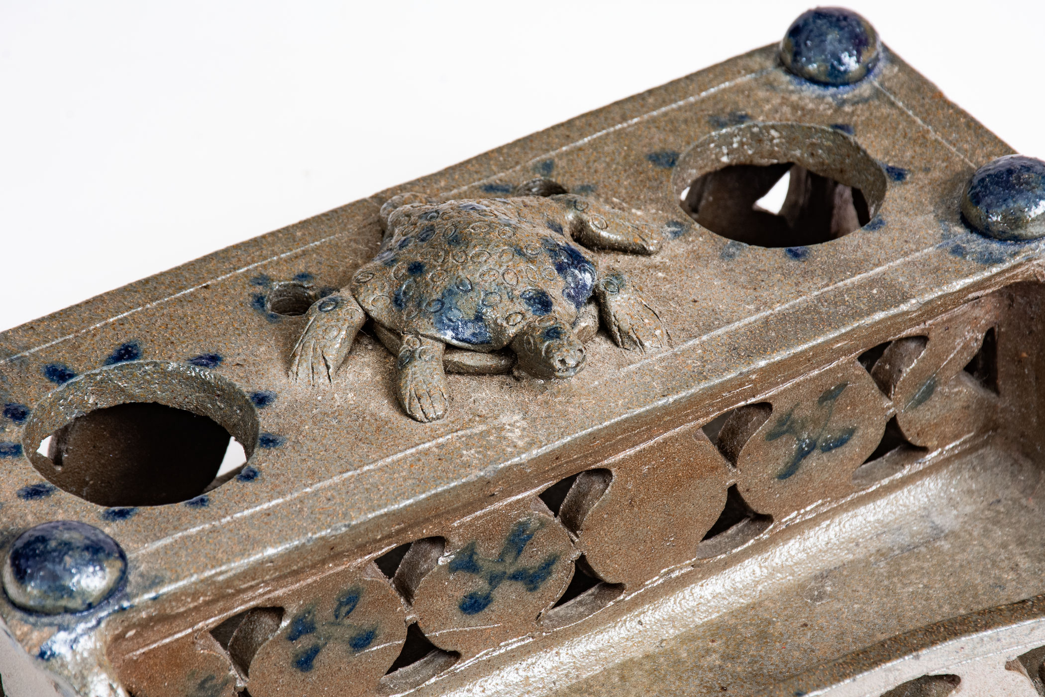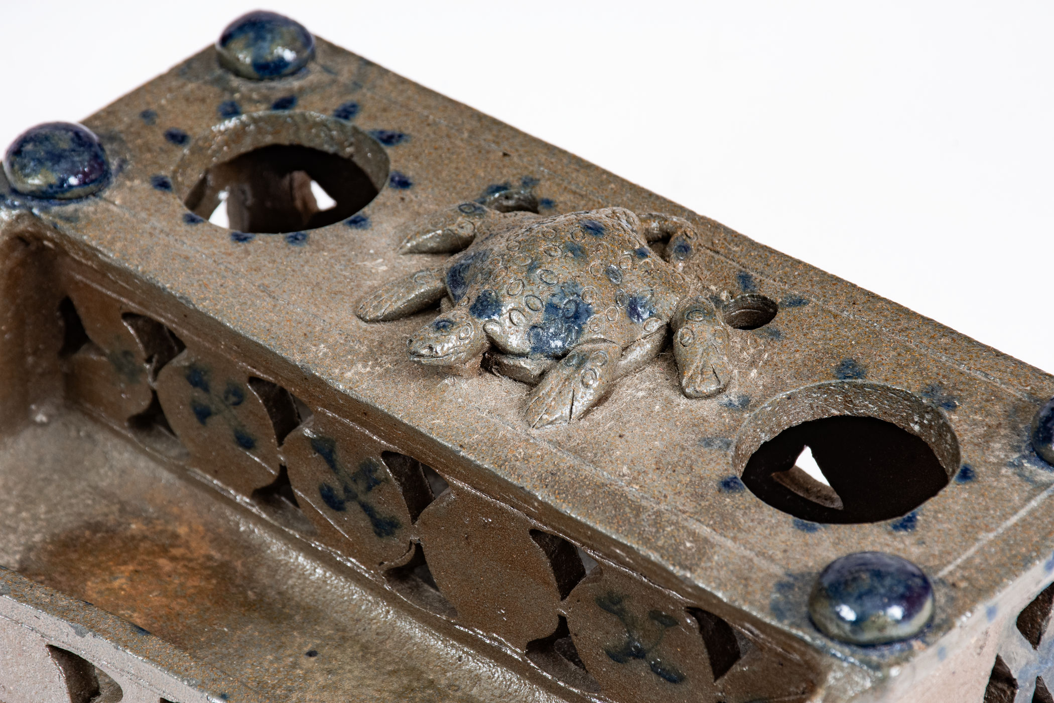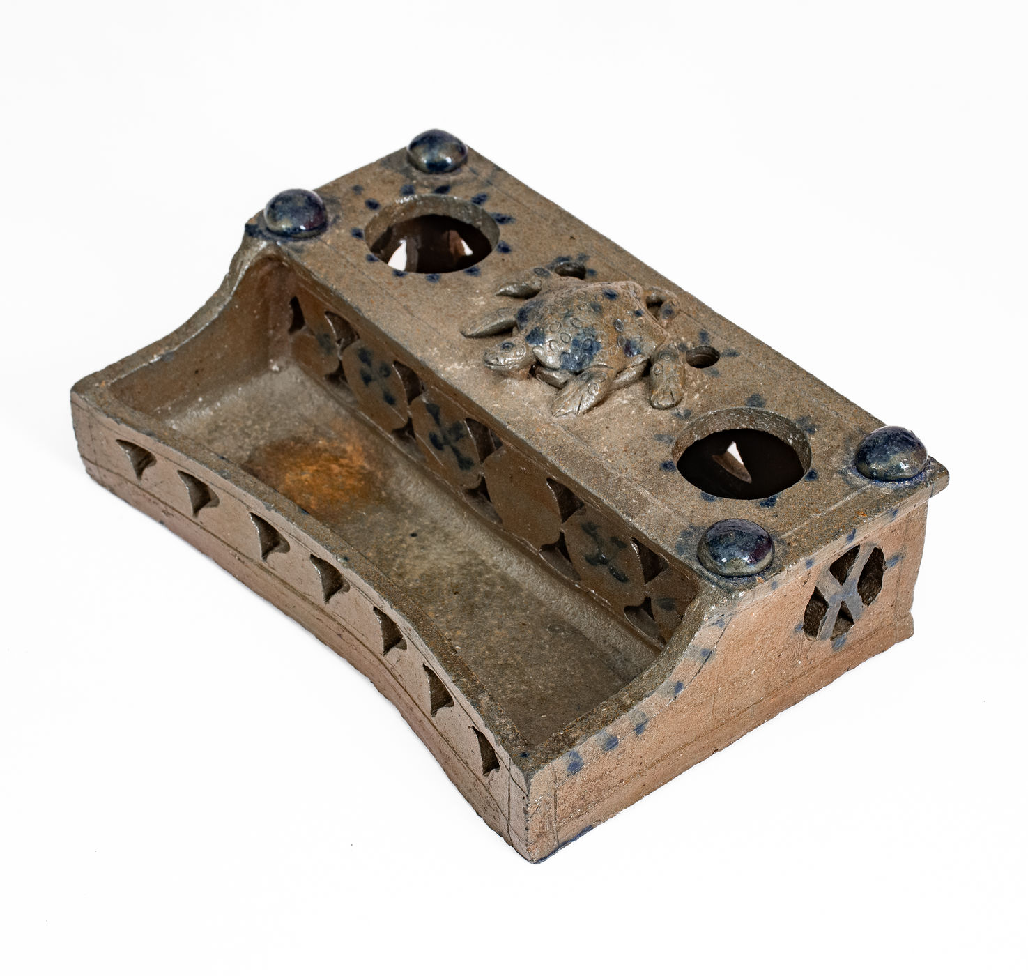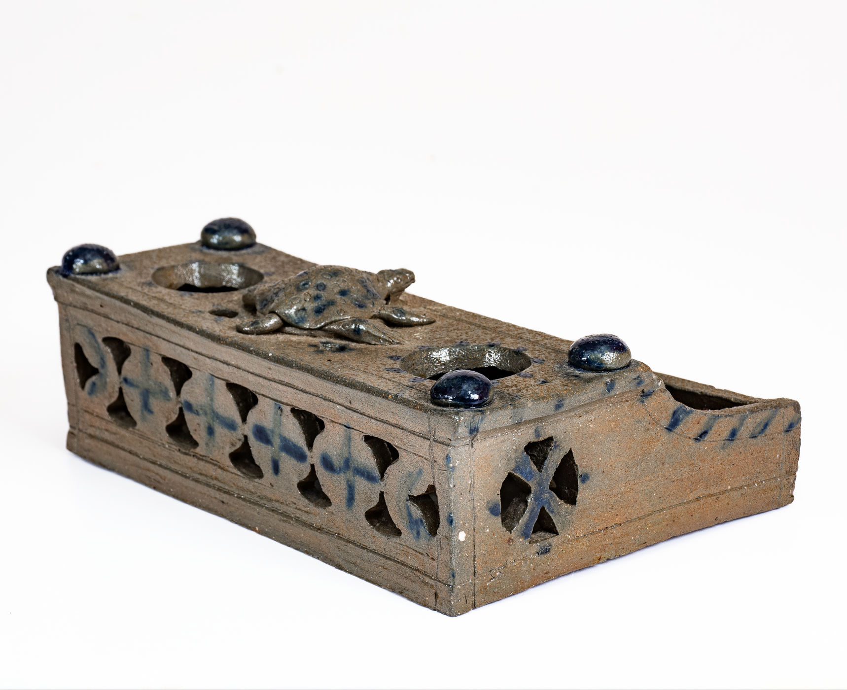 Important and Probably Unique Cobalt-Decorated Stoneware Inkstand with Turtle Finial, attributed to the Decker Pottery, Washington County, TN, circa 1872-1910, slab-built form with elaborate pierced-work decoration to the front, reverse, sides, and pen tray, the top surmounted by four balls of clay and a central hand-modeled figure of a turtle with impressed oval decoration and incised details to face and feet. Brushed X-shaped decoration to front of stand, crosses to reverse ,and highlights the pierced X-shaped motifs on the sides of the stand. Top of stand decorated with cobalt highlights to the turtle, ball finials, and dashes surrounding the circular openings for the well and sander and two smaller openings for pens behind the turtle. Additional dashed decoration spans the left and right upper edges of the stand. Surface covered in a clear salt glaze. Extremely few Southern ceramic inkstands (either stoneware or redware) from this time period or earlier are known. This example transcends the stoneware genre with its wonderful applied turtle decoration, a treatment essentially unheard of outside of Illinois's Anna Pottery and related Midwestern stoneware. One of the definitive works by Tennessee's most famous producer of stoneware. Exhibited: Handed Down, 1986. Provenance: Wahler states the following about the inkstand in her notes: "Beverly Burbage [the leading early Decker pottery collector] owned it in '86. He did not want to lend it in '96 as the family 'was making noises about getting it back.' . . . Later bought it. . . from Don Walters. :) a long story." Missing well and sander, typical for this form. Otherwise excellent condition. L 7 1/2" ; W 4 7/8" ; H 2 1/4".