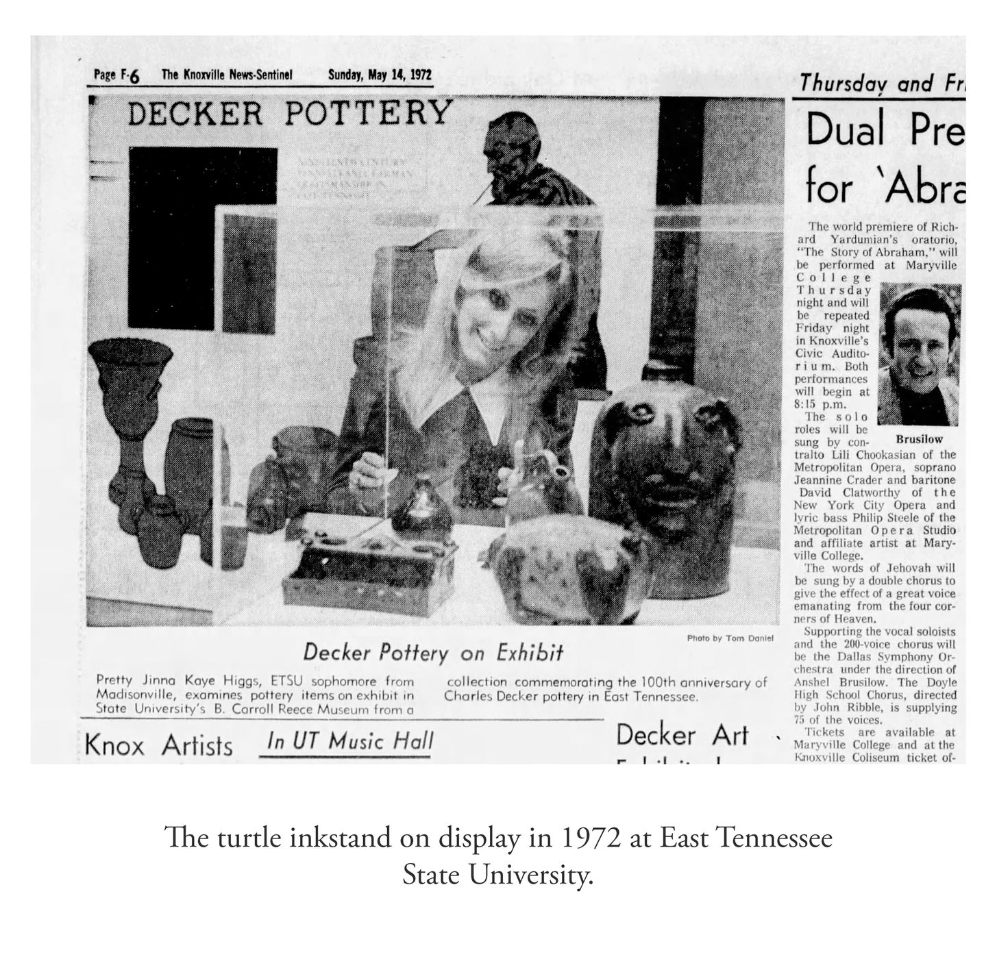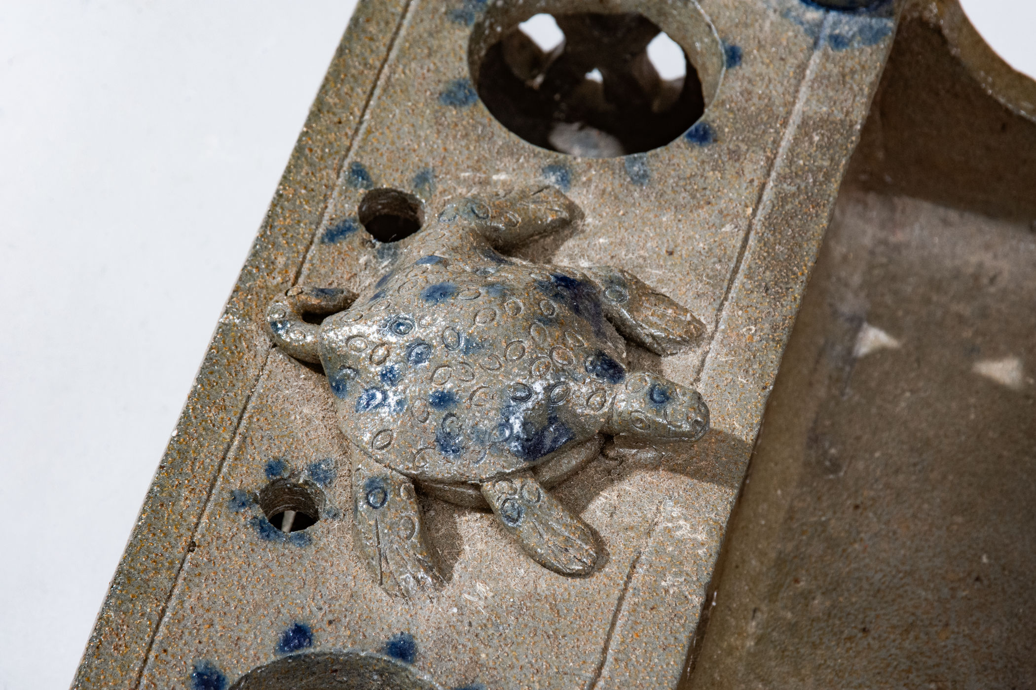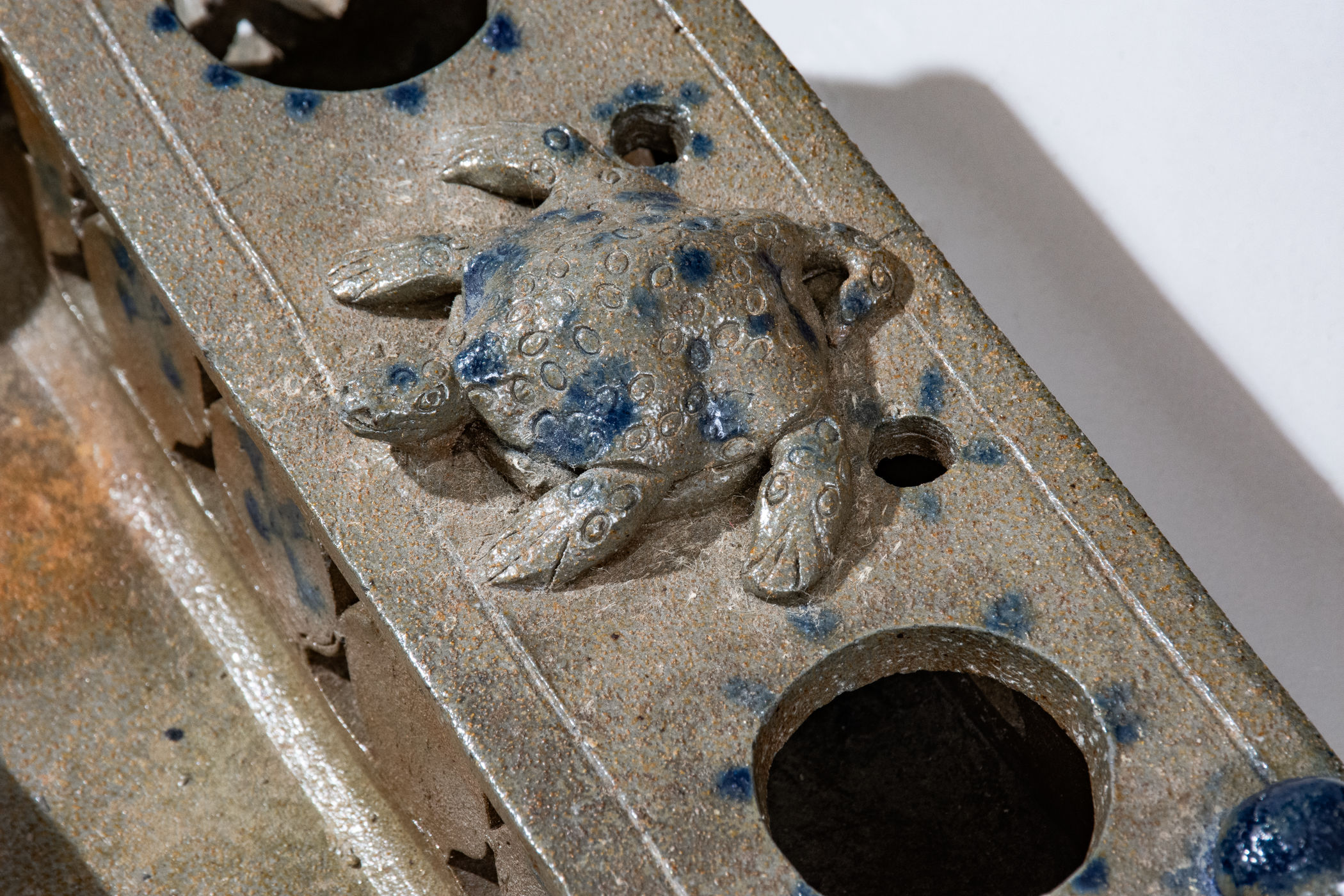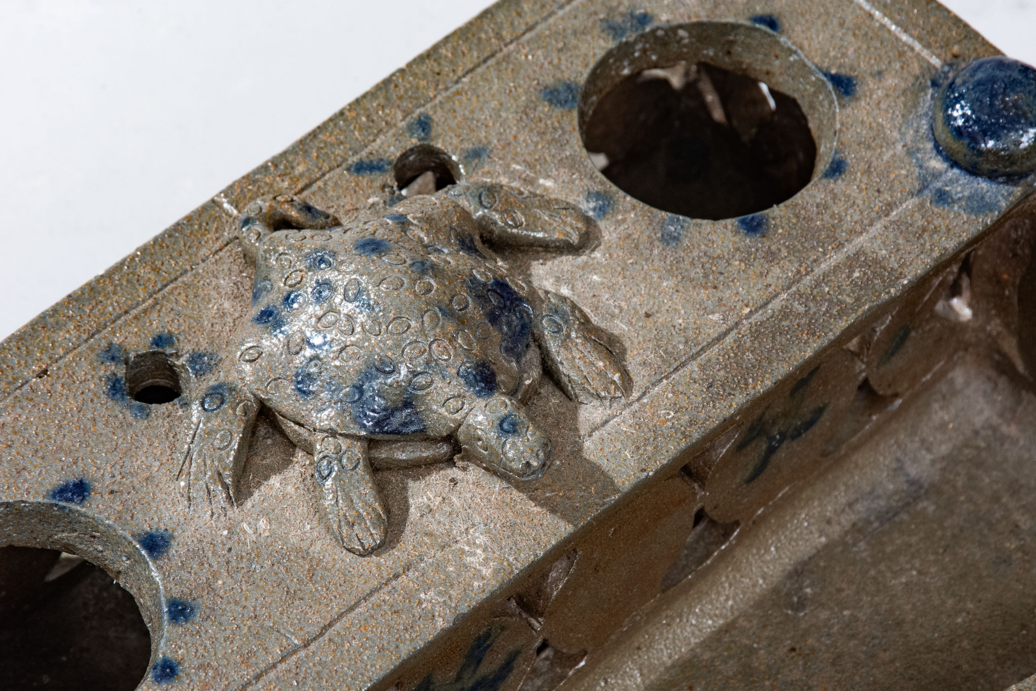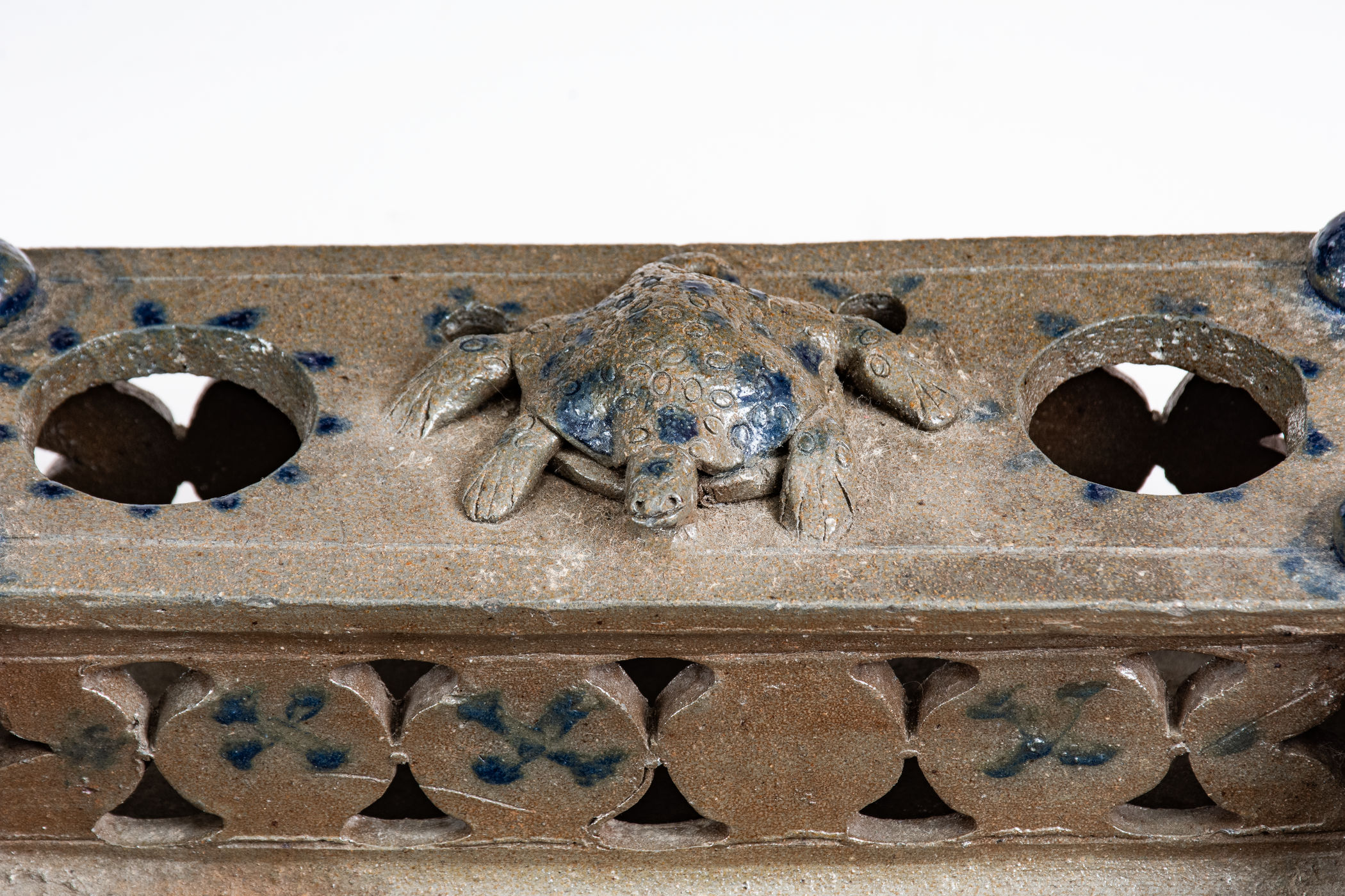 Important and Probably Unique Cobalt-Decorated Stoneware Inkstand with Turtle Finial, attributed to the Decker Pottery, Washington County, TN, circa 1872-1910, slab-built form with elaborate pierced-work decoration to the front, reverse, sides, and pen tray, the top surmounted by four balls of clay and a central hand-modeled figure of a turtle with impressed oval decoration and incised details to face and feet. Brushed X-shaped decoration to front of stand, crosses to reverse ,and highlights the pierced X-shaped motifs on the sides of the stand. Top of stand decorated with cobalt highlights to the turtle, ball finials, and dashes surrounding the circular openings for the well and sander and two smaller openings for pens behind the turtle. Additional dashed decoration spans the left and right upper edges of the stand. Surface covered in a clear salt glaze. Extremely few Southern ceramic inkstands (either stoneware or redware) from this time period or earlier are known. This example transcends the stoneware genre with its wonderful applied turtle decoration, a treatment essentially unheard of outside of Illinois's Anna Pottery and related Midwestern stoneware. One of the definitive works by Tennessee's most famous producer of stoneware. Exhibited: Handed Down, 1986. Provenance: Wahler states the following about the inkstand in her notes: "Beverly Burbage [the leading early Decker pottery collector] owned it in '86. He did not want to lend it in '96 as the family 'was making noises about getting it back.' . . . Later bought it. . . from Don Walters. :) a long story." Missing well and sander, typical for this form. Otherwise excellent condition. L 7 1/2" ; W 4 7/8" ; H 2 1/4".