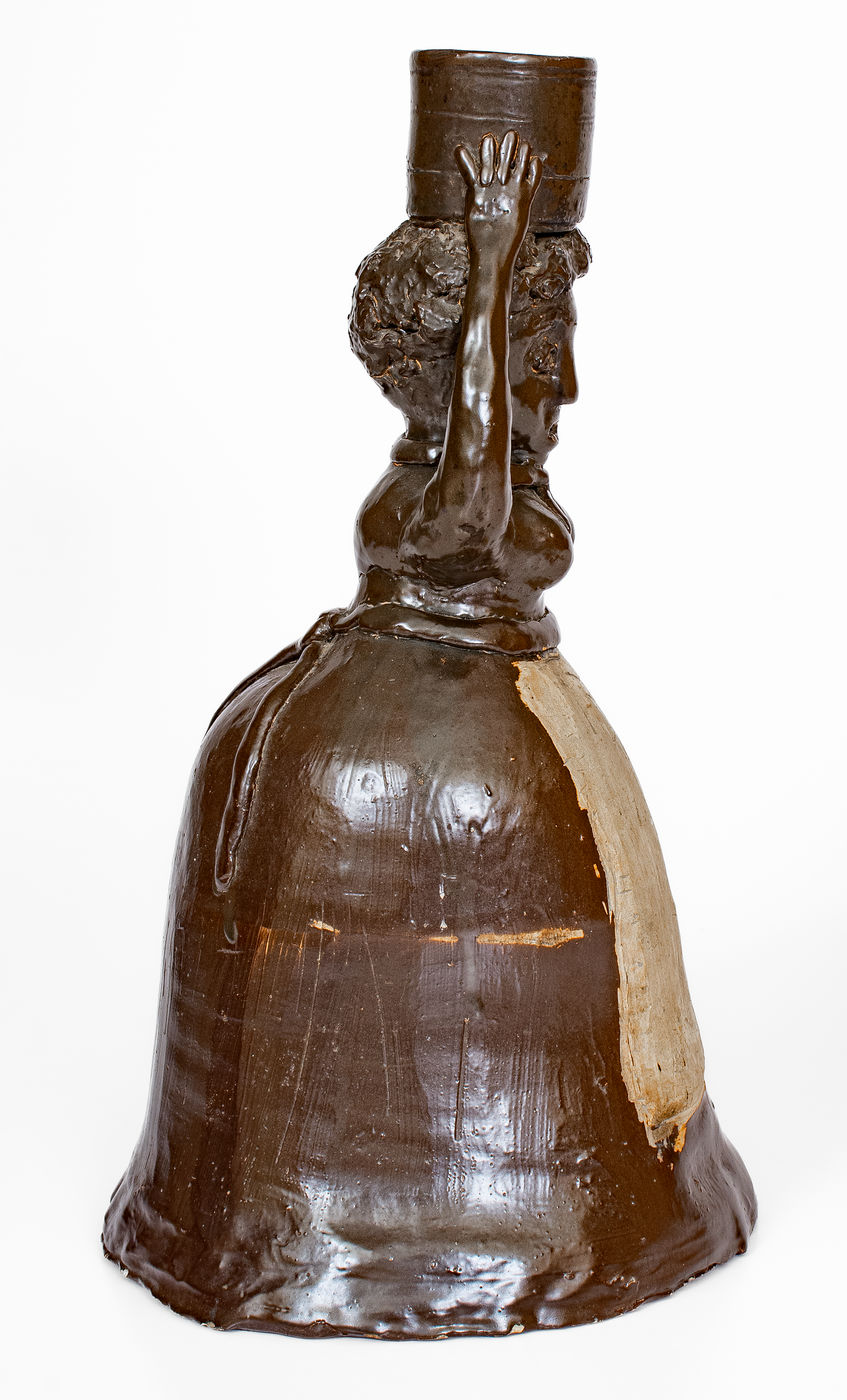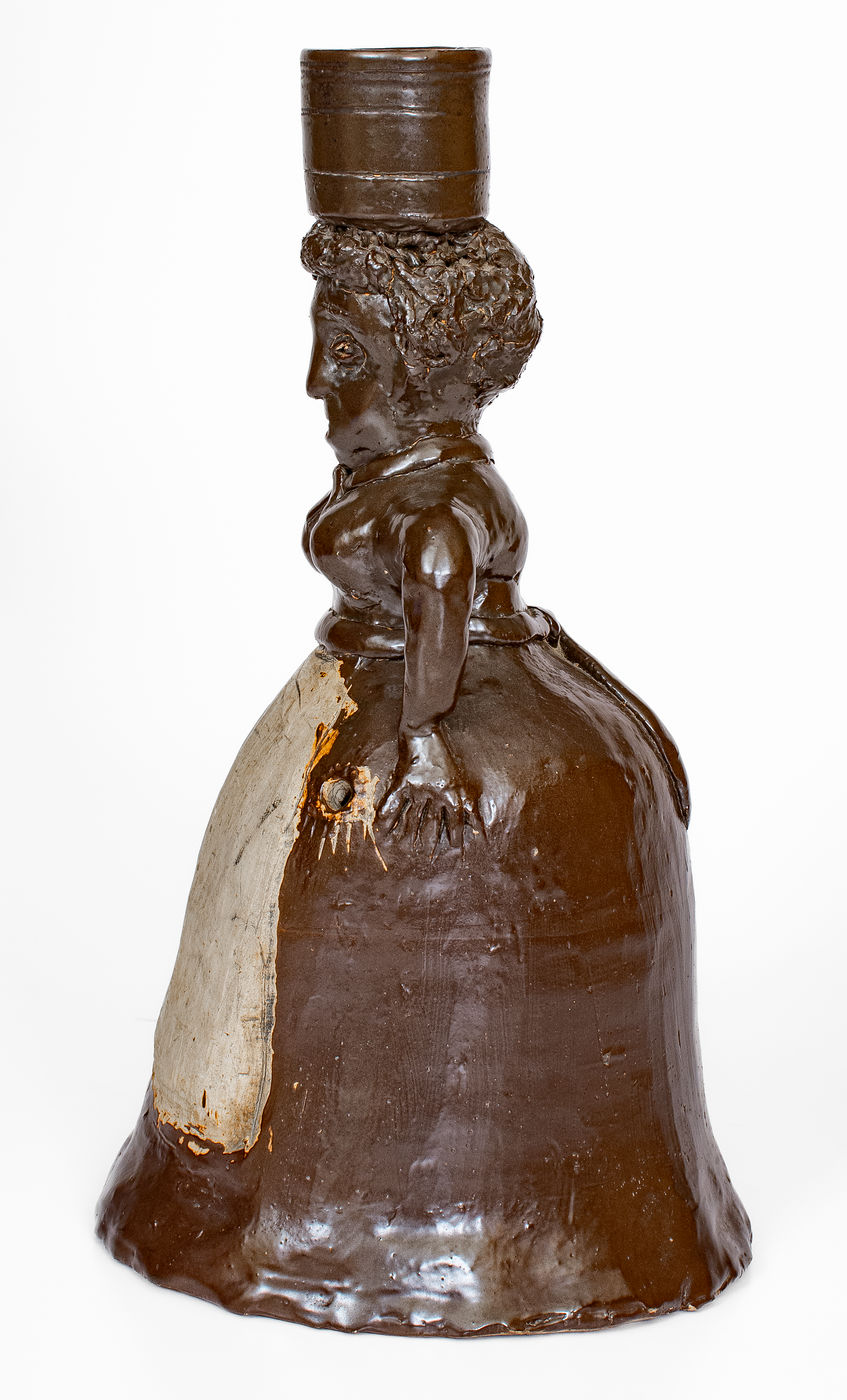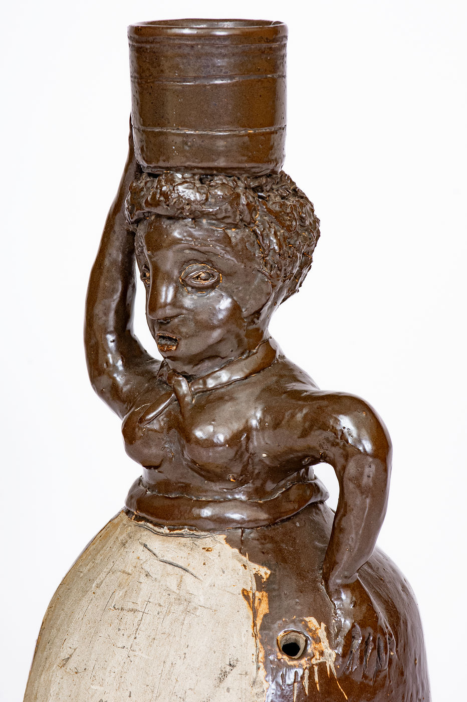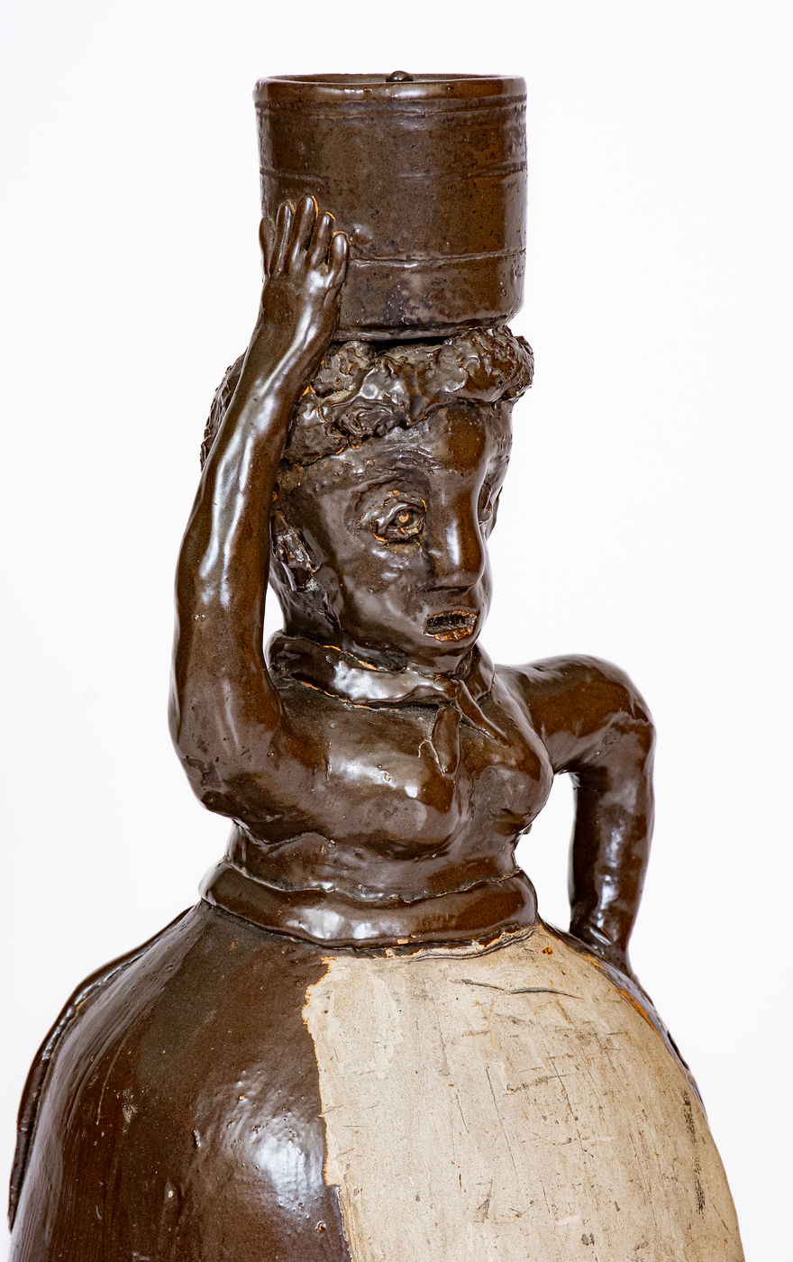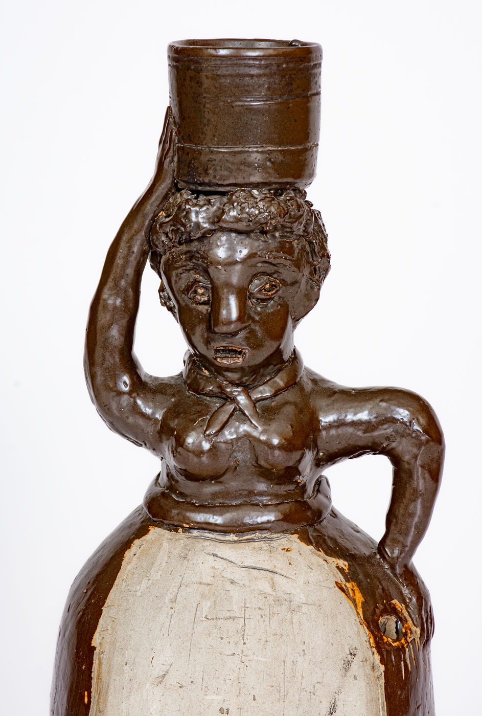 Exceedingly Rare and Important Glazed Stoneware Figural String Holder, West TN origin, possibly Paris, Henry County, TN, late 19th or early 20th century, wheel-thrown and hand-modeled figure in the form of an African-American woman wearing a long skirt and apron, depicted with one hand on hip and the other balancing a wheel-thrown pot atop her head. Figure includes applied facial features, hair, crossed kerchief around her neck, and tied waist band above the apron Surface covered in an Albany slip glaze with omission or removal of the glaze across the apron prior to the firing. Open underside and hollow interior with original hole for receiving string beside figure's left hand. Exceptional form, the only example of its kind that we are aware of. Exhibited: Tennessee Turned, Earthenware and Stoneware Made in East Tennessee 1800-1900, Museum of East Tennessee History, May 16-October 30, 2011. Provenance: In her notes, Wahler states, "Tony and Kitty Ables sold this, prob to Monty from whom I purchased it. According to Tony Abels: 'It belonged to a black family whose parents had both died and rather than the family to argue over anything they decided to sell it all. . . She [the figure] came from Gibson Co., Tenn. Which is Milan. Gibson Wells is well known for pottery and mineral water. . . I think the family name was Davis, I will check and make sure of it. The family thought it was made by their family. It was so minor I believe that to be true.'" Excellent, essentially as-made condition. H 13 1/4".