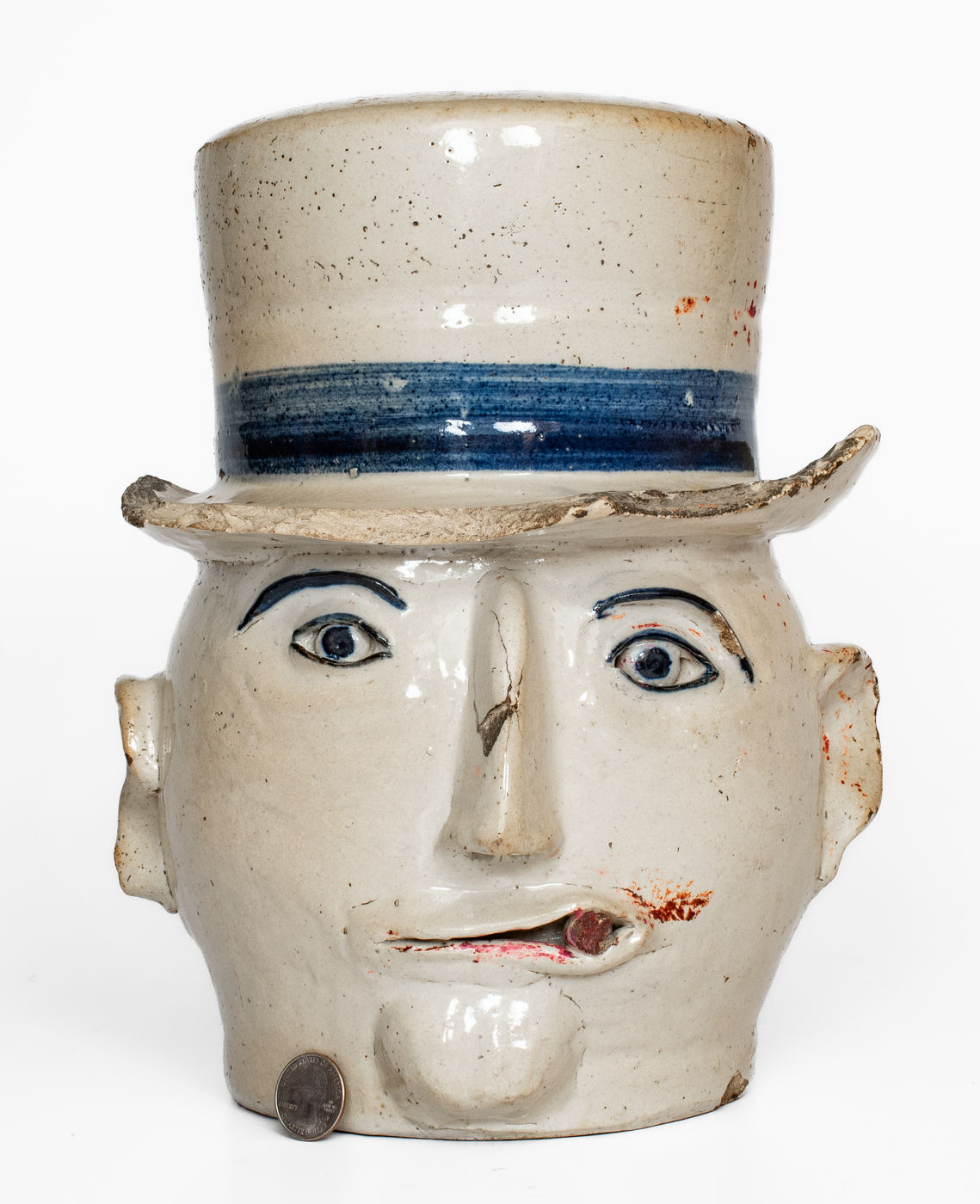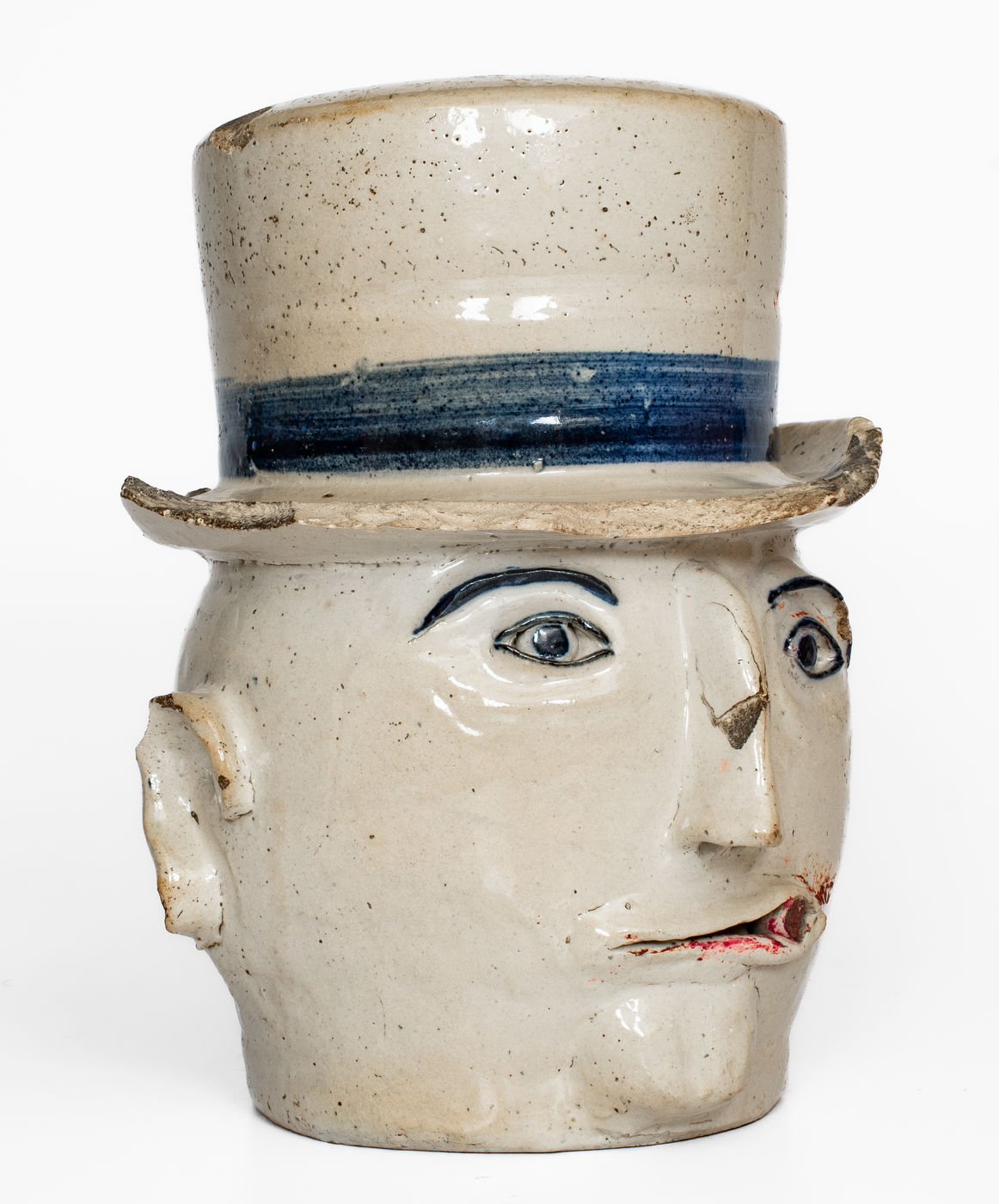 ×Extremely Rare Cobalt-Decorated Stoneware Face Gate Post Ornament, Midwestern or Southern origin
