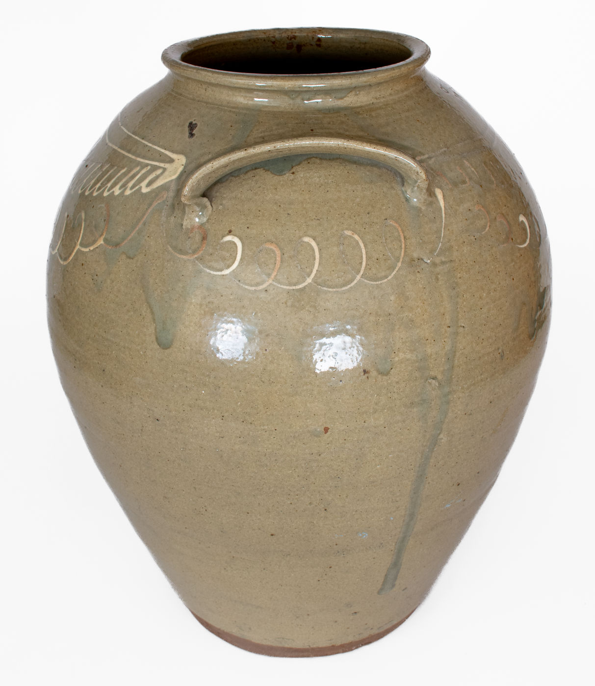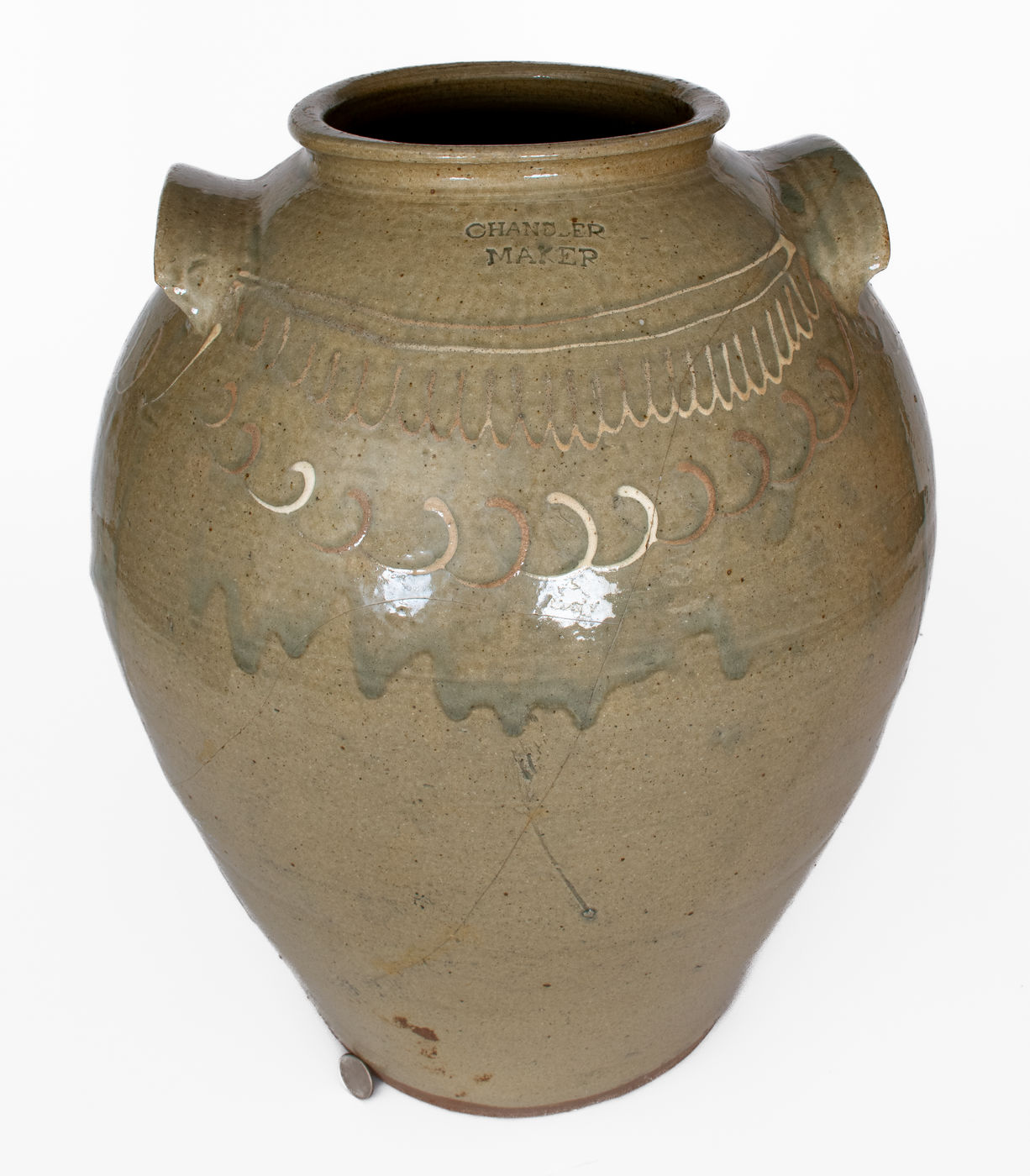 Rare Large-Sized Alkaline-Glazed Stoneware Jar with Kaolin Slip Decoration, Stamped "CHANDLER / MAKER," Edgefield District, SC, circa 1850, finely-potted, ovoid jar with thin, semi-rounded rim and large arched-tab handles, decorated on the front and reverse with kaolin-slip drape and looping line motifs, as well as below each handle with additional looping lines. Gray-green alkaline-glazed ground with bluish runs descending from the shoulder. Exceptional size, measuring approximately eight to ten gallons. A large, thin sealed Y-shaped crack to shoulder on unmarked side one side. This crack extends above the jar's proper left handle onto the front where it forms a very large inverted, sealed Y extending across the front, part of which ends on the jar's proper right side. H 19". Special Note: Due to this object's large size, we are unable to ship it using our normal in-house shipping service. It must either be picked up by the high bidder, or special arrangements must be made by the high bidder for pick up and / or shipping by a third party. If you have any questions, please contact us; we are certainly able to recommend options for third party shippers ahead of time that you can contact for a quote.