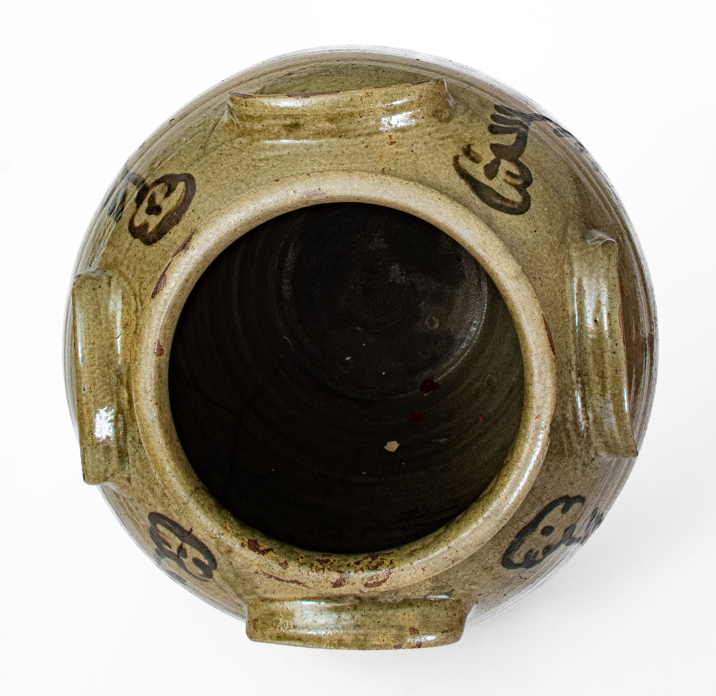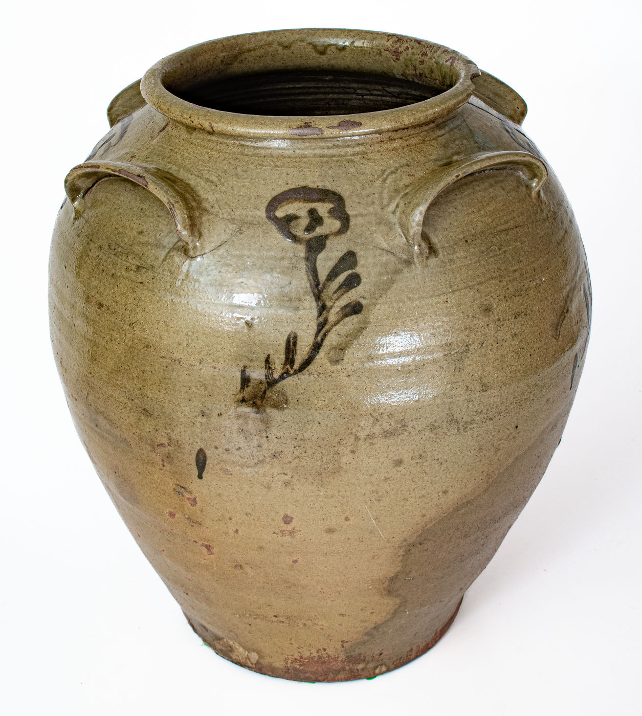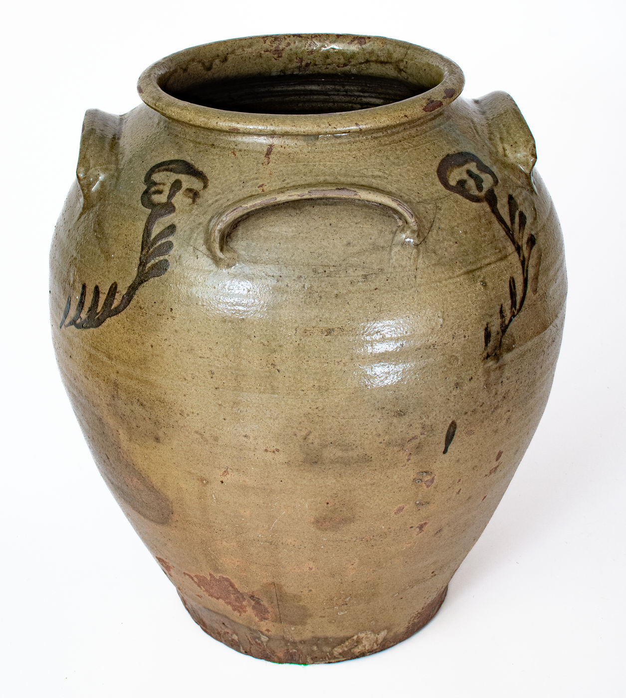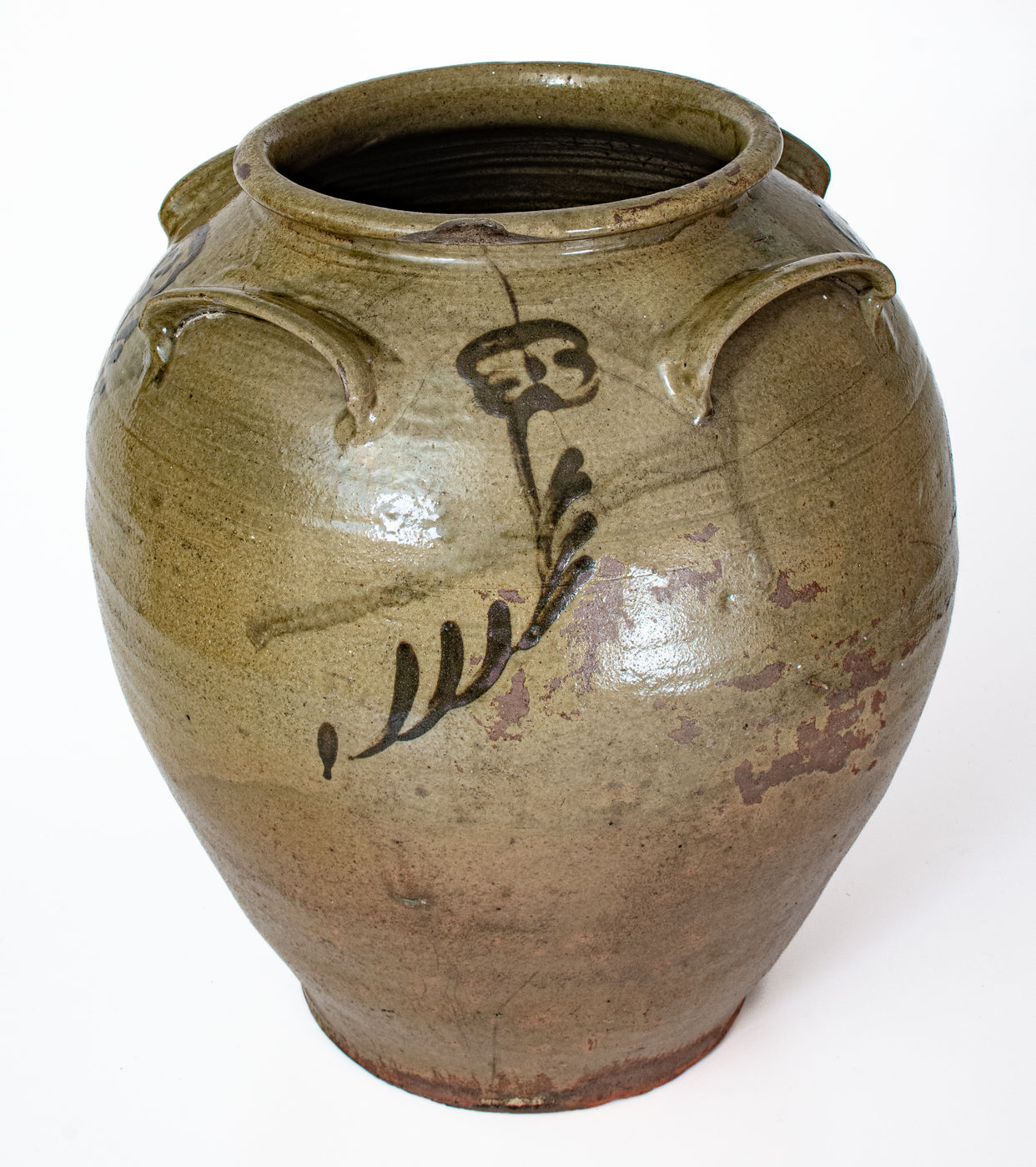 Exceptional Four-Handled Alkaline-Glazed Stoneware Jar with Iron-Slip Broken Stem Floral Decoration, attributed to Thomas Chandler, Edgefield District, SC, circa 1850, finely-potted, bulbous jar with thin, semi-rounded rim and four arched-tab handles applied around the shoulder, iron-slip-decorated with four slip-trailed "broken stem" floral motifs around the shoulder against a gray-green alkaline-glazed ground with mottled lower half to jar. This jar features rare and desirable four-handled construction due to its remarkable size, measuring approximately twelve to fourteen gallons. Difficult-to-find with any decoration, this four-handled form is most often seen with Chandler's kaolin-slip drape motif, making this work somewhat more unusual. Provenance: Ex-George Sadder. Two large rim chips, measuring 2 5/8" and 1 7/8". An approximately 6 1/2" x 4 1/2" network of thin cracks to shoulder area, some surface level only, not visible on interior, adjoining a thin crack extending around majority of jar's shoulder, parts of which are visible on interior and parts of which appear to be surface-level only. These cracks are unsealed and jar "rings true." A horizontal 5 3/8" Y-shaped line near midsection, partially visible on interior. Some additional surface lines to interior only. A thin crack across underside, extending 6 1/4" up base in two places. Areas of grease staining to jar. A smooth, minor base chip. Remarkably, all four handles survive with no chips. H 19 1/2". Special Note: Due to this object's large size, we are unable to ship it using our normal in-house shipping service. It must either be picked up by the high bidder, or special arrangements must be made by the high bidder for pick up and / or shipping by a third party. If you have any questions, please contact us; we are certainly able to recommend options for third party shippers ahead of time that you can contact for a quote.