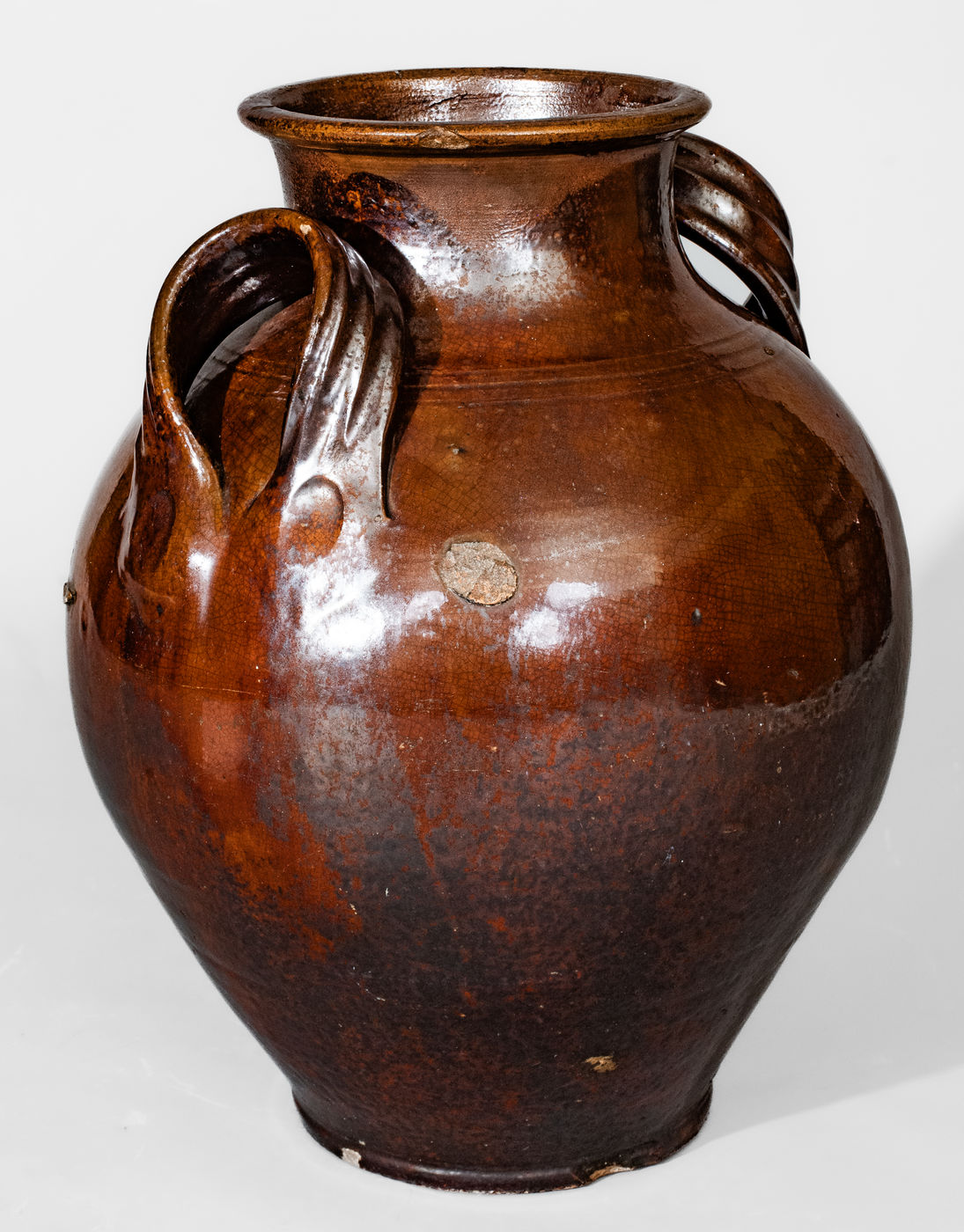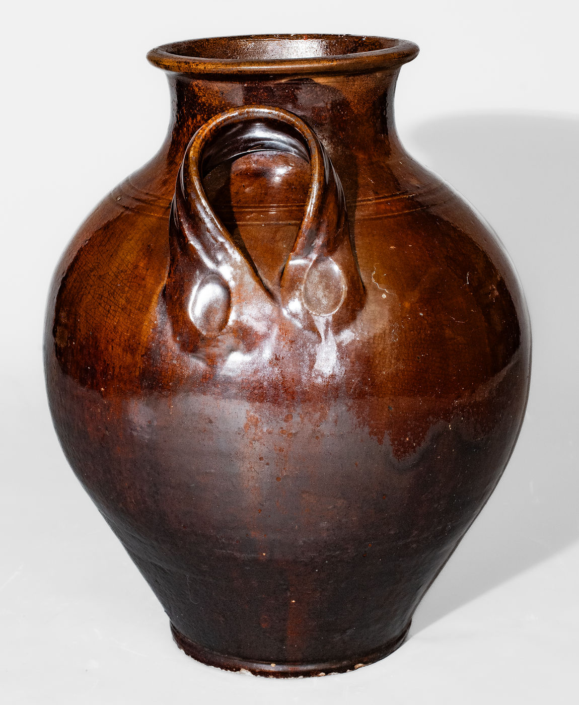 Fine Glazed Redware Jar, NC or Eastern TN origin, circa 1790-1860, ovoid jar with footed base, tooled shoulder, tall collar with flattened rim, and ribbed open-strap handles with depressed terminals, the surface covered in a mottled brown lead-based glaze colored with iron or manganese. This jar is attributed by Wahler to Christopher Alexander Haun of Greene County, Tennessee, circa 1840-1860, and is described as such in her book, Tennessee Turned. However, a closely-related jar in the collection of Old Salem Museum and Gardens in Winston-Salem, NC is attributed to Salem or Bethabara potteries, possibly Moravian, circa 1790-1820. This North Carolina attribution seems more likely, based on nuances of the form and glaze. A particularly well-potted vessel with mirror-like gloss to the glaze. Exhibited: Tennessee Turned, Earthenware and Stoneware Made in East Tennessee 1800-1900, Museum of East Tennessee History, May 16-October 30, 2011. Illustrated in Wahler, Tennessee Turned, Earthenware and Stoneware Made in East Tennessee 1800-1900, Part One, p. 71, fig. 71, p. 116, pl. 14, p. 201, fig. 71, and p. 230, pl. 14. Provenance: Purchased at David Elkins Auction, Bowmantown, TN on September 9, 1988. Exceptional condition for jars of this type with generally minor flaws: a 3 1/2" hairline from rim, a 1 1/2" glazed-over base chip, some additional shallow chipping and wear to base, a tiny glaze flake to one handle, a 5/8" rim chip, an adhered piece of in-the-firing clay to each side (contact mark), and a few minor surface-level fissures to glaze at shoulder. H 14".
