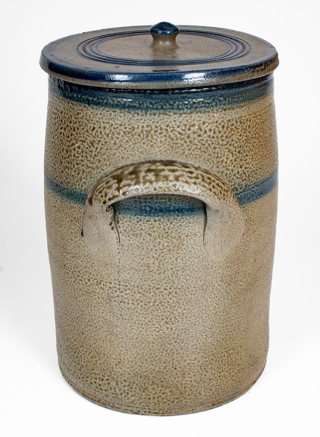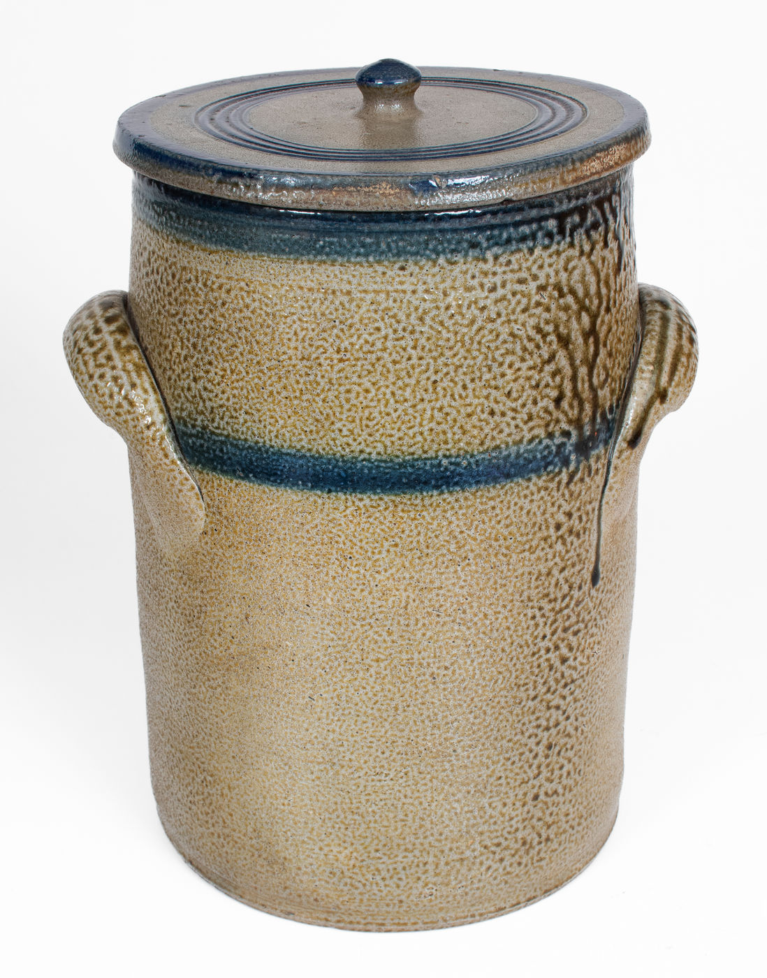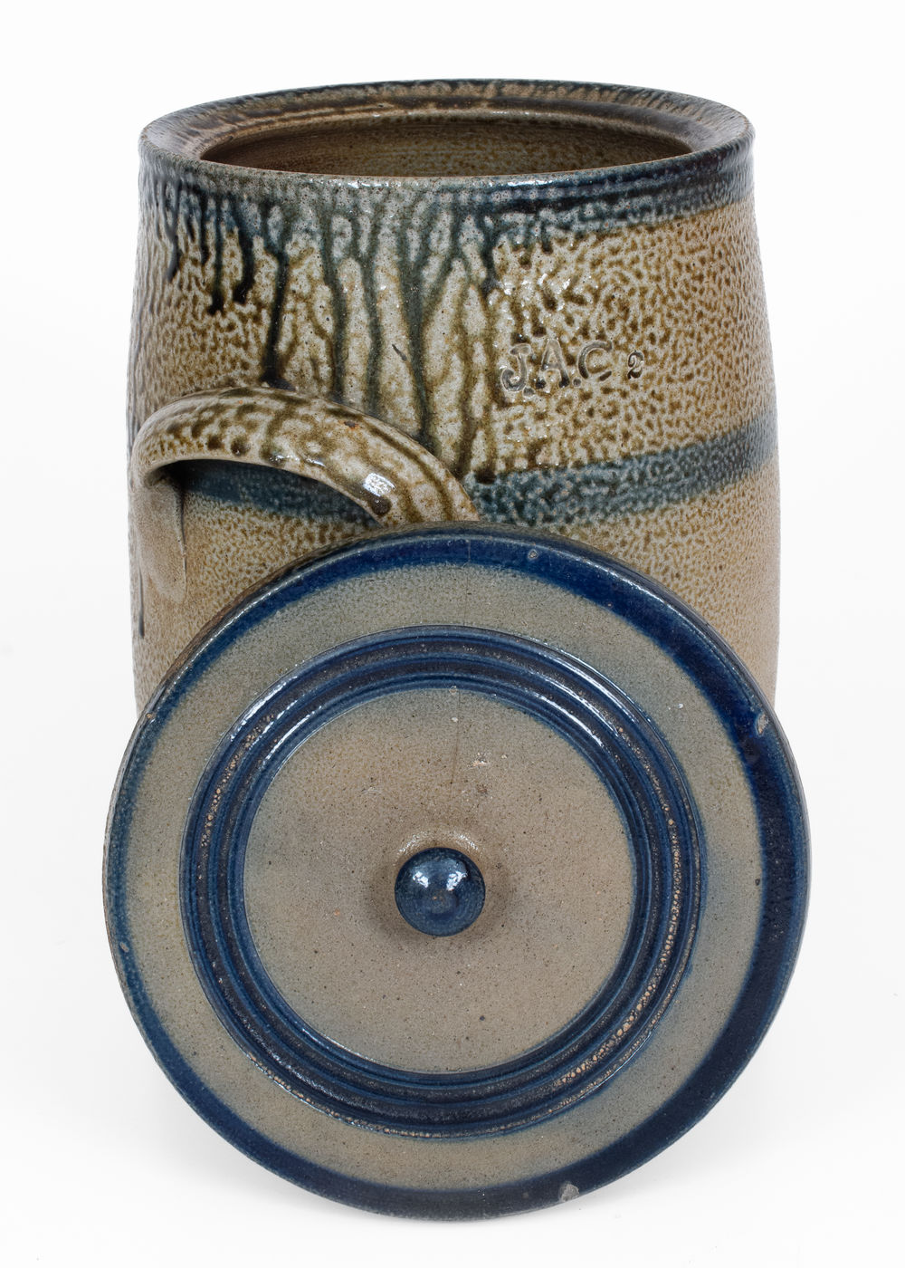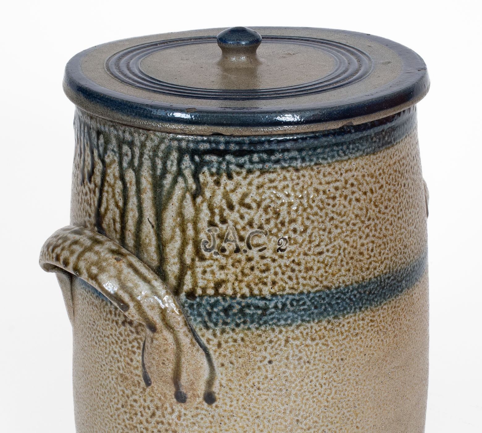 Exceptional Two-Gallon Cobalt-Decorated Stoneware Jar, Stamped "J.A.C," John Anderson Craven, Randolph County, NC, mid 19th century, tapering jar with open-strap handles, the rim and shoulder decorated completely around with two freehand stripes. Surface covered in a heavy salt glaze including dramatic runs to one side descending over the handle. Shoulder impressed with the maker's mark of John Anderson Craven along with a two-gallon capacity mark. Includes original salt-glazed lid with tooled midsection, pointed finial, and cobalt highlights. This jar is the first cobalt-decorated example of stoneware marked by John Anderson Craven that we have ever offered. Its addition of this scarce cobalt brushwork and inclusion of its original decorated lid place it among the best examples of this potter's work to be sold at our auction. In her notes, Wahler states, "This is a great jar and money should be made on it." Jar in excellent, essentially as-made condition. Lid with a thin 3 1/2" crack from edge, minor in-the-firing tripod marks to top edge, two chips to underside of edge, and four small chips to flange on underside. H (including lid) 13".