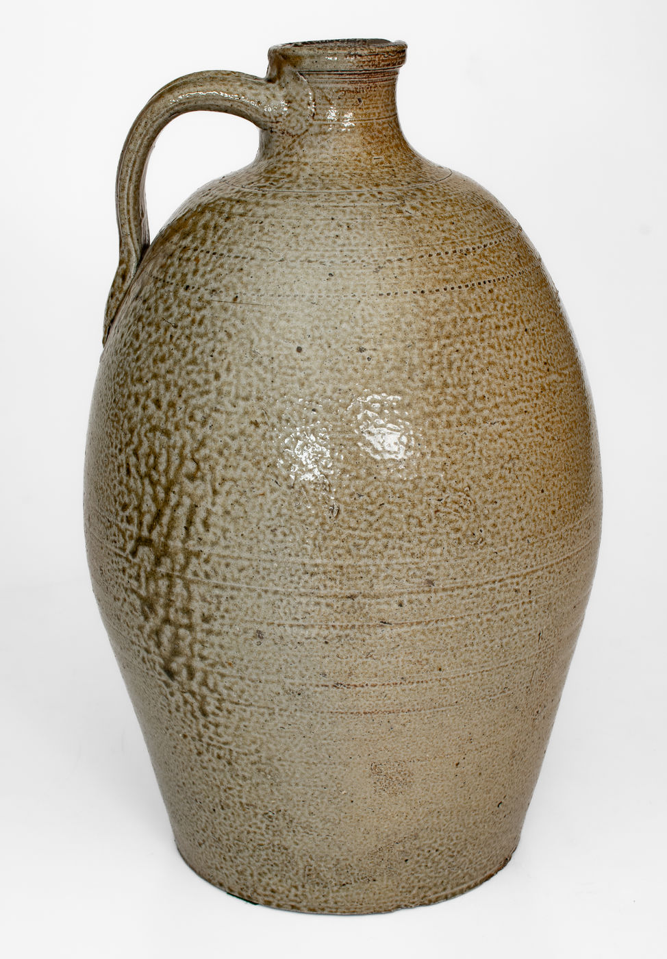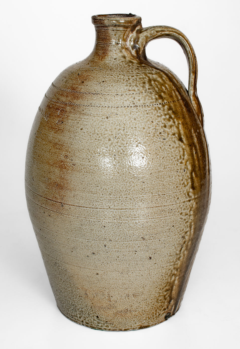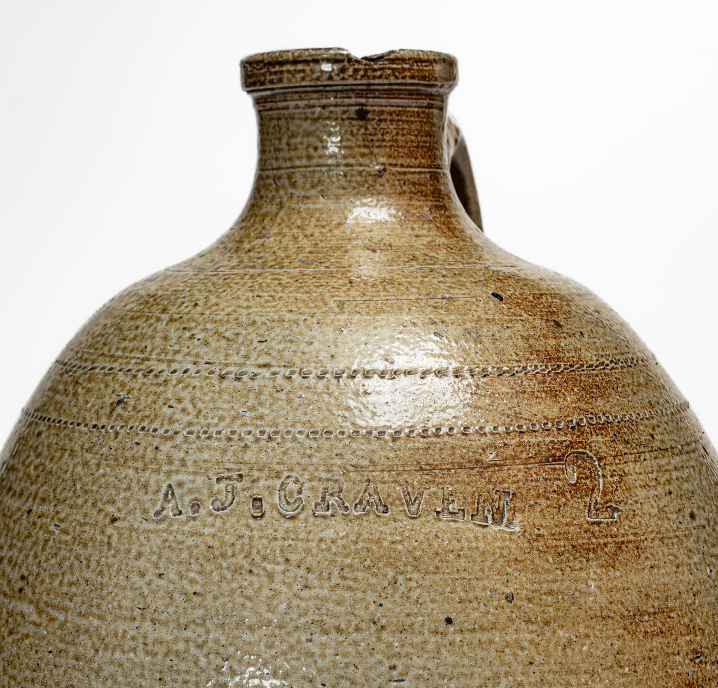 Important and Possibly Unique Salt-Glazed Stoneware Jug, Stamped "A. J. CRAVEN," Andrew Jackson Craven, Randolph County, NC, third quarter 19th century, ovoid jug with wide, flaring spout, semi-squared mouth, and deeply-grooved strap handle, the surface covered in a salt glaze with dramatic top-to-bottom glaze run on the reverse and handle. Body of jug decorated with numerous decorative incised lines as well as two rows of dentile coggling at the shoulder. Shoulder impressed with A.J. Craven maker's mark beside a two-gallon capacity mark. According to Wahler's notes, this jug is the "ONLY ONE known at this time" bearing this maker's mark. Scarborough's The Craven Family of Southern Folk Potters states there were three Andrew Jackson Cravens, one described as a landowner, another as a farmer, and a third as a school teacher, none of whom were known to be potters. (Scarborough, p. 9, 11, and 28). This jug suggests otherwise. Scarborough notes that "there is considerable confusion in properly identifying all three of the Andrew Jackson Cravens and that further research is necessary to identify them" (Scarborough, p. 11). Easily among the rarest marked Craven family vessels known, this work displays the proficient throwing and firing abilities of this dynastic North Carolina potting family. Its spout and handle construction indicate a style that is possibly distinct to this specific family member. A 7/8" spout chip with a 1 1/8" hairline descending from it. A minor base nick. H 15".