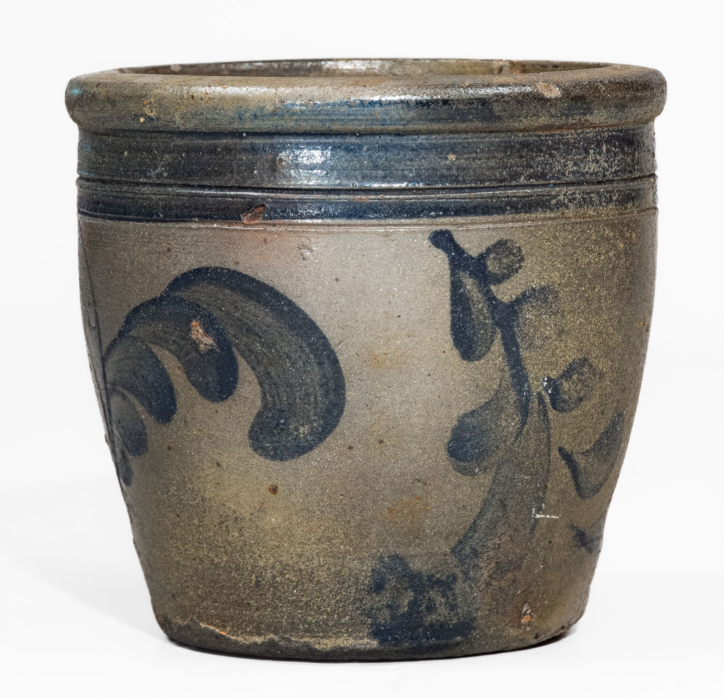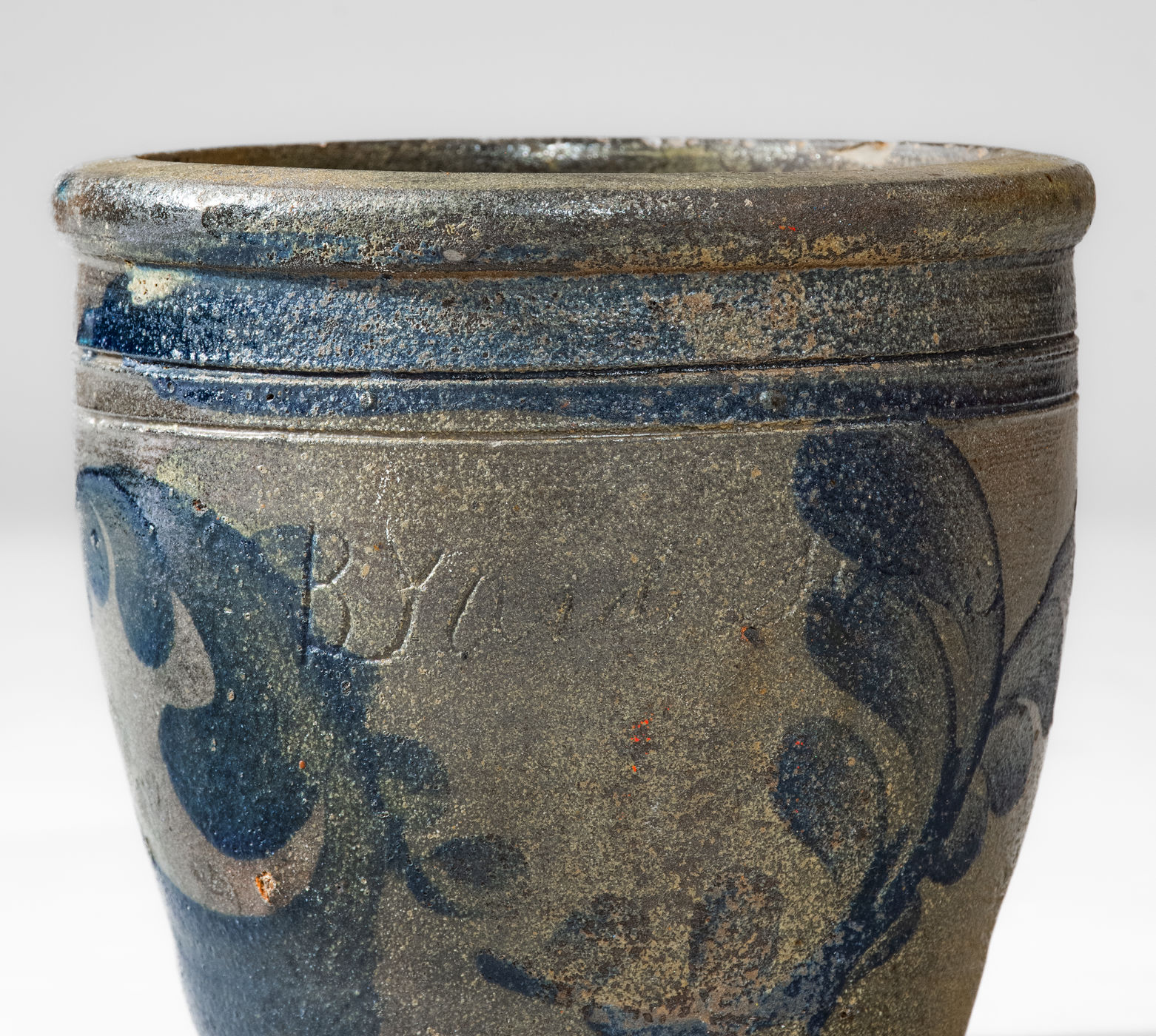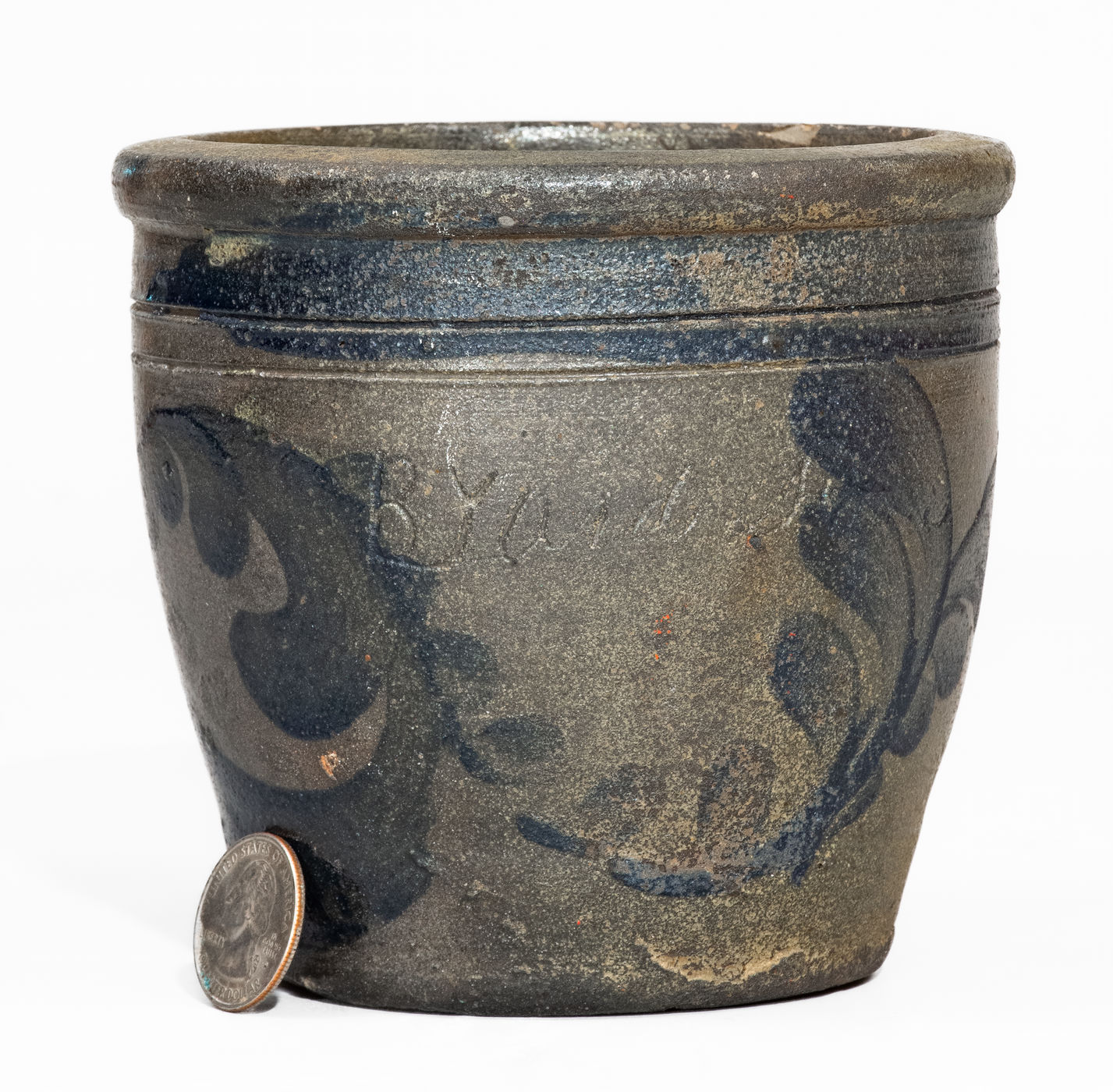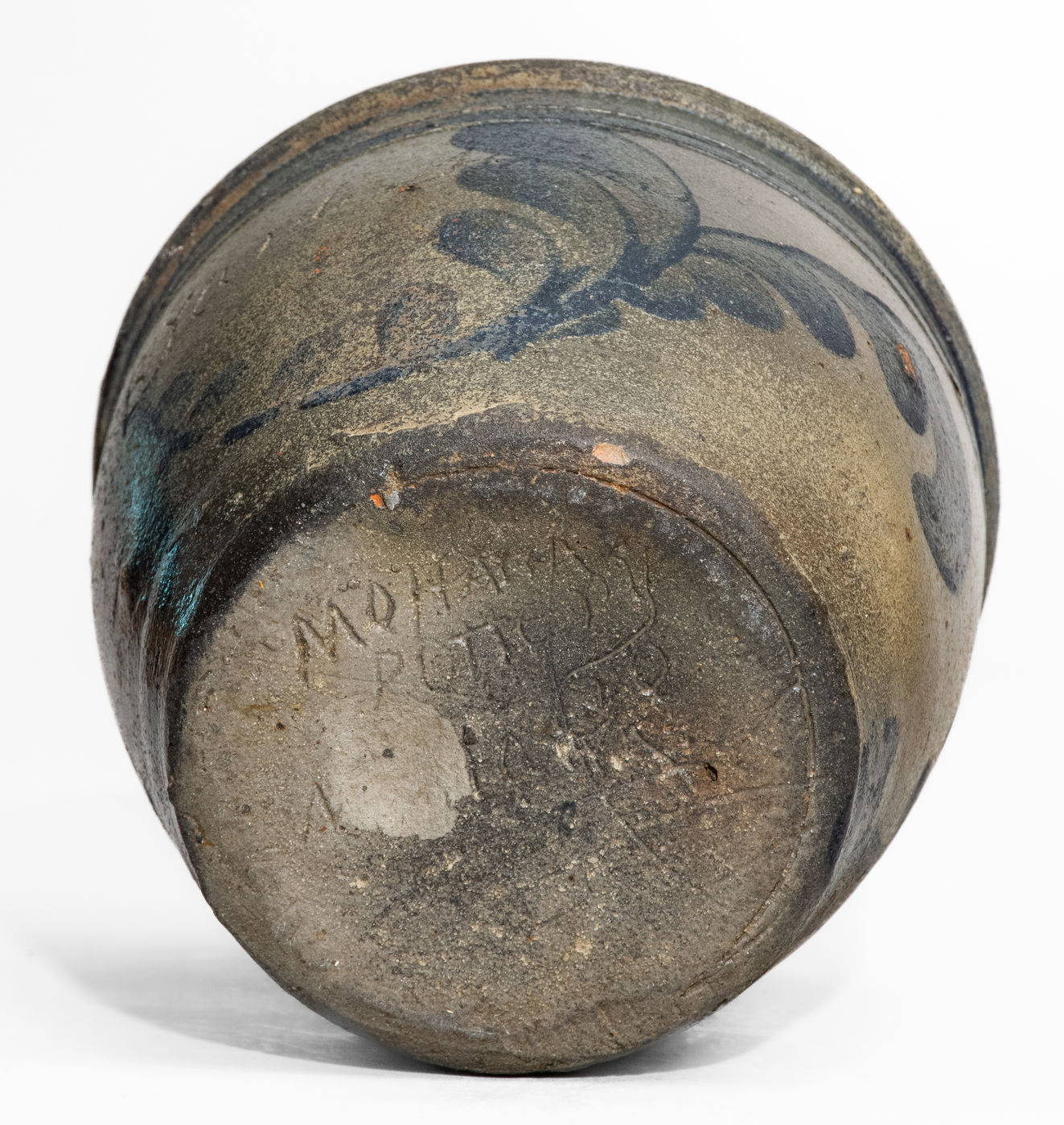 Extremely Rare Small-Sized Cobalt-Decorated Stoneware Jar, Inscribed "Byard Harris" and "Mohawk Pottery Co / Mohawk," Greene County, TN origin, circa 1887-1900, ovoid jar with tooled shoulder and semi-rounded rim, brush-decorated around the body with an undulating vine below a stripe. Midsection incised "Byard Harris." Underside incised "Mohawk Pottery Co / Mohawk." This specific jar is discussed in Smith and Rogers,Tennessee Potteries, Pots, and Potters - 1790s to 1950, Vol. 1, p. 116 as follows: "One of the more confused issues concerning potters in Mohawk begins with the previously mentioned comments of a long time resident. After the discussions concerning Haun, Weaver, and Lotspeich, there is the statement 'A man from Ohio by the name of Harris established a pottery plant here in about 1899, and manufactured drainage tile for about four years.' Nothing more has been learned about a Harris from Ohio, and it does not appear the operation described produced 'pottery.' However, there is a cobalt decorated crock in a private collection that is marked on its side with the name 'Byard Harris' and on the bottom 'Mohawk Pottery Co Mohawk.' The closest match for the Harris name appears to be 'Boyed Harris,' listed as an 18 year old laborer in the Mohawk civil district on the 1900 census. In 1900 he lived with his father, Walling Harris, and all members of the family are shown as born in Tennessee. There may or may not be any connection between all of this and the fact that a John M. Harris was the local postmaster from 1893-1895. The name 'Mohawk Pottery Co.' has not been seen in any other records, perhaps suggesting another operation in Mohawk that is still not well defined." Two newly discovered references to the Mohawk Pottery—the pictured advertisement and affidavit—help shed new light on this somewhat mysterious enterprise. A particularly fine example of Greene County stoneware, made extraordinary by its lavish cobalt, small size, and two inscriptions. Exhibited: Tennessee Turned, Earthenware and Stoneware Made in East Tennessee 1800-1900, Museum of East Tennessee History, May 16-October 30, 2011. Literature: Illustrated in Wahler, Tennessee Turned, Earthenware and Stoneware Made in East Tennessee 1800-1900, Part One, p. 74, fig. 76, p. 176, pl. 26, and p. 202, fig. 76. Provenance: Purchased from Monty Young. A 7/8" in-the-firing flake to underside, which leaves part of the "Moh" in the second "Mohawk" missing. A 2 1/2" hairline from rim. A minor in-the-firing base nick. Interior of rim with a small chip and minor nicks. H 4 5/8".