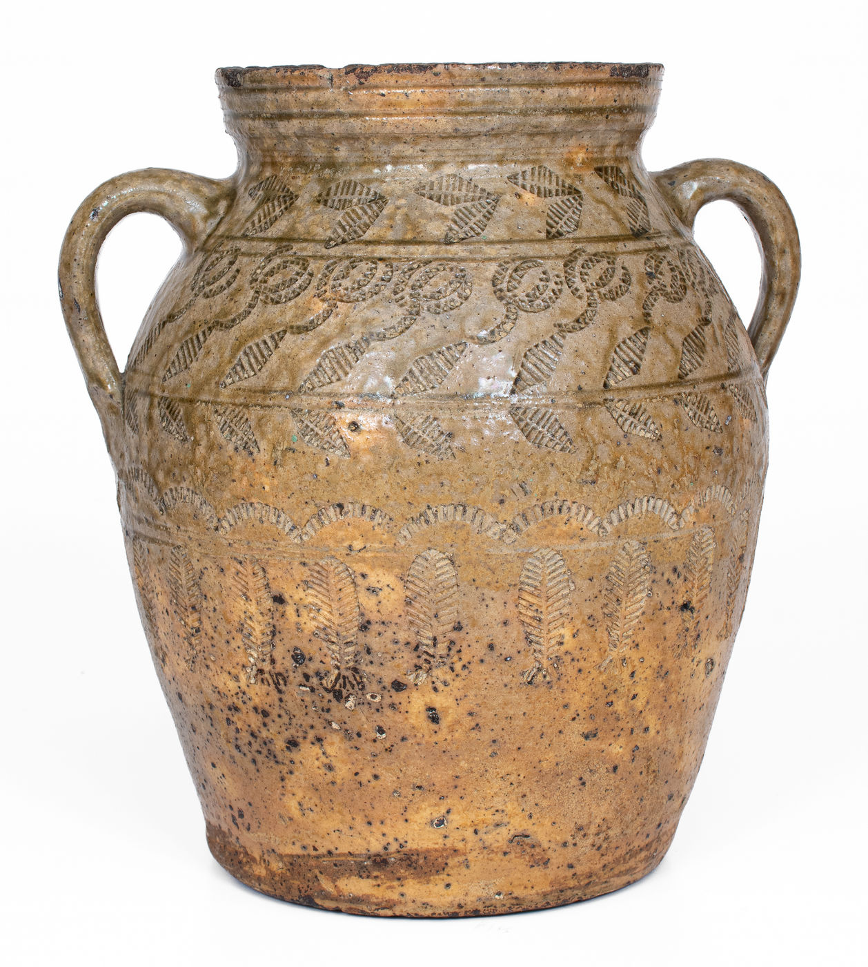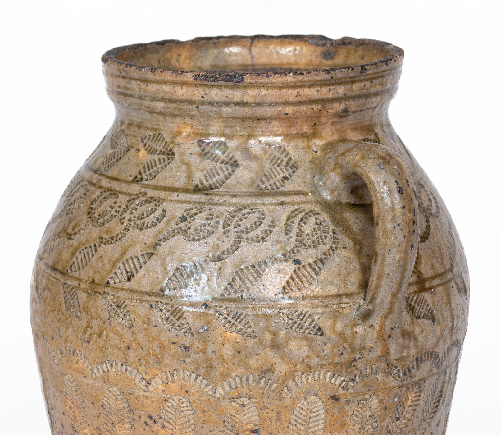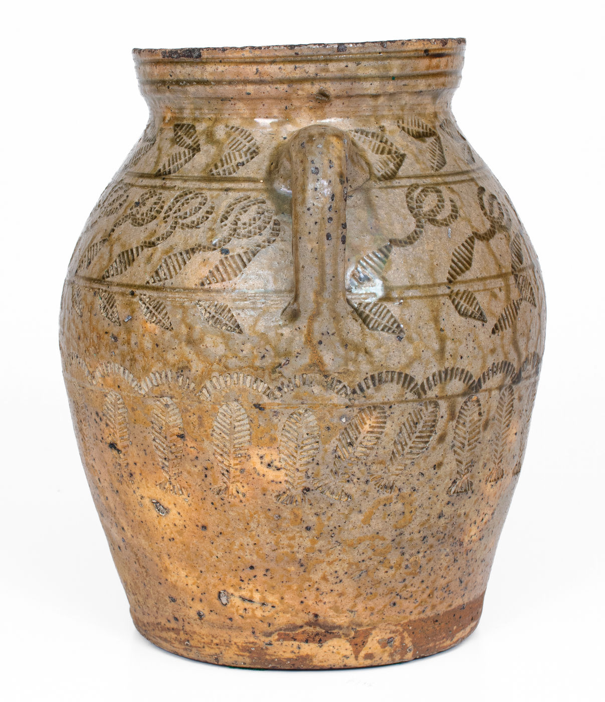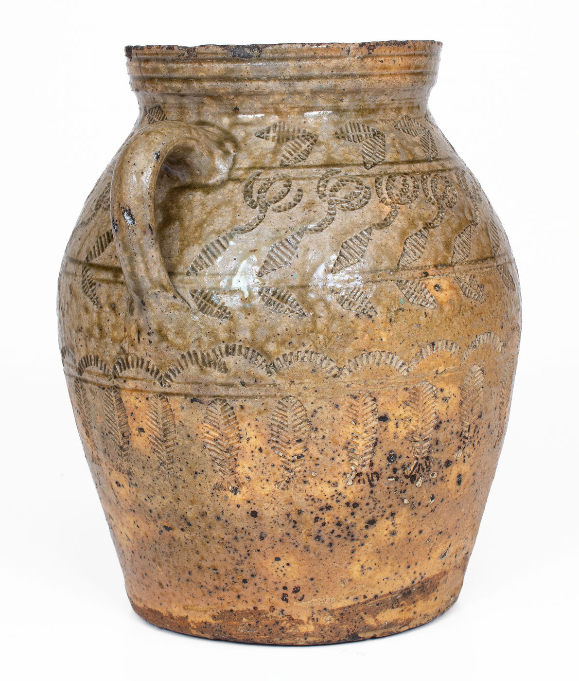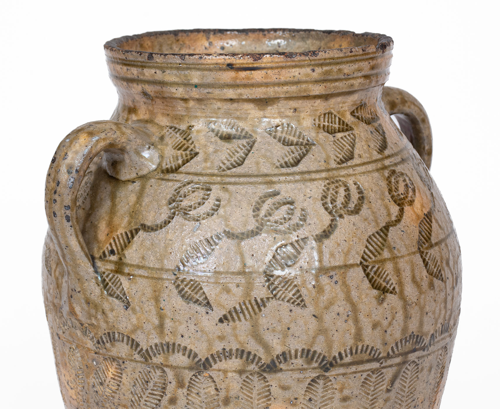 ×Exceptional Alabama (probably Perry Co) Open-Handled Stoneware Jar w/ Profuse Impressed Decoration