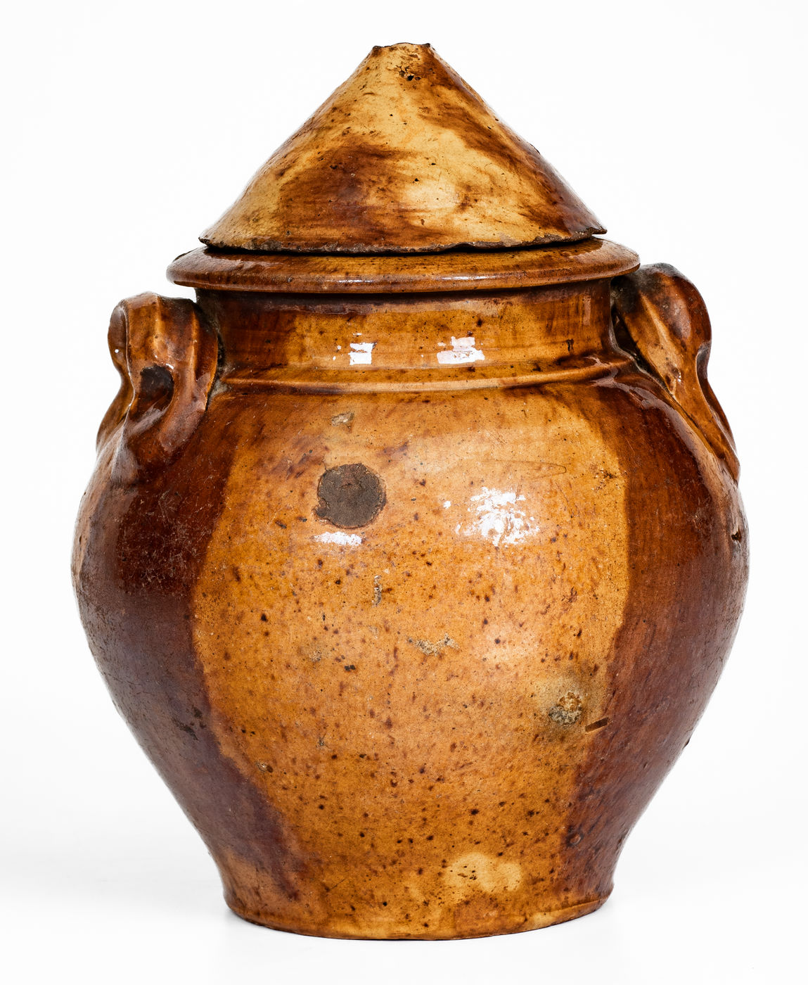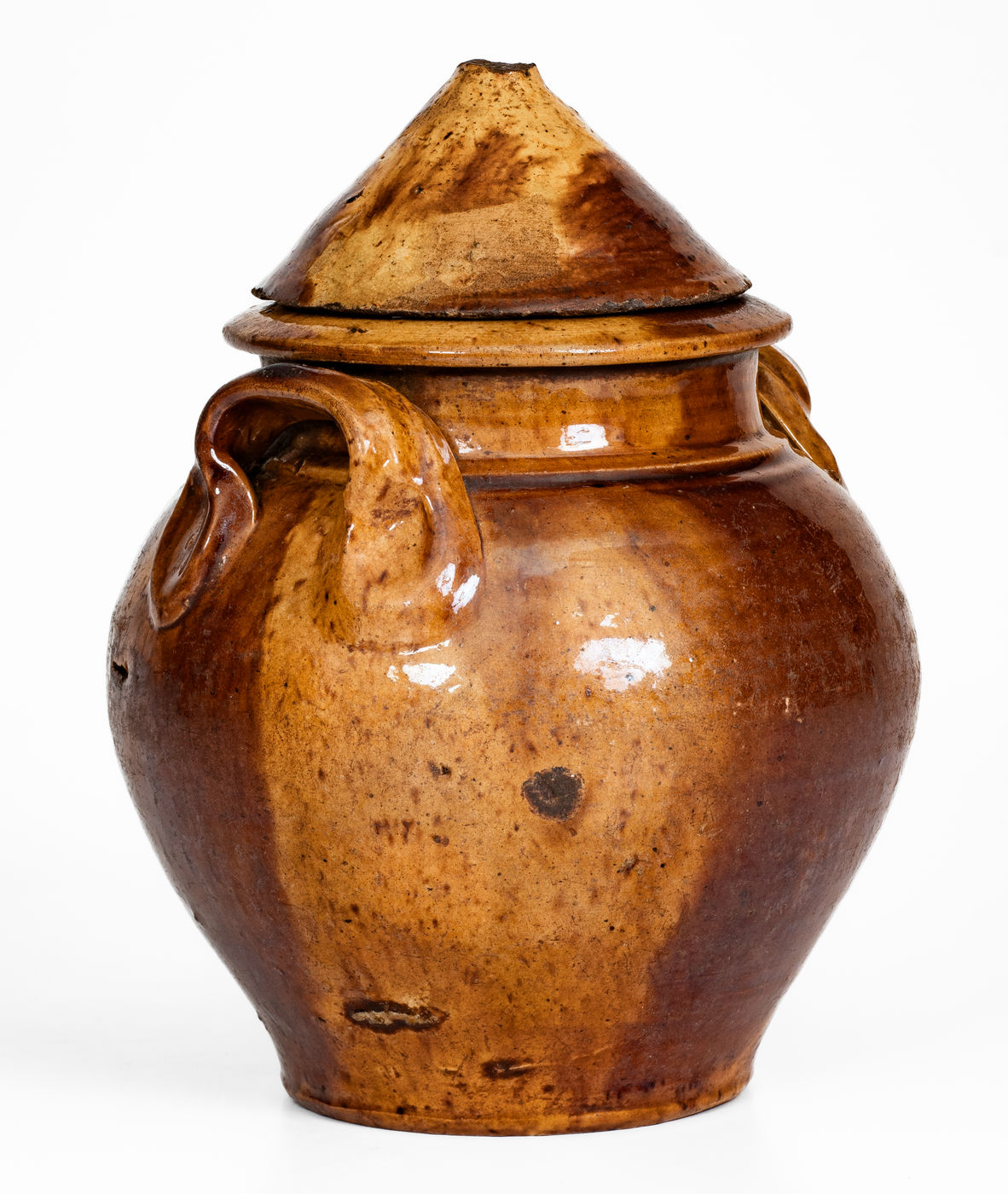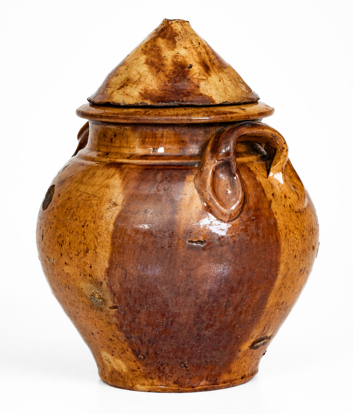 Rare Manganese-Decorated Redware Jar with Lid, Southwestern VA or Eastern TN origin, Dated 1854, squat-shaped, ovoid jar with tooled shoulder, flattened rim, and ribbed strap handles with depressed terminals, the lead-glazed surface featuring vertical swathes of manganese against an amber, iron-flecked ground. Includes original domed lid featuring the incised date, "1854," its lead-glazed surface featuring large manganese daubs against a cream-colored ground. Wahler states the following about this jar in her notes: I was really glad to get this jar. I had seen it earlier at Billy's. I do not know where it was made. Neck looks VA. It is possible that it was made in Greene County, TN." Jar in very nice condition with minor surface wear, an in-the-firing contact mark to rim and shoulder, a smaller in-the-firing contact mark to midsection, and a small piece of glazed-over clay near base. Underside with a flaked glaze drip, possibly in-the-firing. Lid missing finial, with two in-the-making glaze skips to top, shallow chipping to outer edge and flange on underside, as well as a 7/8" flake to flange on underside. H (including lid) 7 1/2".