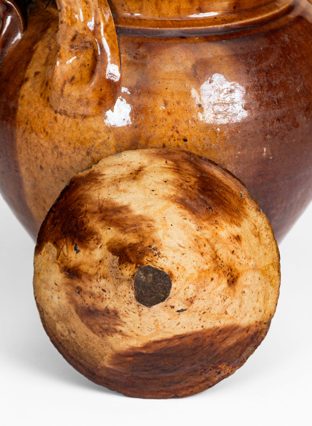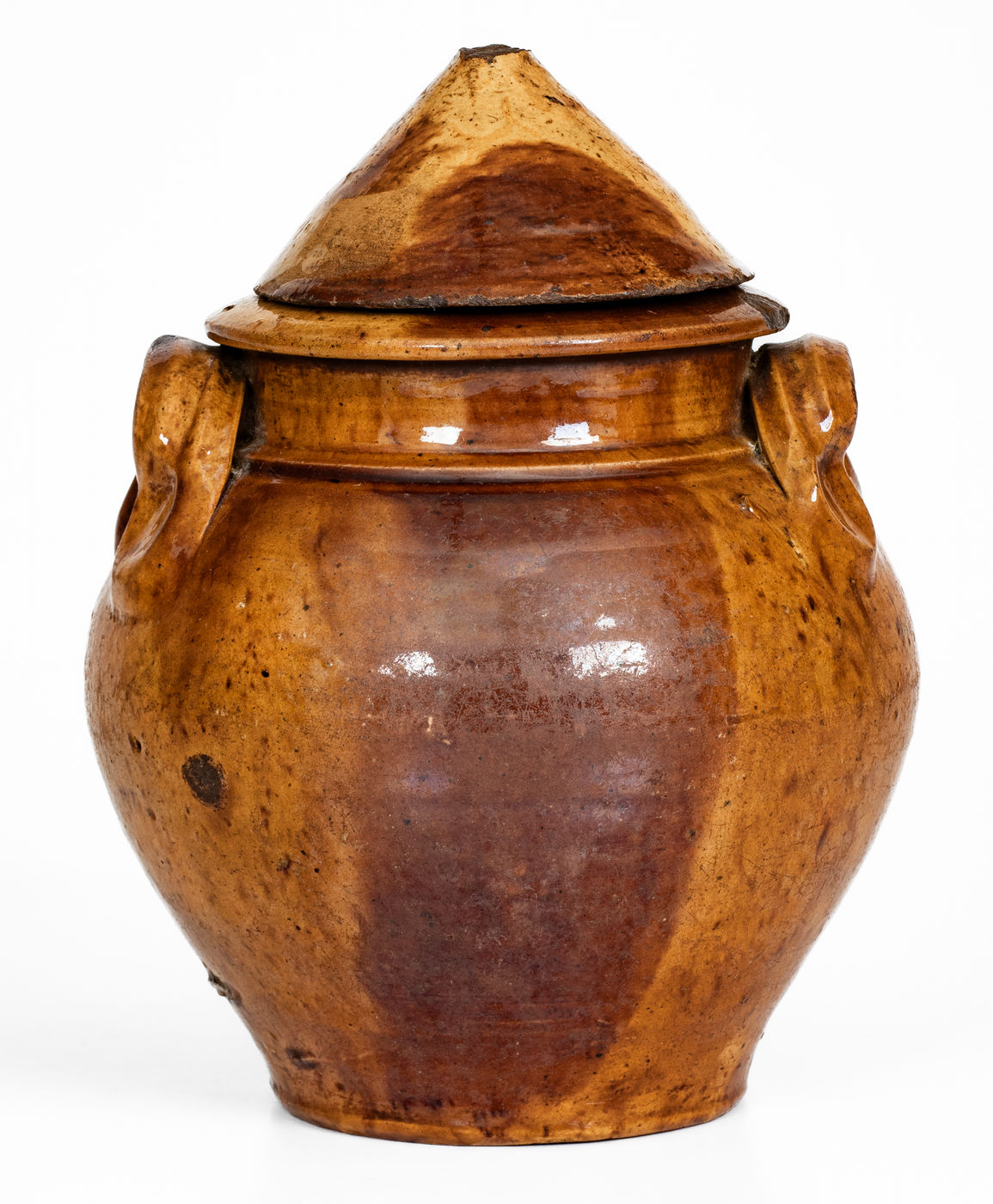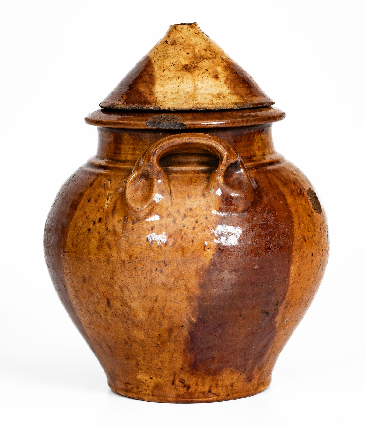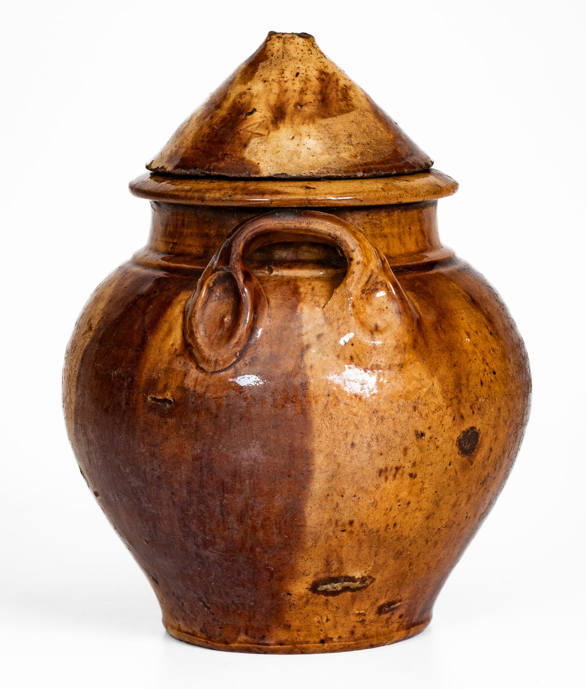 Rare Manganese-Decorated Redware Jar with Lid, Southwestern VA or Eastern TN origin, Dated 1854, squat-shaped, ovoid jar with tooled shoulder, flattened rim, and ribbed strap handles with depressed terminals, the lead-glazed surface featuring vertical swathes of manganese against an amber, iron-flecked ground. Includes original domed lid featuring the incised date, "1854," its lead-glazed surface featuring large manganese daubs against a cream-colored ground. Wahler states the following about this jar in her notes: I was really glad to get this jar. I had seen it earlier at Billy's. I do not know where it was made. Neck looks VA. It is possible that it was made in Greene County, TN." Jar in very nice condition with minor surface wear, an in-the-firing contact mark to rim and shoulder, a smaller in-the-firing contact mark to midsection, and a small piece of glazed-over clay near base. Underside with a flaked glaze drip, possibly in-the-firing. Lid missing finial, with two in-the-making glaze skips to top, shallow chipping to outer edge and flange on underside, as well as a 7/8" flake to flange on underside. H (including lid) 7 1/2".