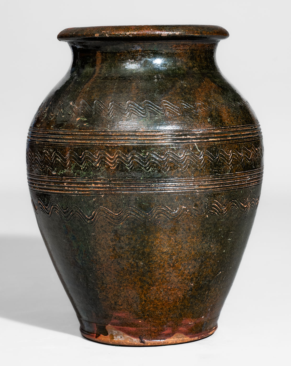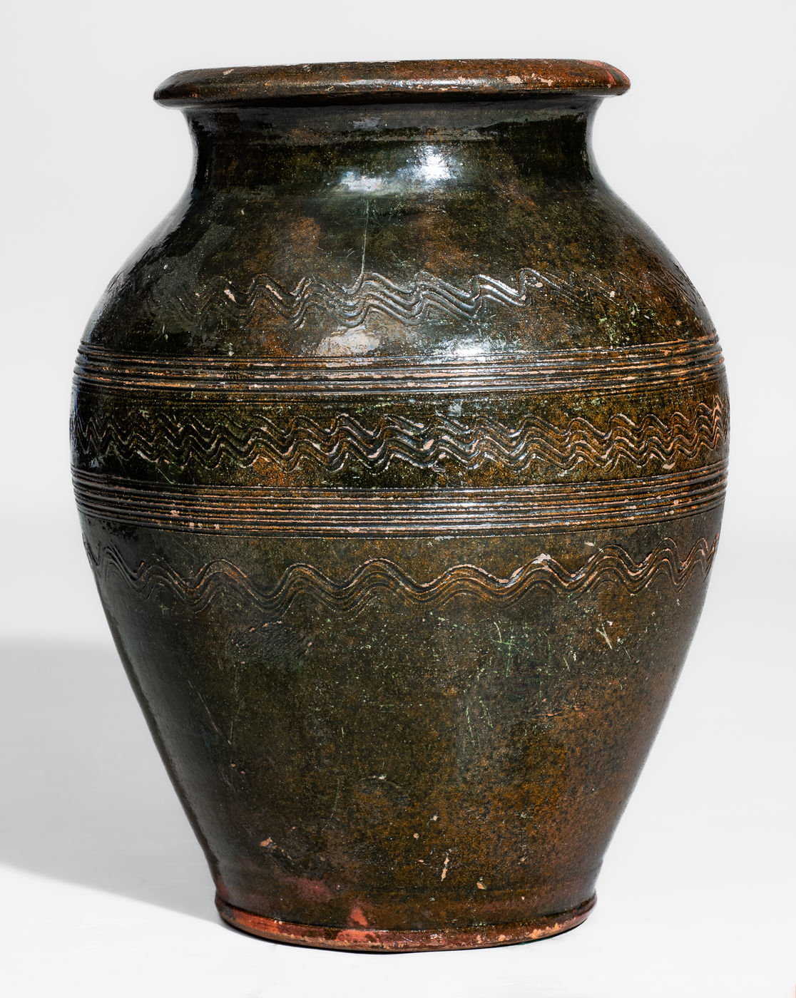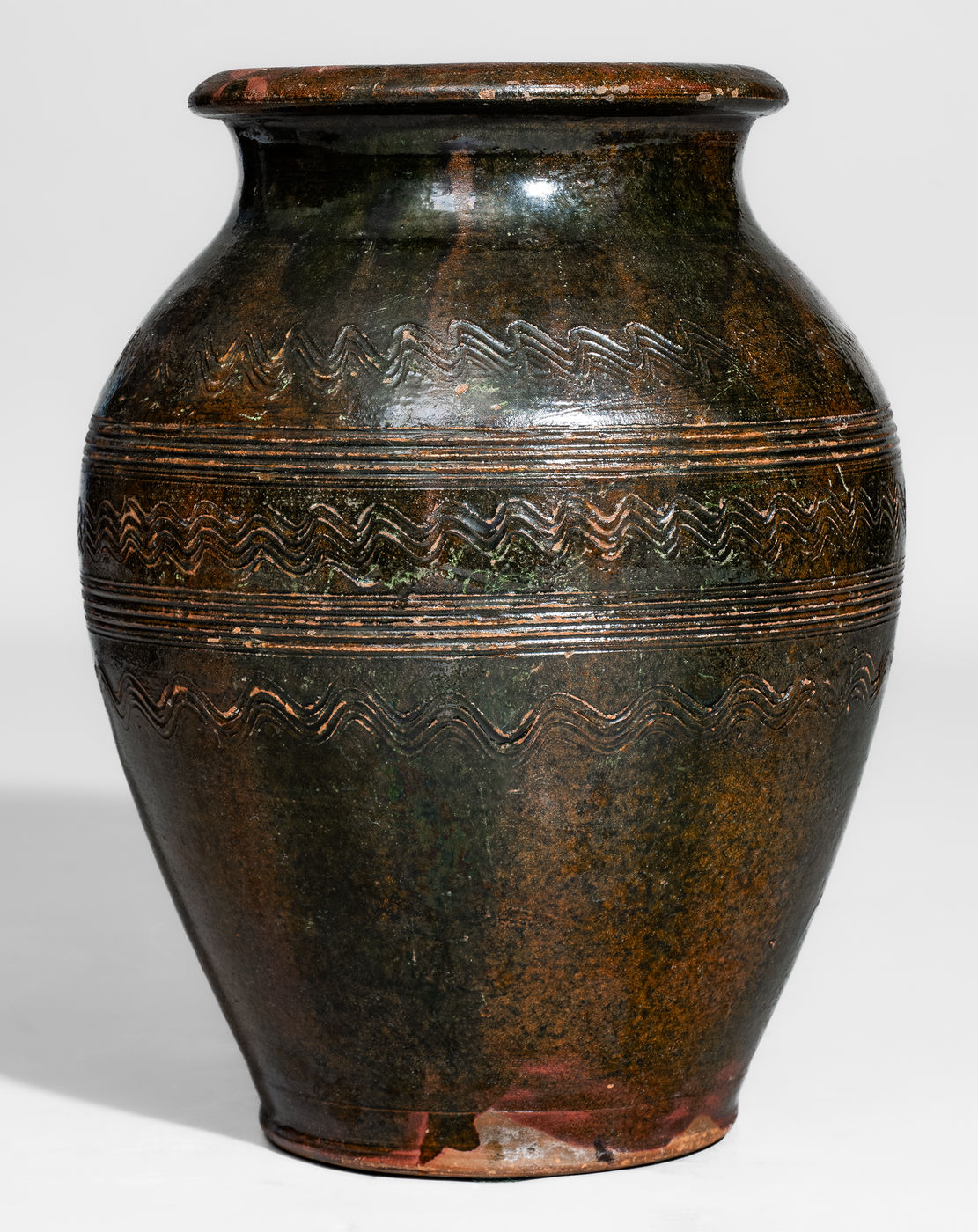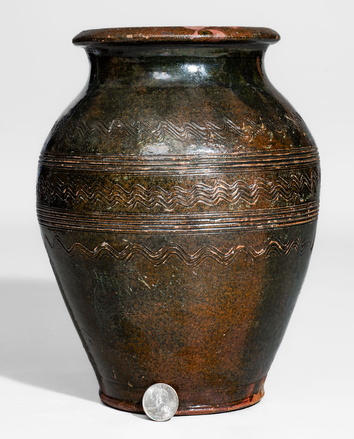 ×Rare Copper-Glazed Redware Jar w/ Elaborate Incised Decoration, Eastern TN or Southwestern VA
