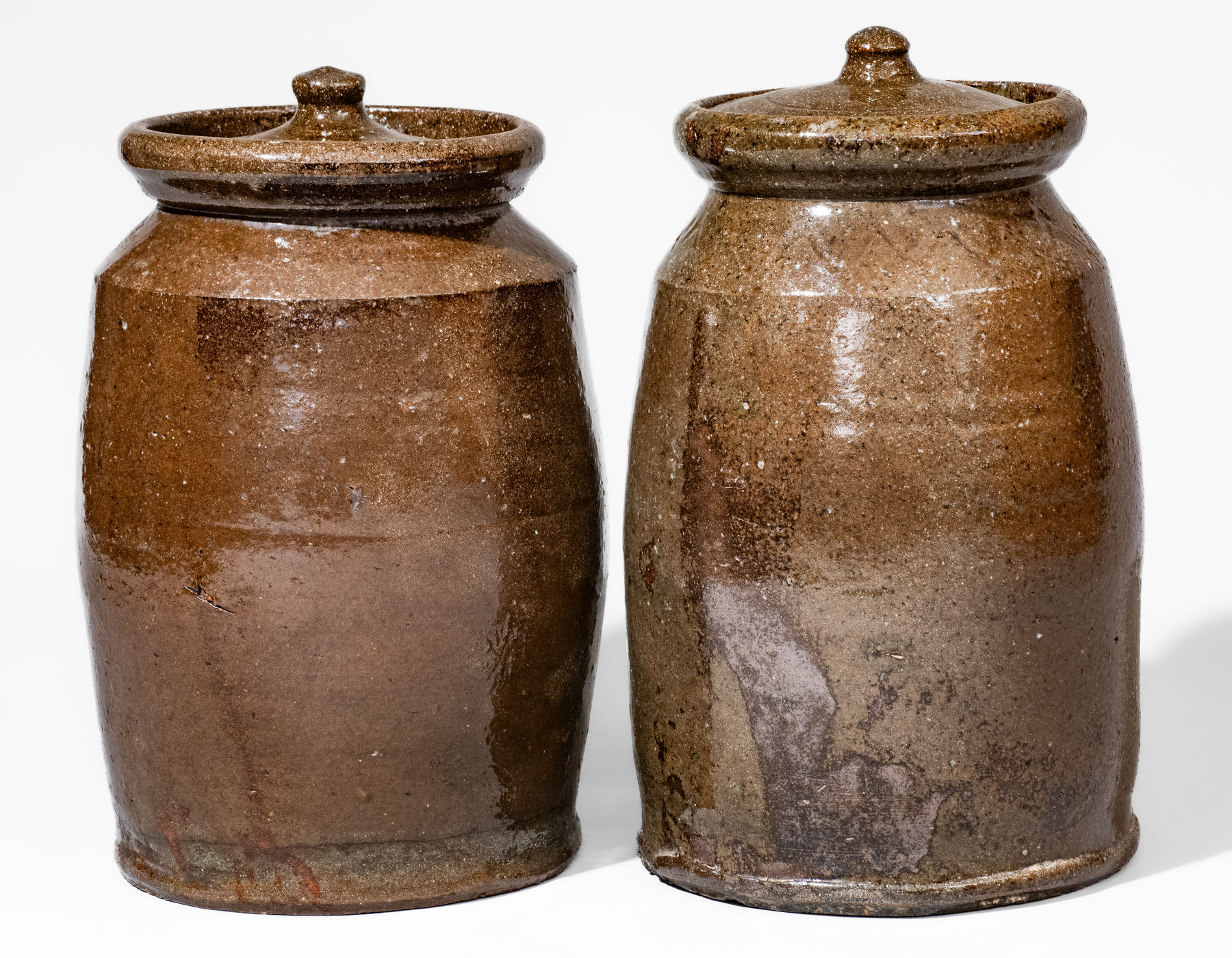 ×Two Alkaline-Glazed Stoneware Jars w/ Lids, possibly Bland County, Virginia