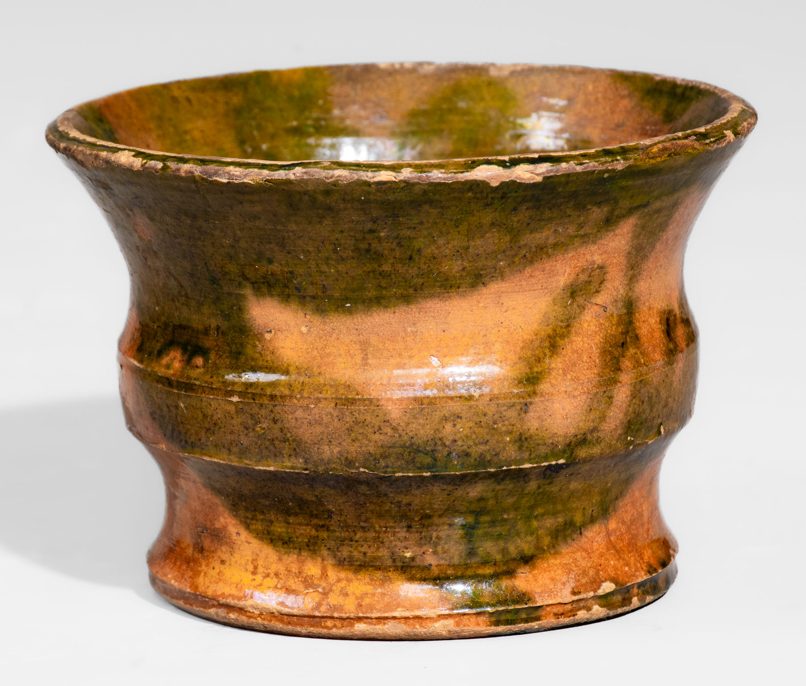 Very Rare Small-Sized Copper-Slip-Decorated Redware Vessel, probably Greene County, TN origin, circa 1820-1860, flaring form with footed base and squared midsection, decorated around the exterior with two rows of brushed copper-slip drape motifs and on the interior with looser, splashed drapery, all under a clear lead glaze. Color and brushwork are closely-related to the work of Greene County potter, Christopher Alexander Haun (1821-1861). Incised wavy line treatment to underside. Unusual form, likely serving as a master salt or sugar bowl. Exhibited: Tennessee Turned, Earthenware and Stoneware Made in East Tennessee 1800-1900, Museum of East Tennessee History, May 16-October 30, 2011. Literature: Illustrated in Wahler, Tennessee Turned, Earthenware and Stoneware Made in East Tennessee 1800-1900, Part One, p. 68, fig. 66, p. 88, pl. 10, p. 200, fig. 66. Provenance: Found at a yard sale in downtown Greeneville, Greene County, TN. Wear to rim. A thin 2" crack from rim. A 1 1/2" surface line at base, not visible on interior. Professionally-restored rim chips. A professionally-restored base chip. Wear to rim and foot. Other minor surface wear. H 3 3/8" ; Diam. 4 7/8".
