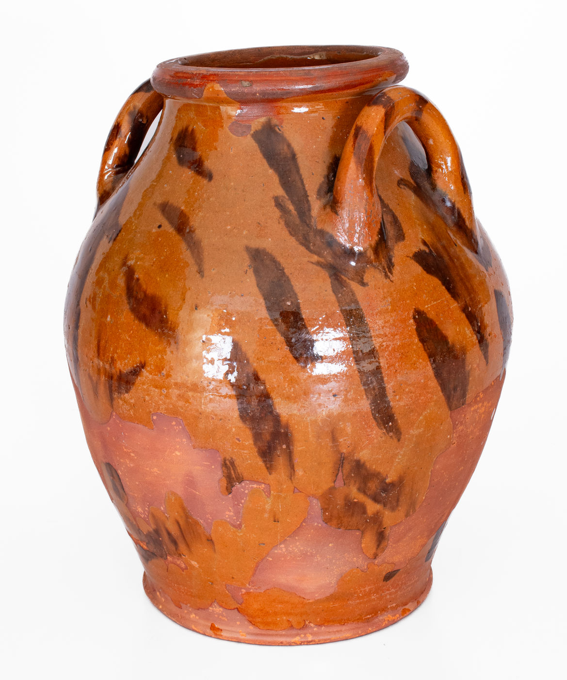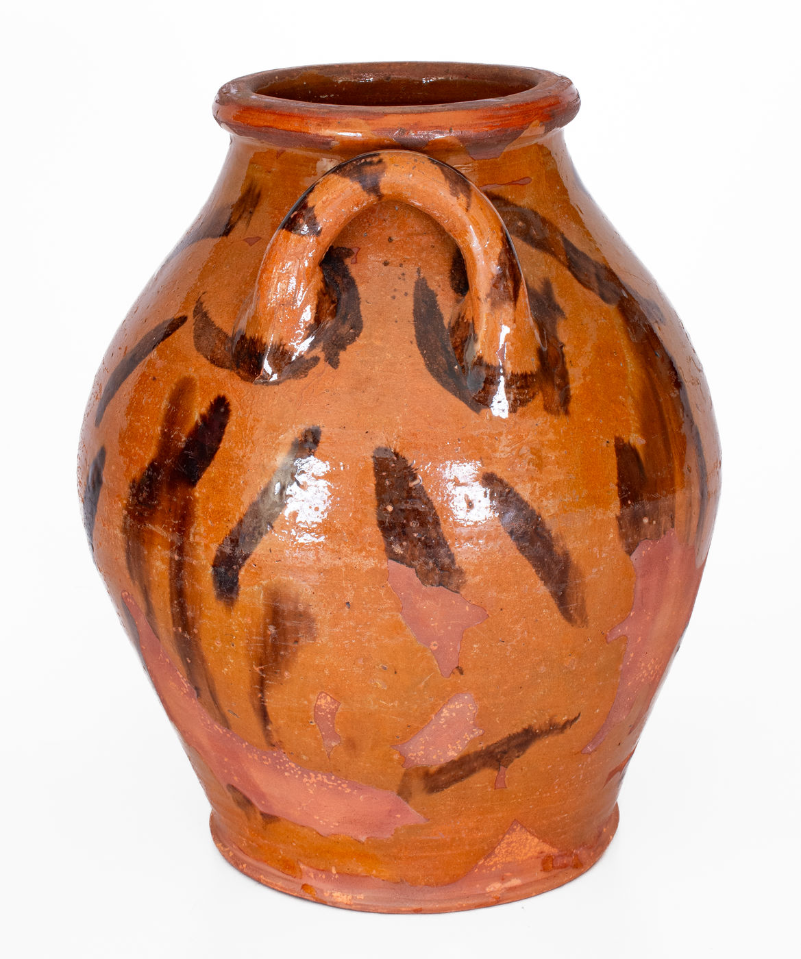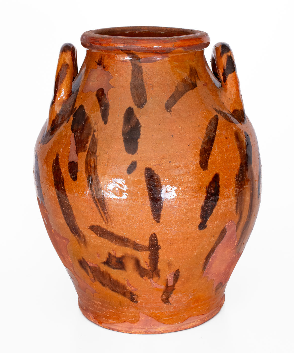 ×Rare attrib. Cain Pottery, Sullivan County, TN Open-Handled Redware Jar w/ Elaborate Manganese Slashes