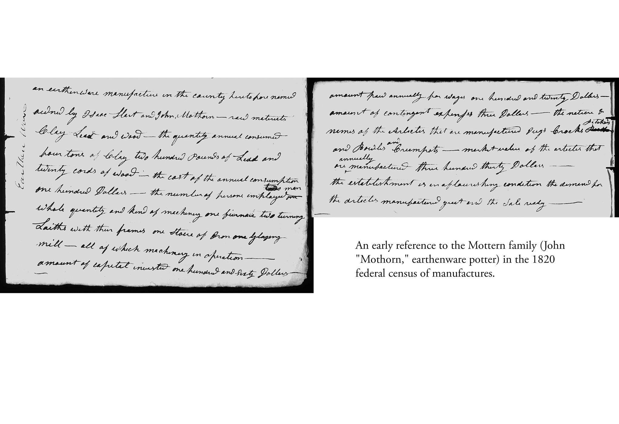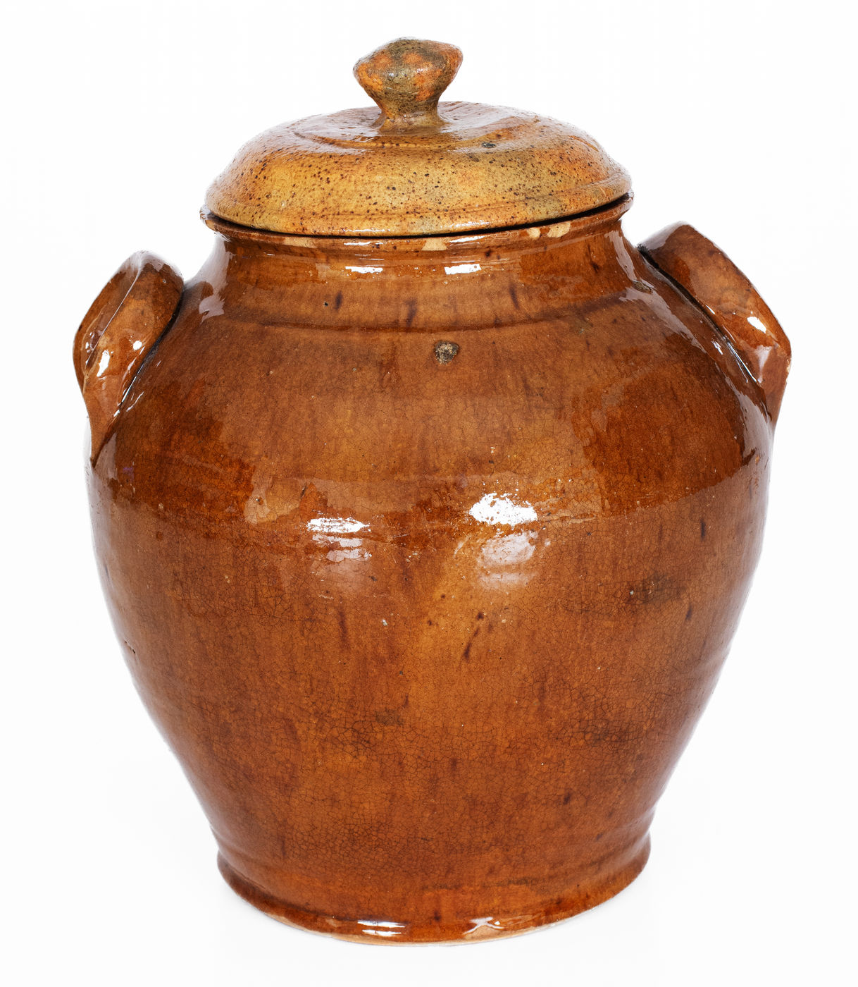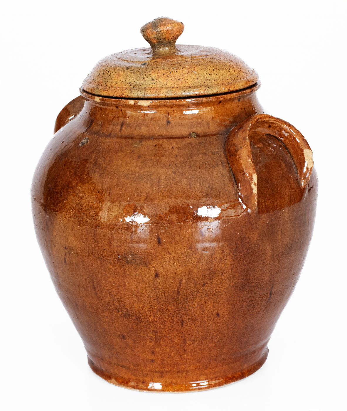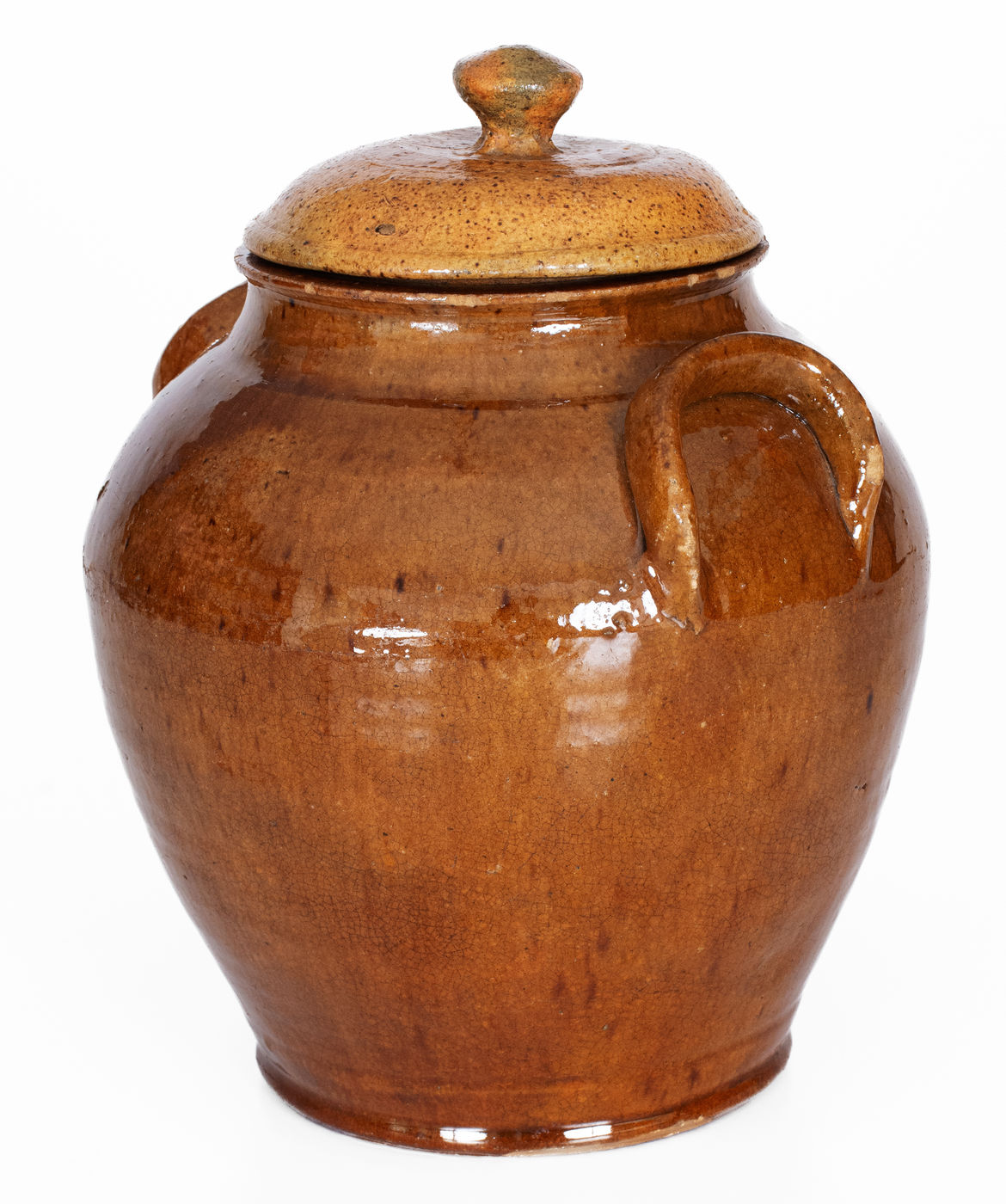 Exceedingly Rare and Important Glazed Redware Jar with Lid, Inscribed "WHM," William Henry Mottern at the Mottern Pottery, Carter County, TN, circa 1860-1880, ovoid jar with footed base, tooled shoulder, thin, flattened rim, and distinctive horseshoe-shaped handles with pointed terminals. Surface covered in a mottled brownish lead-based glaze colored with iron or manganese. Underside incised with the script initials, "WHM," for Carter County, Tennessee, potter, William Henry Mottern. Includes fitting domed lid with a clear lead glaze creating a mottled, buff-to-pale olive surface with iron flecking. This lid, however, is not illustrated with the jar in Wahler's book, Tennessee Turned, so whether or not it is original to the jar is unknown. This vessel is significant for its initialed signature as markings of any kind identifying makers are essentially unknown in Carter County pottery. Exhibited: Tennessee Turned, Earthenware and Stoneware Made in East Tennessee 1800-1900, Museum of East Tennessee History, May 16-October 30, 2011. Literature: Illustrated in Wahler, Tennessee Turned, Earthenware and Stoneware Made in East Tennessee 1800-1900, Part One, p. 34, fig. 20 and p. 191, fig. 20. Wahler states the following in her book regarding this jar: "William H. Mottern handwriting on 1910 deed supports attribution" (Wahler, p. 191). Provenance: Originally found in Carter County, TN. Jar with shallow chipping and wear to rim, a shallow chip and wear to each handle, a small in-the-firing contact mark to shoulder, and extremely minor surface wear to body of jar. Lid in excellent, essentially as-made condition. H (excluding lid) 7 7/8".