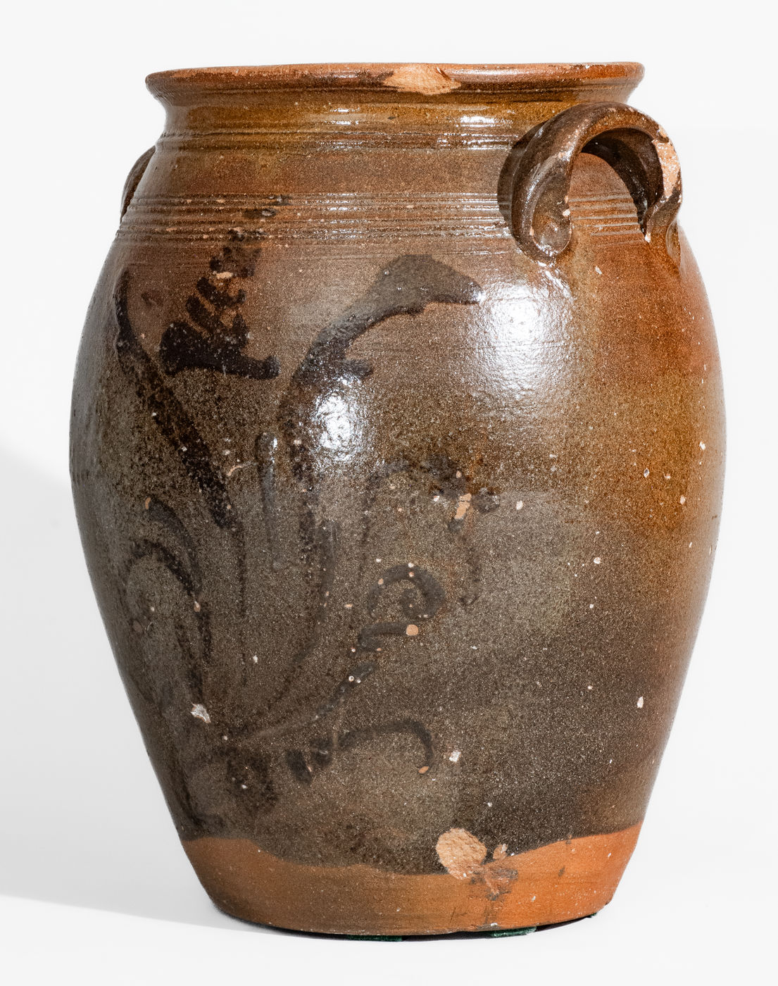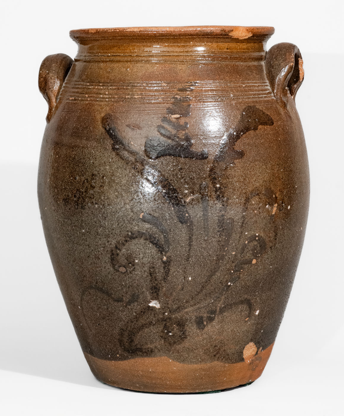 Very Rare Glazed Redware Jar with Manganese Slip Floral Decoration, attributed to the Mottern Pottery, Carter County, TN, circa 1850-1880, ovoid jar with heavily-tooled shoulder, flaring semi-rounded rim, and arched lug handles with depressed terminals, the front decorated in manganese slip with a large and elaborate flowering vine design under a clear lead glaze. Interior coated in a clear lead glaze. Among the most extravagantly-decorated examples of Mottern redware to be documented. Literature: p, 38, fig. 26. Exhibited: Tennessee Turned, Earthenware and Stoneware Made in East Tennessee 1800-1900, Museum of East Tennessee History, May 16-October 30, 2011. Literature: Illustrated in Wahler, Tennessee Turned, Earthenware and Stoneware Made in East Tennessee 1800-1900, Part One, p. 38, fig. 26, p. 44, pl. 2, and p. 192, fig. 26. Provenance: Originally found in Carter County, Tennessee. Purchased from Marcus King. Rim with wear and a few chips. Proper left handle with a shallow 7/8" chip and other minor chips. A shallow 3/4" in-the-making base chip. Glazed surface survives in very nice condition with only minor wear and minor in-the-firing flaws. A tight Y-shaped line across underside. H 12 1/4".