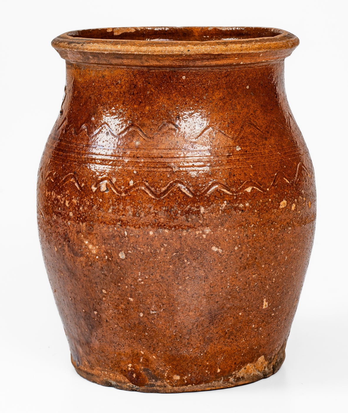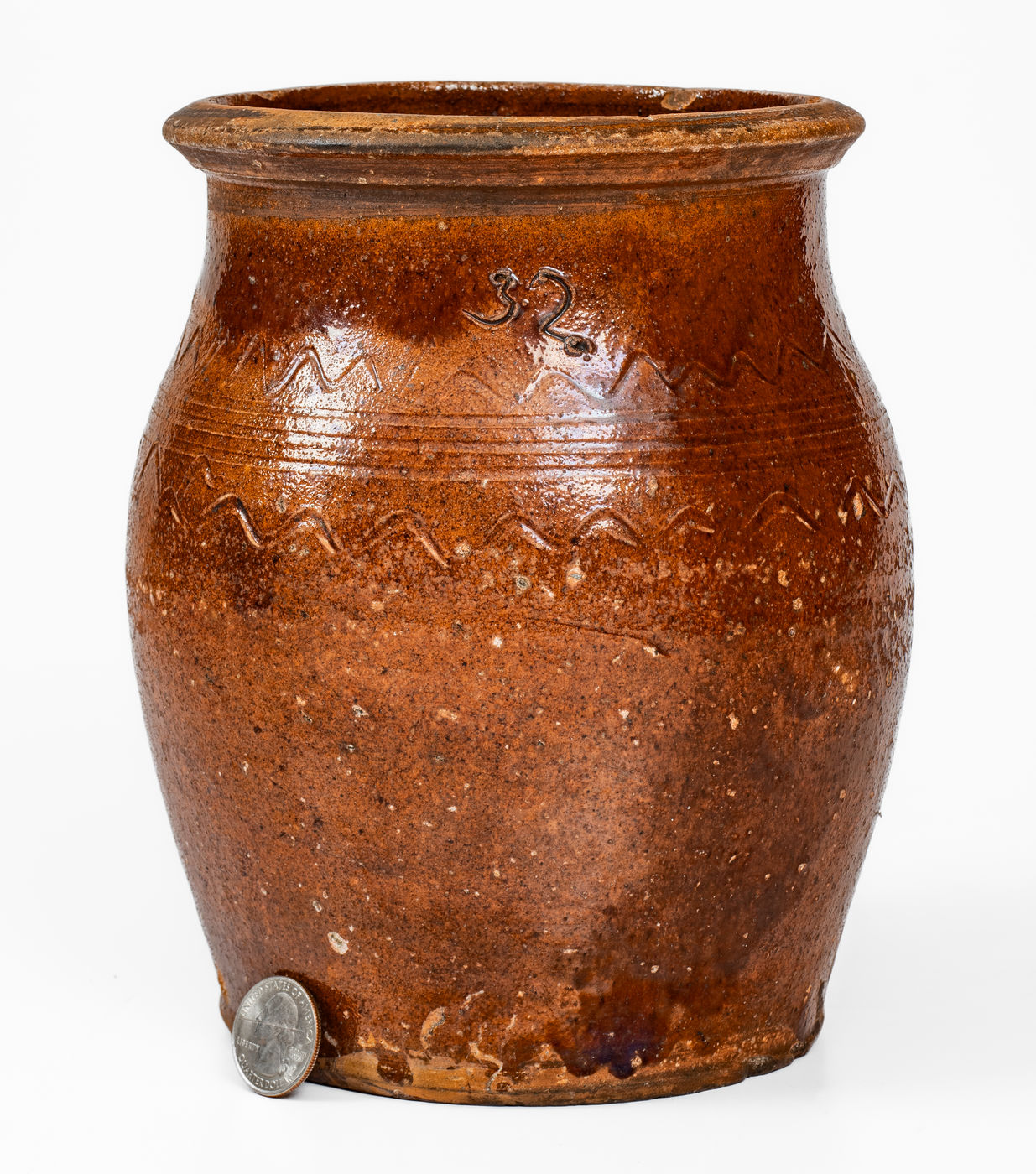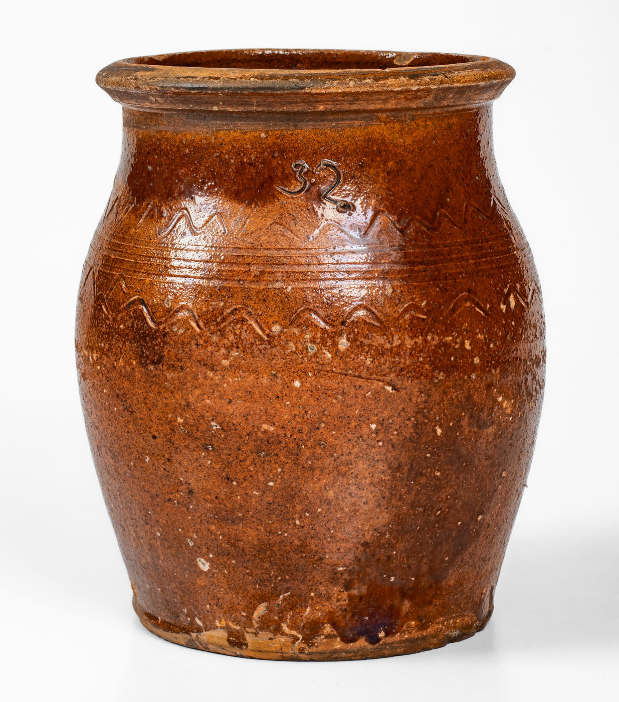 ×Redware Jar w/ Incised Sine Wave Decoration, Inscribed "32," probably Carter County, Tenn.