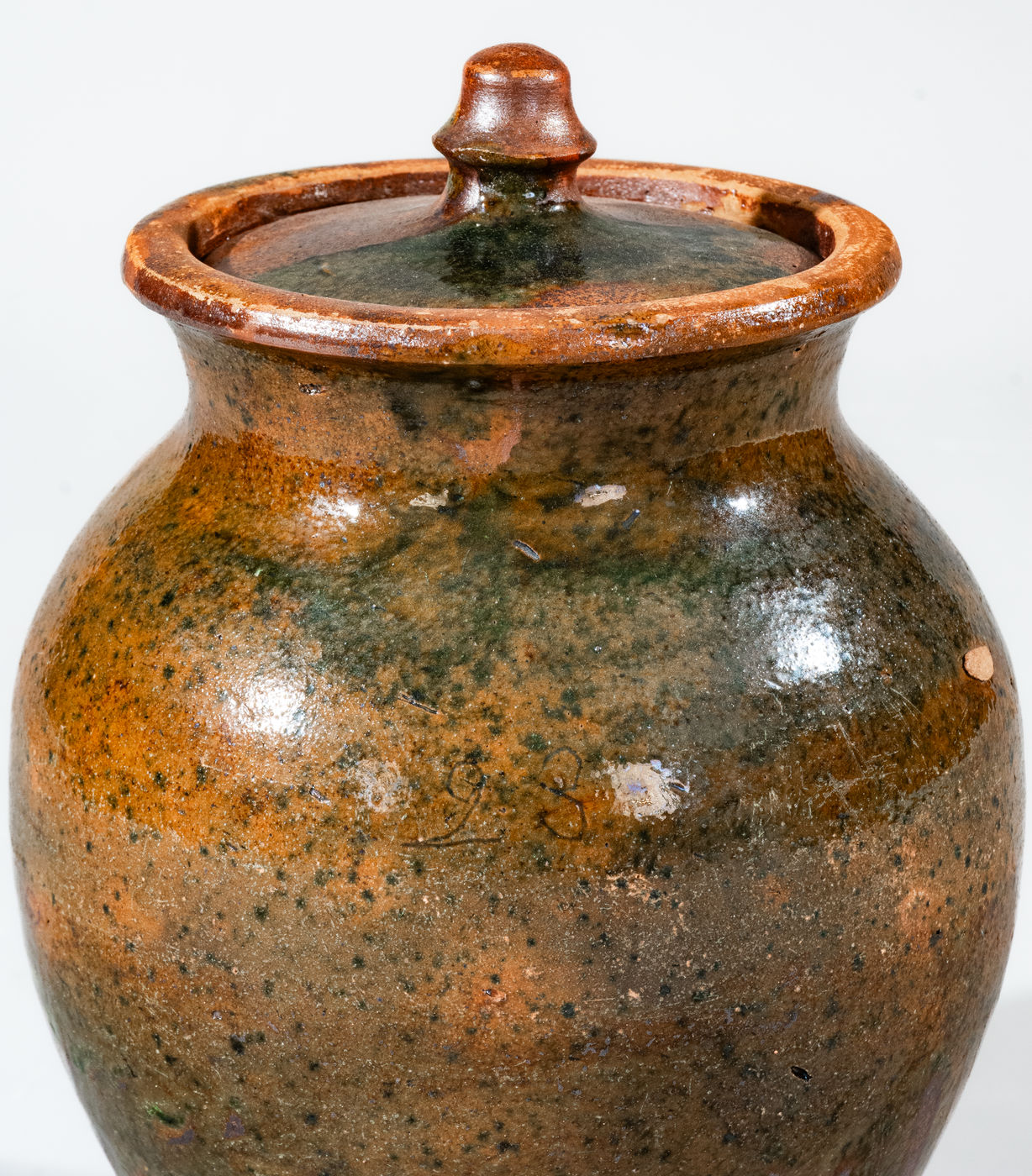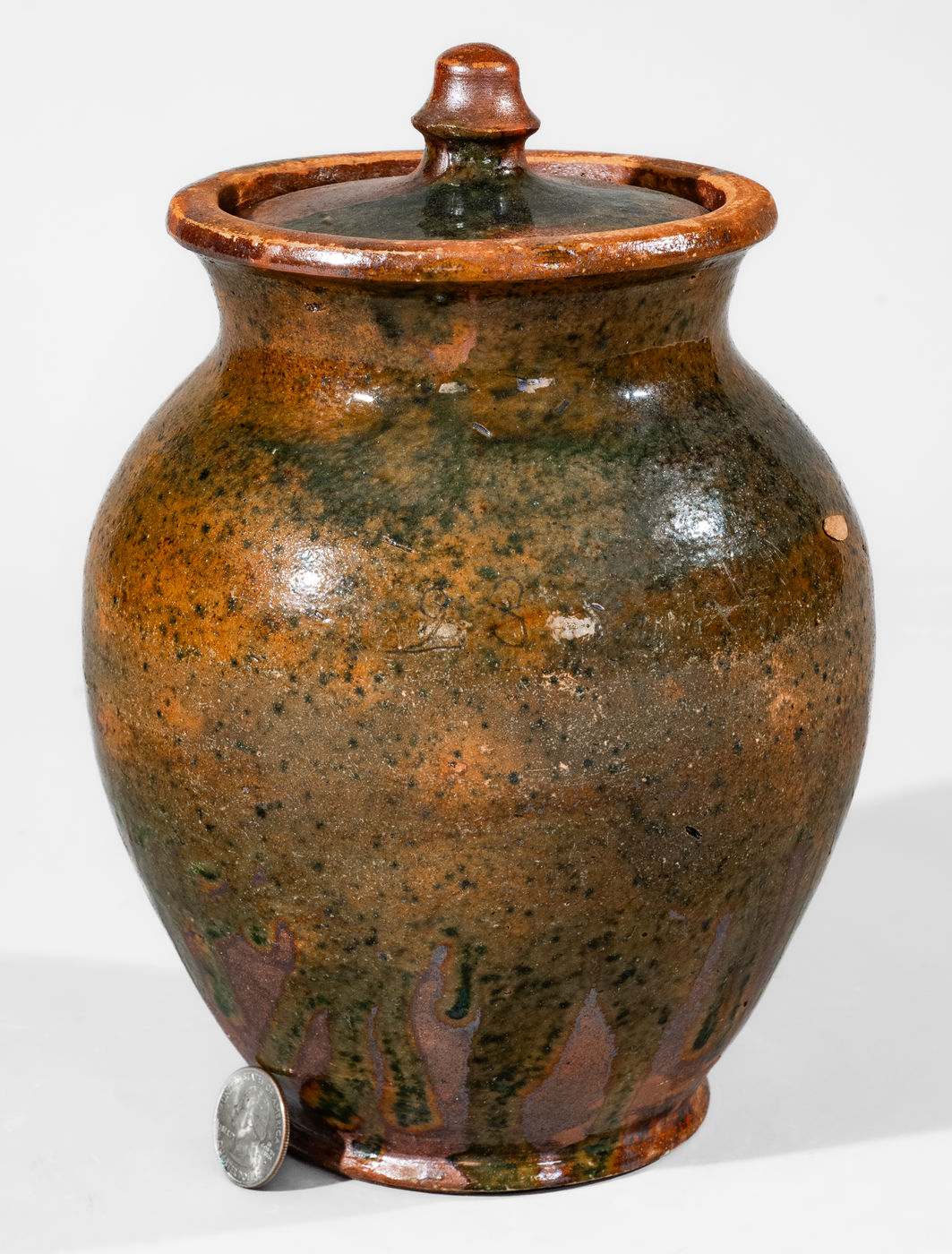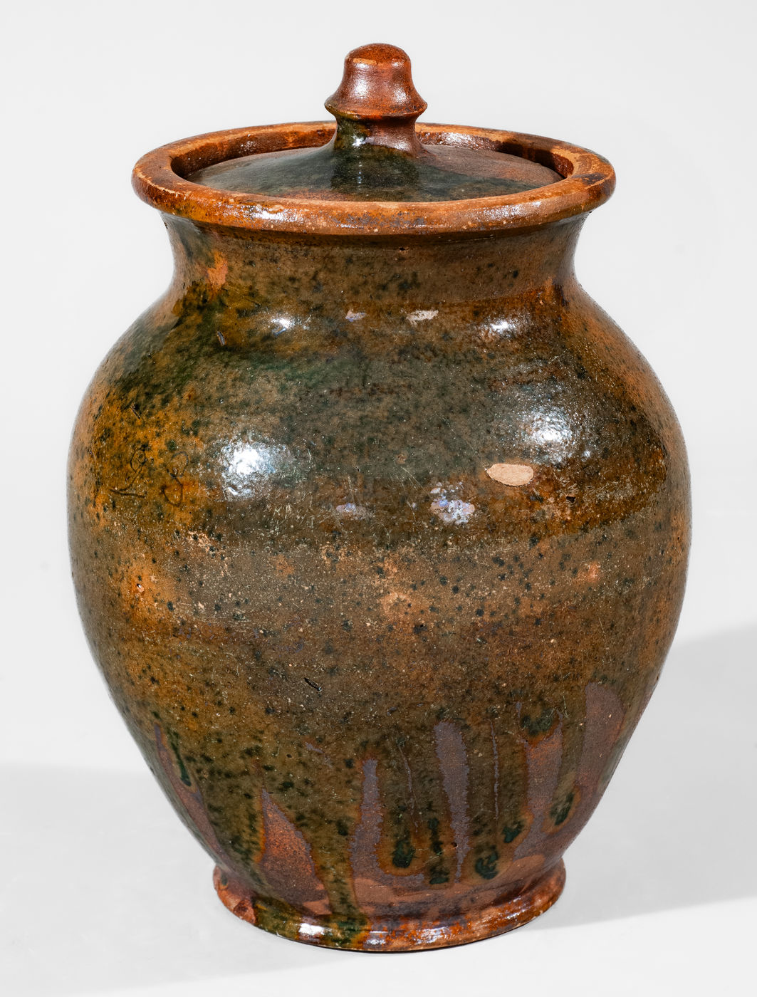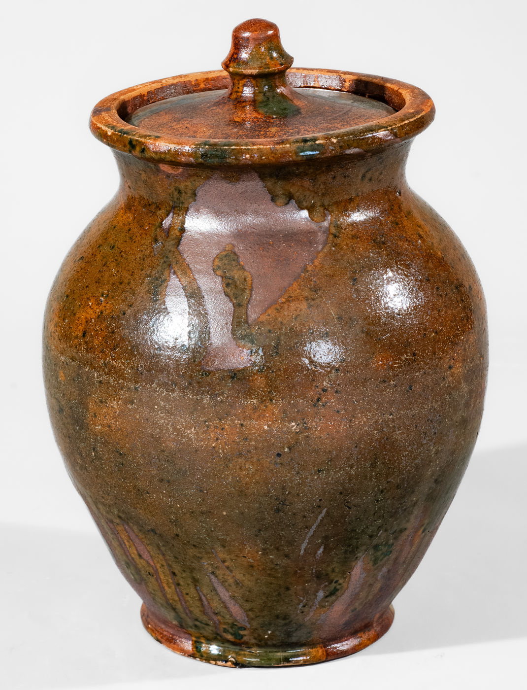 Rare Lidded Redware Jar with Copper Glaze, Greene County, TN origin, circa 1820-1860, ovoid jar with footed base and flared collar with semi-rounded rim, the exterior surface decorated with a dramatic splashed lead-and-copper glaze with appealing runs, applied over a lead-and-manganese-glazed ground. Lead-and-manganese-glazed interior. Includes original lid with matching glaze scheme. Incised "23" at shoulder of jar and "9" on lid. Excellent form and glaze, remarkably retaining its original lid. Exhibited: Made in East Tennessee: Pottery, Museum of East Tennessee History, 1996; Tennessee Turned, Earthenware and Stoneware Made in East Tennessee 1800-1900, Museum of East Tennessee History, May 16-October 30, 2011. Literature: Illustrated in Great Road Style: The Decorative Arts Legacy of Southwest Virginia & Northeast Tennessee, p. 136; Illustrated in Wahler, Tennessee Turned, Earthenware and Stoneware Made in East Tennessee 1800-1900, Part One, p. 48, fig. 35, p. 88, pl. 10, and p. 194, fig. 35. Provenance: Purchased in Greeneville, Greene County, TN. Jar with professionally-restored chips to foot and a tiny professionally-restored glaze flake to rim. Some additional, typical unrestored wear to rim and inner rim for lid. Unrestored flakes to interior base. A small piece of adhered clay at shoulder. Lid with professionally-restored flakes/wear to edge, a professionally-restored flake to knob, and minor professional restoration to surface. H (including lid) 8 3/4".