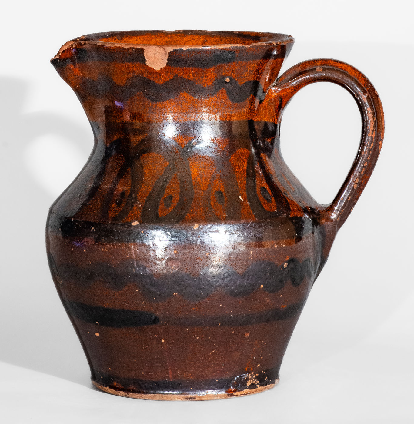 ×Outstanding Redware Pitcher w/ Looping Manganese Slip Decoration, Tennessee or Virginia