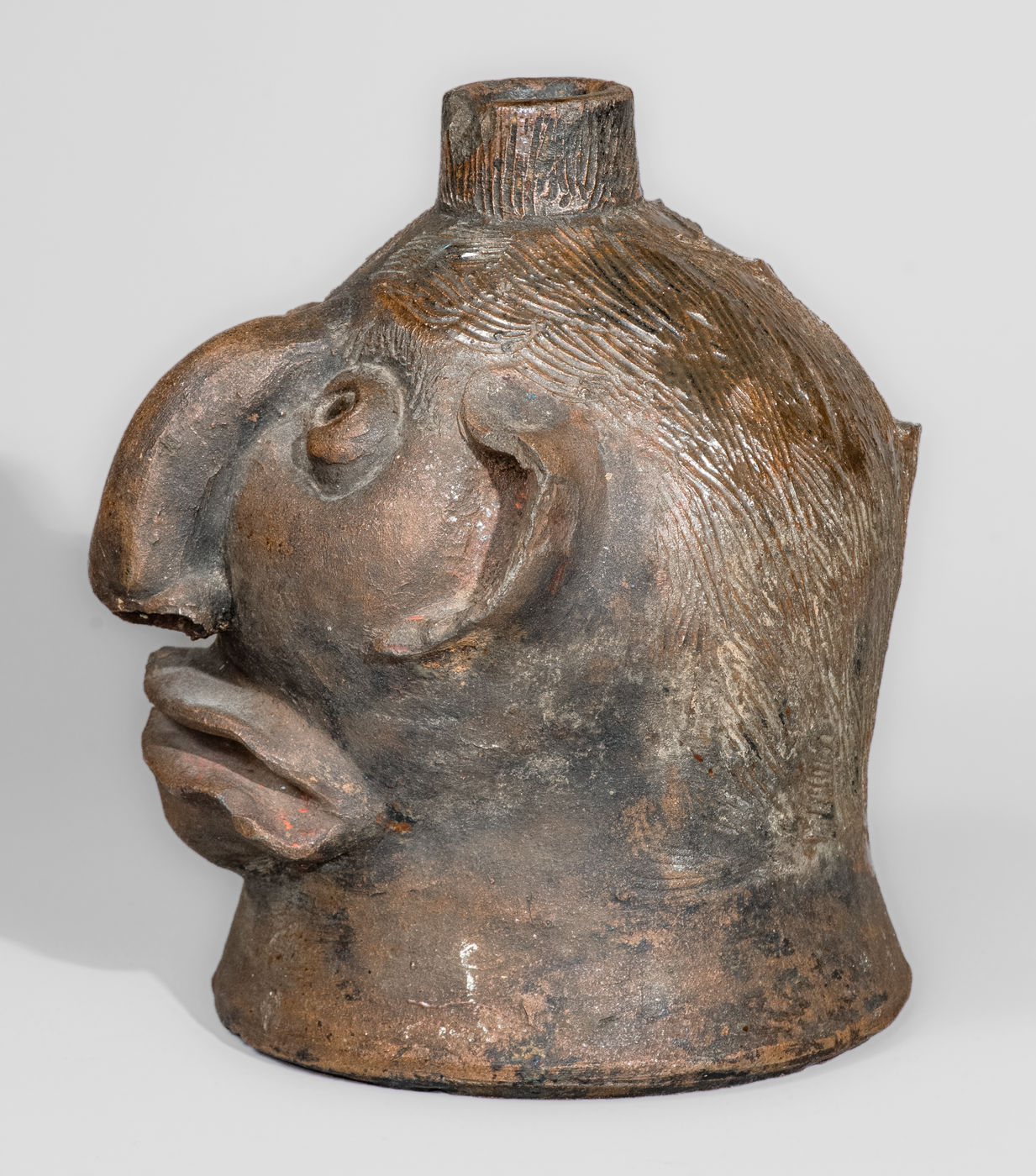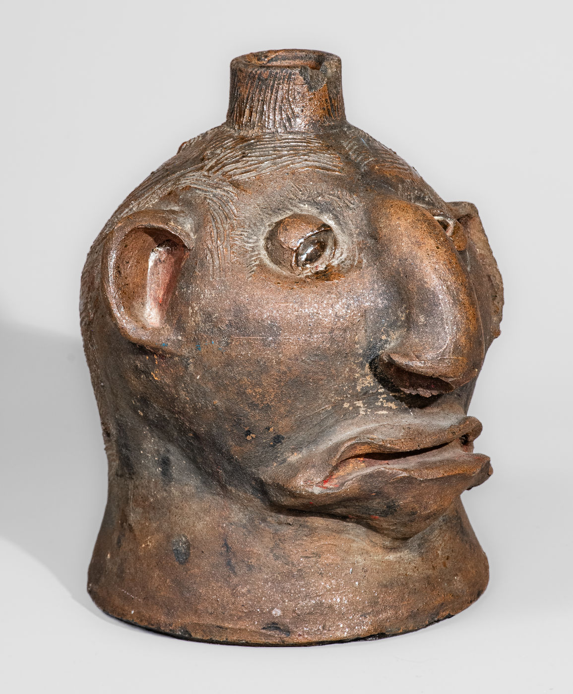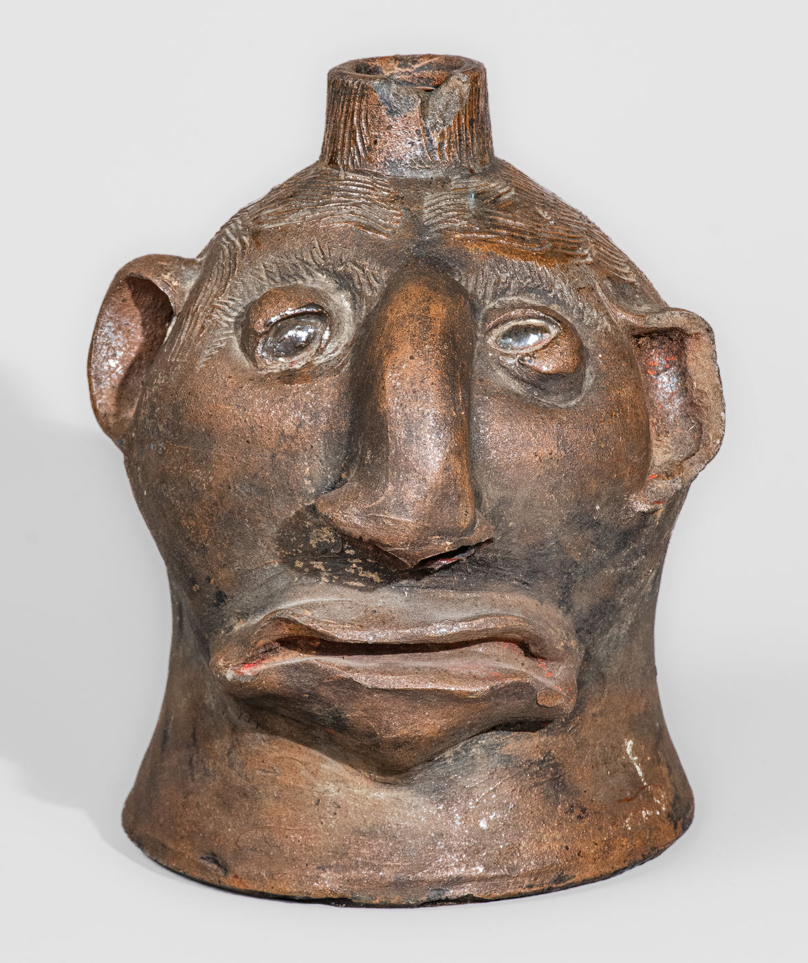 Very Rare Albany-Slip-Decorated Stoneware Face Jug, attributed to Charles P. Ferguson, Barrow County, GA, circa 1880-1890, ovoid jug with flared base and tapering spout, decorated with a large hand-modeled and applied clay face, including eyes with impressed oval pupils, large Roman nose with formed nostrils, small C-scroll ears, an open mouth with wavy, frowning lips. Heavily-combed incising forms hair on the figures head and spout, while short incised strokes create eyebrows on the face. The surface is unglazed, decorated with glossy brown Albany slip highlights to the head and hair. Recognizable by its squat form, distinctive facial features, and heavily-incised hair, this work is one of a small number of face jugs known by the hand of Barrow County, Georgia potter, Charles Ferguson. Ferguson's grandfather, Charles H. Ferguson (1793-1878), established the family pottery in Barrow County in 1846, after working for Abner Landrum in Pottersville, South Carolina. This connection to South Carolina's Edgefield District may have influenced the Ferguson family in the production of face jugs after establishing their Georgia pottery. Nineteenth century face jugs from the state of Georgia are significantly rarer than their counterparts produced in South Carolina and Alabama. However, innovators, such as Charles Ferguson and members of the Hewell family, would inspire future generations to produce this form regularly within the state, a tradition continuing to this day. Literature: For related examples, see Burrison, Brothers in Clay: The Story of Georgia Folk Pottery, pp. 74, 75, and 227. Provenance: A recently-surfaced example, which descended in the family of the consignor. Missing handle. A 1/2" in-the-firing ping to reverse. A 7/8" x 1/2" spout chip. A long flake spaning the length of the proper left ear. Some old, dark staining to surface. H 8".