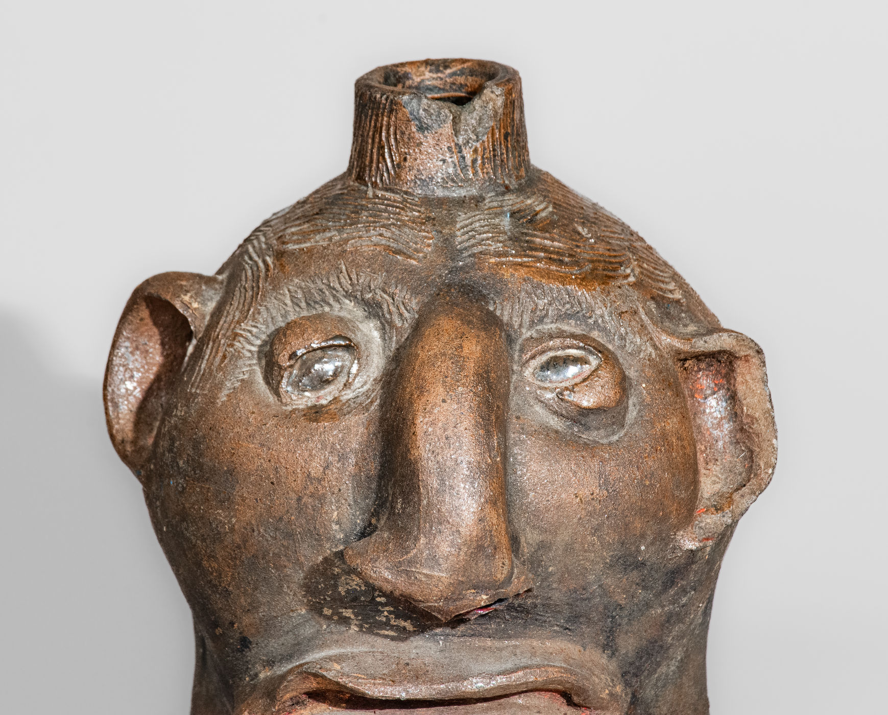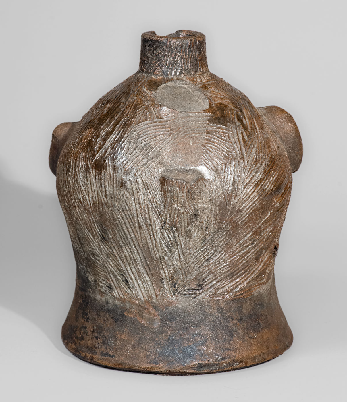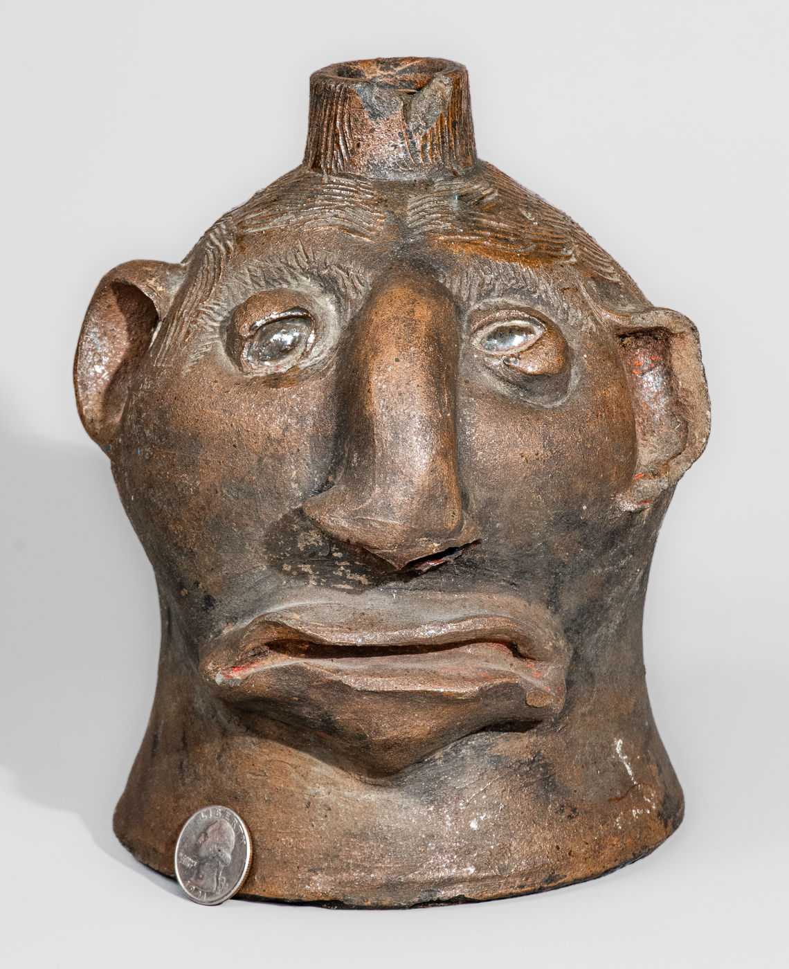 Very Rare Albany-Slip-Decorated Stoneware Face Jug, attributed to Charles P. Ferguson, Barrow County, GA, circa 1880-1890, ovoid jug with flared base and tapering spout, decorated with a large hand-modeled and applied clay face, including eyes with impressed oval pupils, large Roman nose with formed nostrils, small C-scroll ears, an open mouth with wavy, frowning lips. Heavily-combed incising forms hair on the figures head and spout, while short incised strokes create eyebrows on the face. The surface is unglazed, decorated with glossy brown Albany slip highlights to the head and hair. Recognizable by its squat form, distinctive facial features, and heavily-incised hair, this work is one of a small number of face jugs known by the hand of Barrow County, Georgia potter, Charles Ferguson. Ferguson's grandfather, Charles H. Ferguson (1793-1878), established the family pottery in Barrow County in 1846, after working for Abner Landrum in Pottersville, South Carolina. This connection to South Carolina's Edgefield District may have influenced the Ferguson family in the production of face jugs after establishing their Georgia pottery. Nineteenth century face jugs from the state of Georgia are significantly rarer than their counterparts produced in South Carolina and Alabama. However, innovators, such as Charles Ferguson and members of the Hewell family, would inspire future generations to produce this form regularly within the state, a tradition continuing to this day. Literature: For related examples, see Burrison, Brothers in Clay: The Story of Georgia Folk Pottery, pp. 74, 75, and 227. Provenance: A recently-surfaced example, which descended in the family of the consignor. Missing handle. A 1/2" in-the-firing ping to reverse. A 7/8" x 1/2" spout chip. A long flake spaning the length of the proper left ear. Some old, dark staining to surface. H 8".