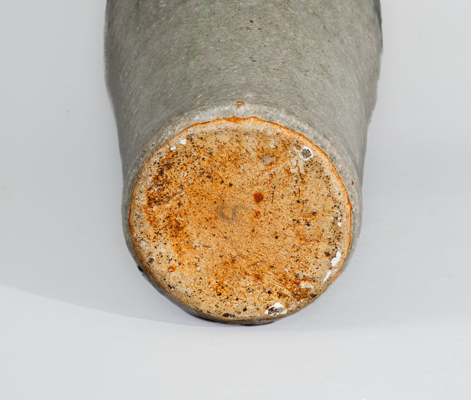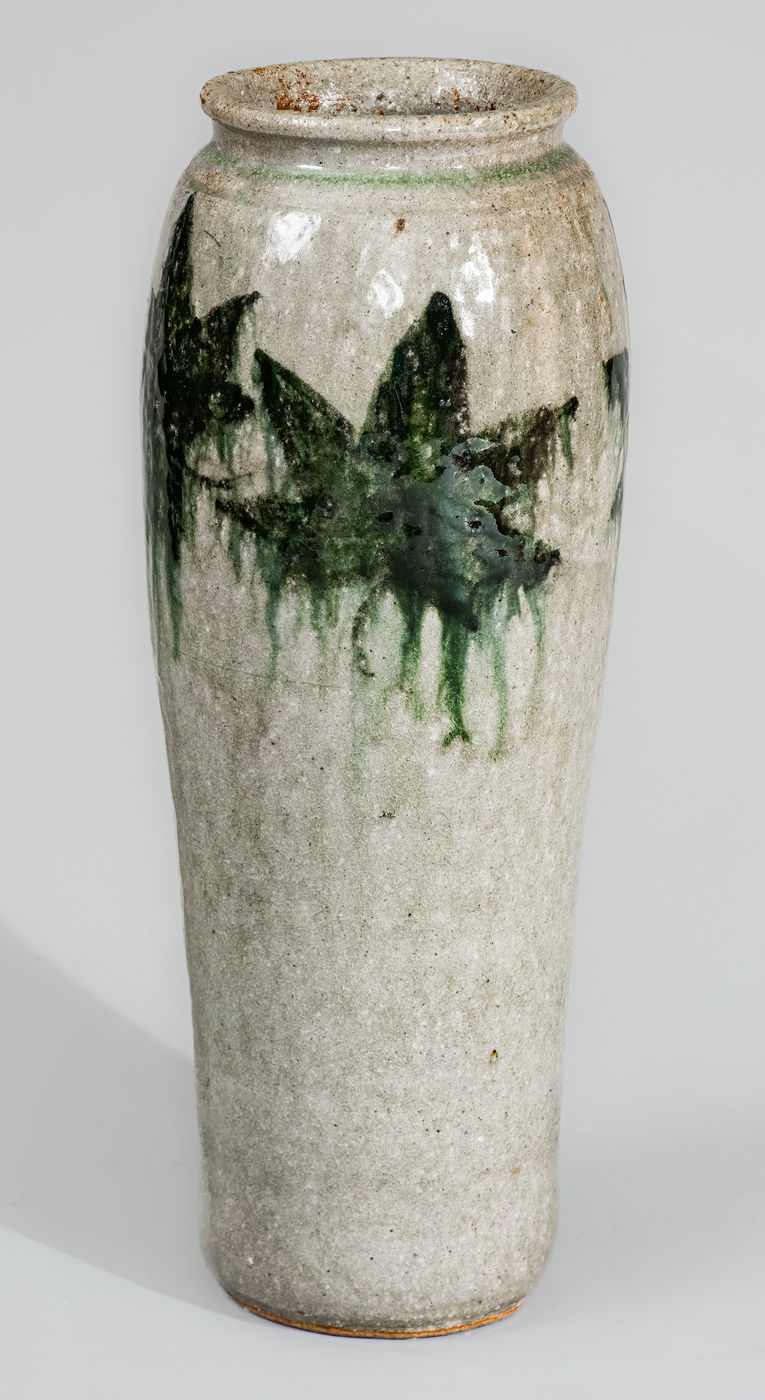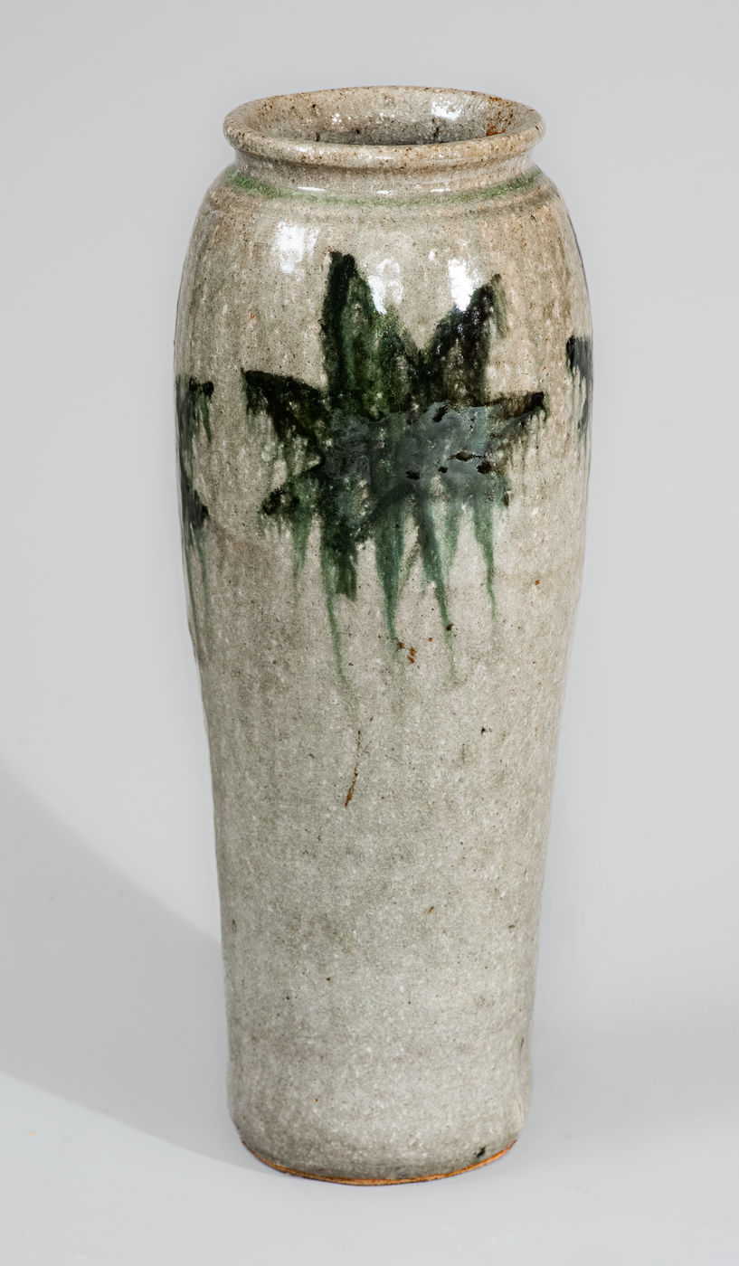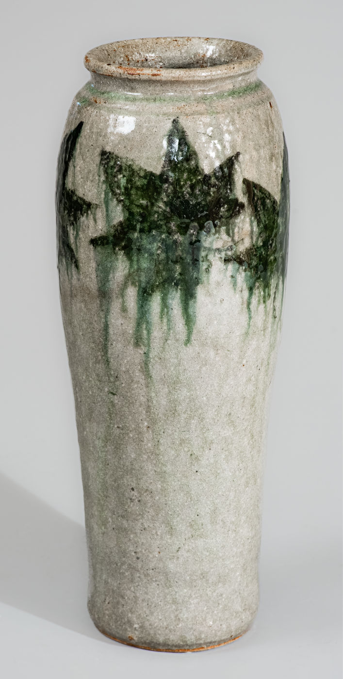 ×Rare Alkaline-Glazed Stoneware Vase w/ Green-Slip Maple Leaf Decoration, attrib. Arie Meaders, c1956-69