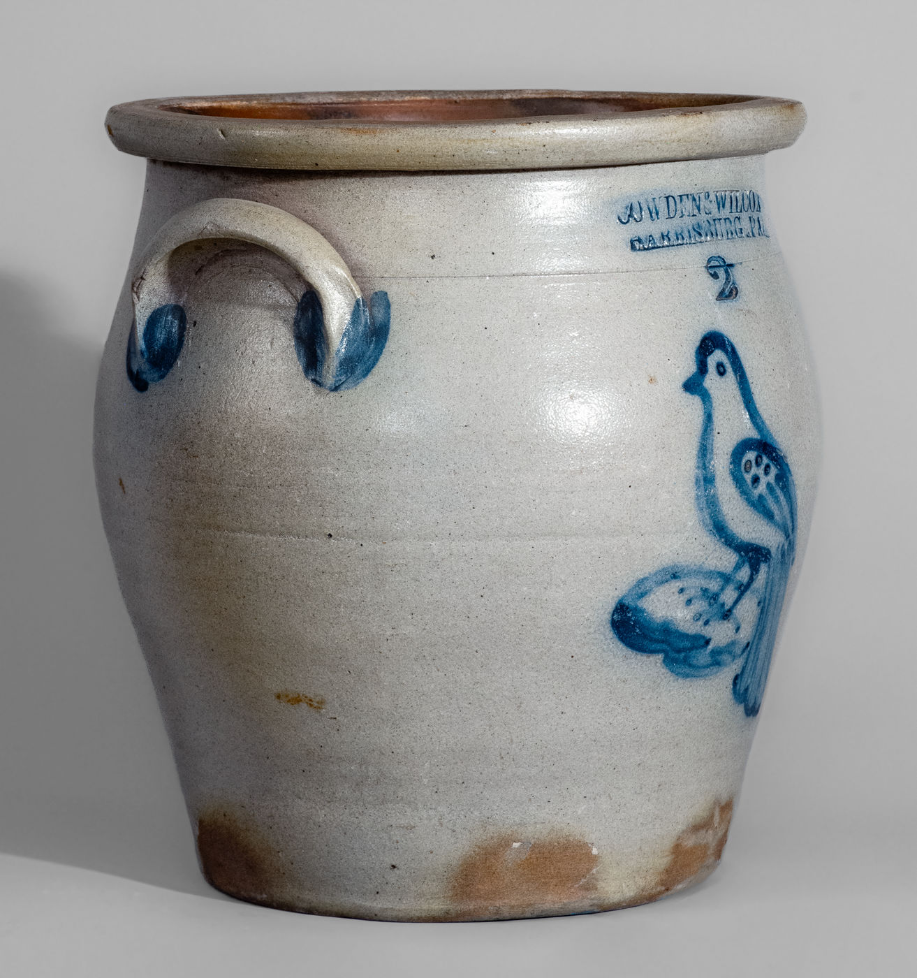 ×COWDEN & WILCOX / HARRISBURG, PA Two-Gallon Stoneware Jar w/ Cobalt Bird Decoration