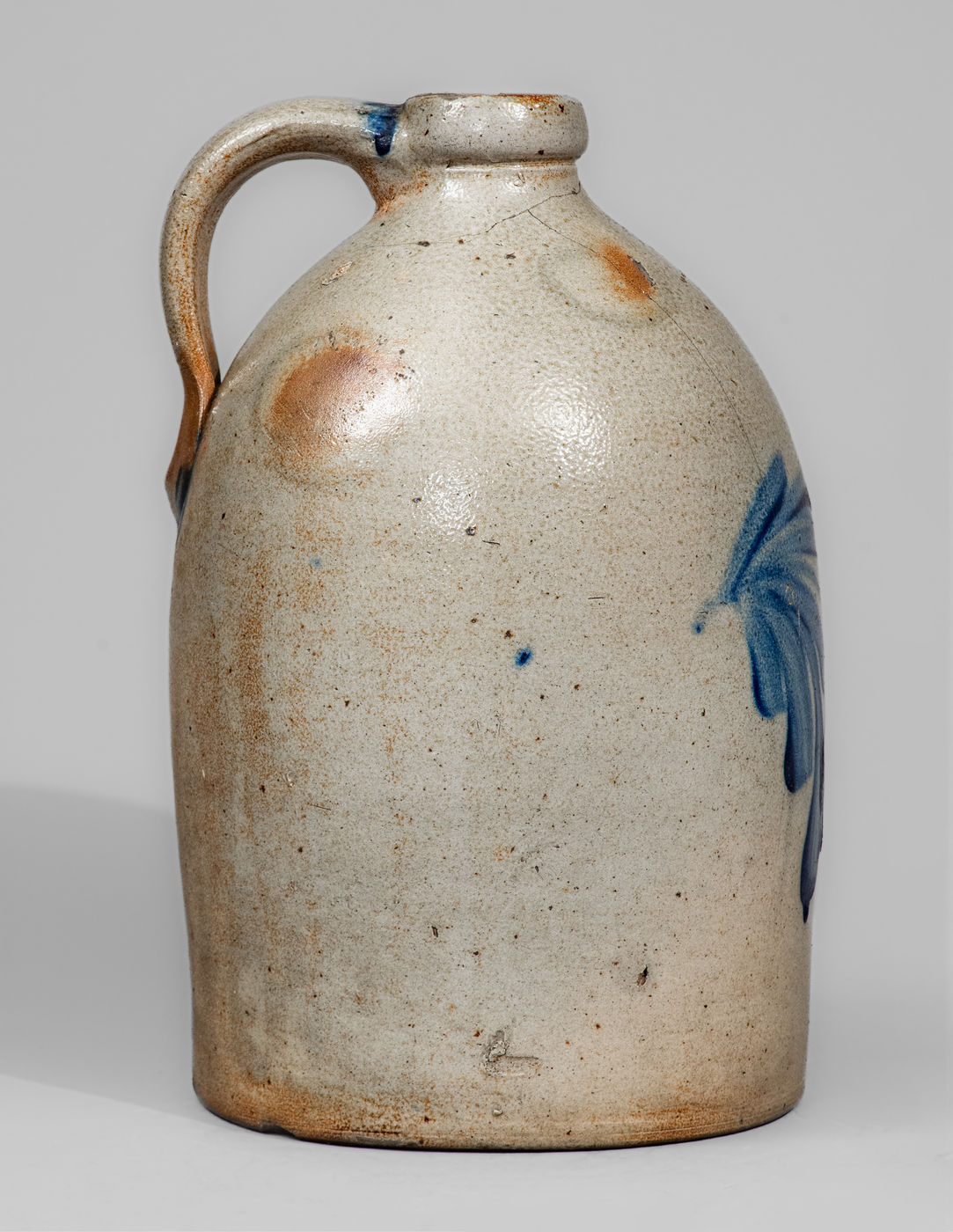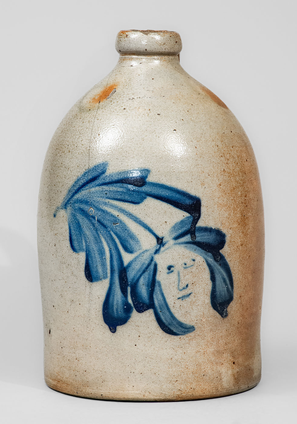 ×Very Rare One-Gallon Stoneware Jug w/ Cobalt Face-Within-Flower Decoration, attrib. M. & T. Miller, Newport, PA