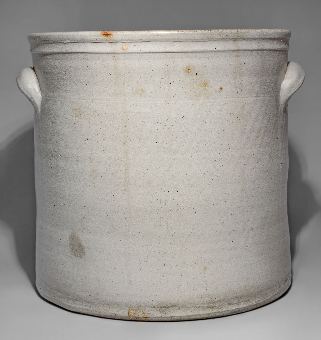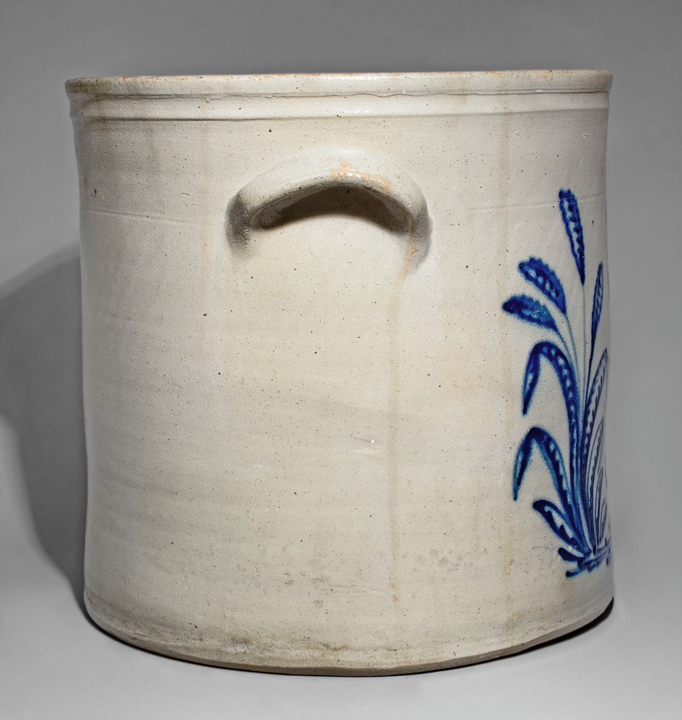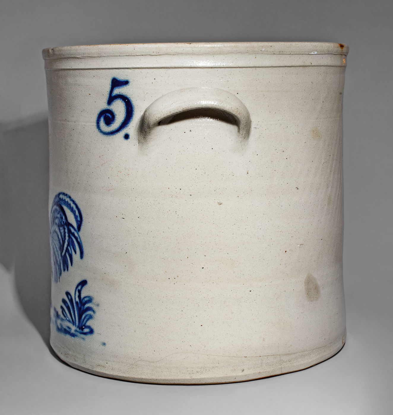 Outstanding Five-Gallon Stoneware Crock with Cobalt Rooster Scene, Stamped "JOHN BURGER. / ROCHESTER," NY State origin, circa 1860, cylindrical crock with tooled shoulder, semi-squared rim, and applied lug handles, decorated with a large slip-trailed design of a strutting rooster atop a well-detailed, shrubbed ground, facing a large cattail plant. Slip-trailed, scrolled "5." to shoulder. Brushed cobalt highlight to maker's mark. A popular subject in American folk art, this particular rendering of a rooster ranks among the very best in this country's early ceramic production. Replete with detailed feathering to the body and tail, flowing, hair-like feathers to the head and neck, and a pronounced comb, the bird is given attitude and personality with its confident stance and raised leg. The tail includes overlapping pointed feathers, a challenging treatment, characteristic of the realism and attention to detail with which Burger decorated his ware. The design, executed in bold, crisp cobalt accents a light-gray ground, reveals Burger as not only an expert decorator and pottery, but one capable of glazing and firing his work to perfection. This crock truly transcends its medium and reads much like an Audubon work or 19th century pastoral painting. A diagonal 6" line from rim. An approximately 10" horizontal line at base, extending 7" onto underside. Some staining. Some minor flakes to base. H 12 1/2".