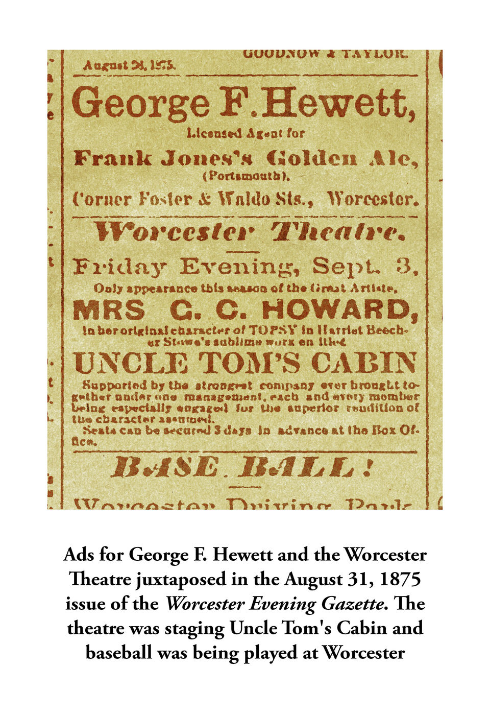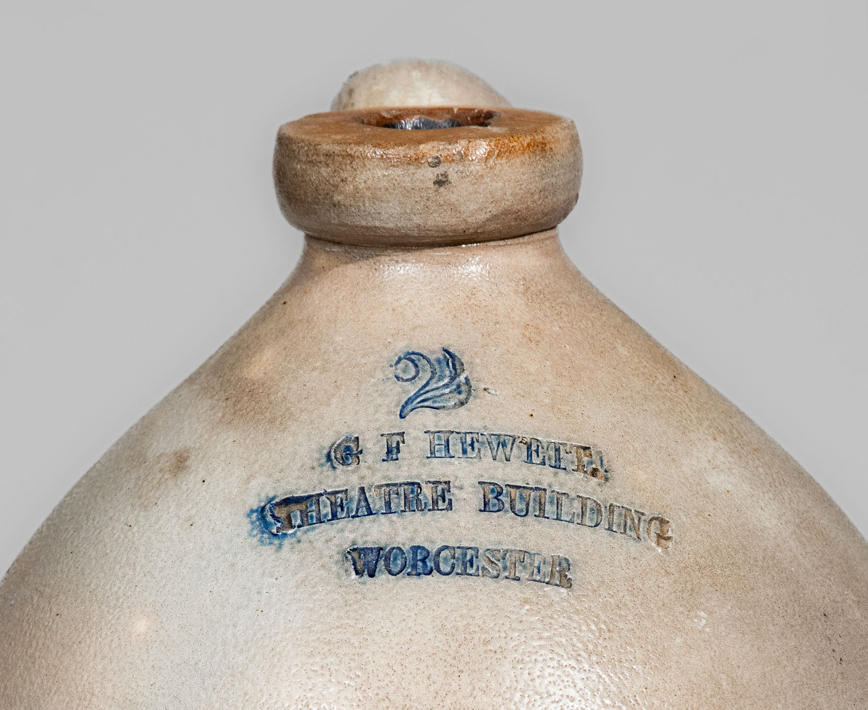 ×Rare G F HEWETT/ THEATRE BUILDING / WORCESTER, Mass. Stoneware Advertising Jug
