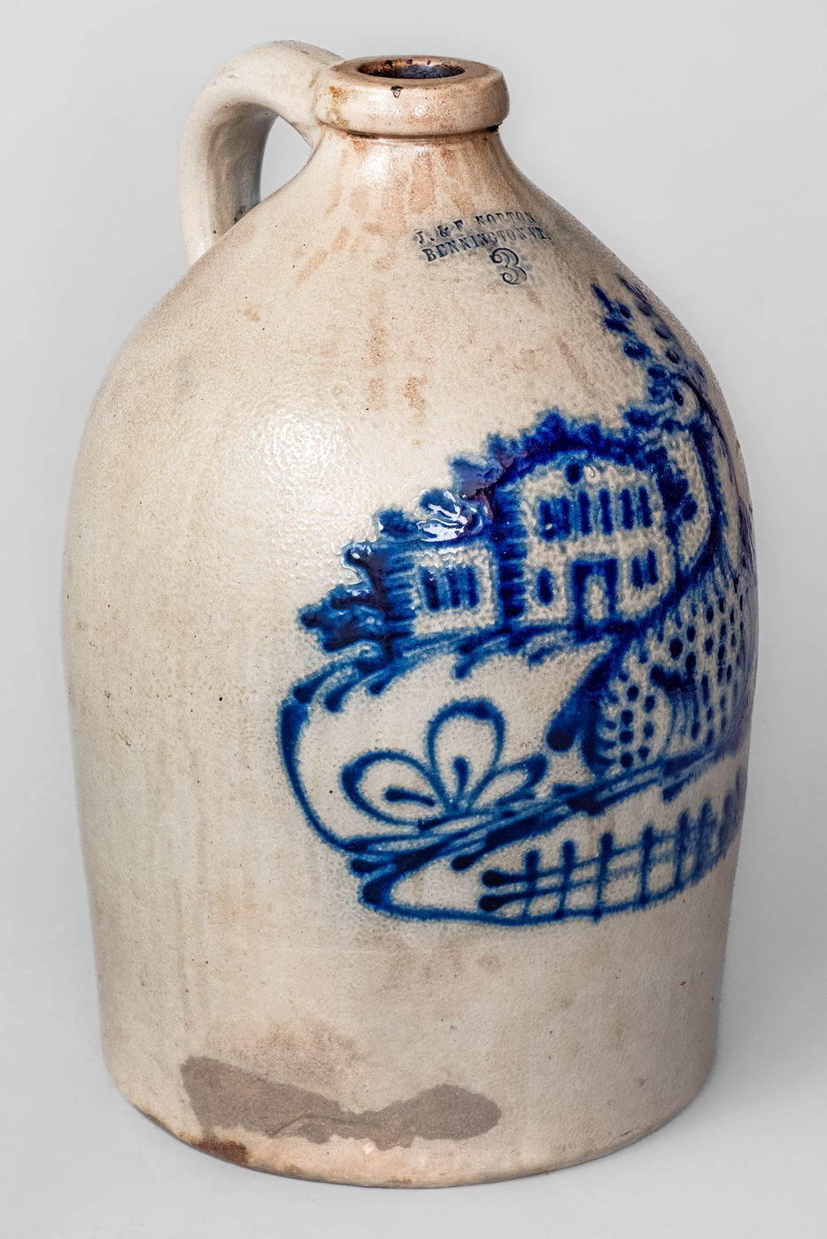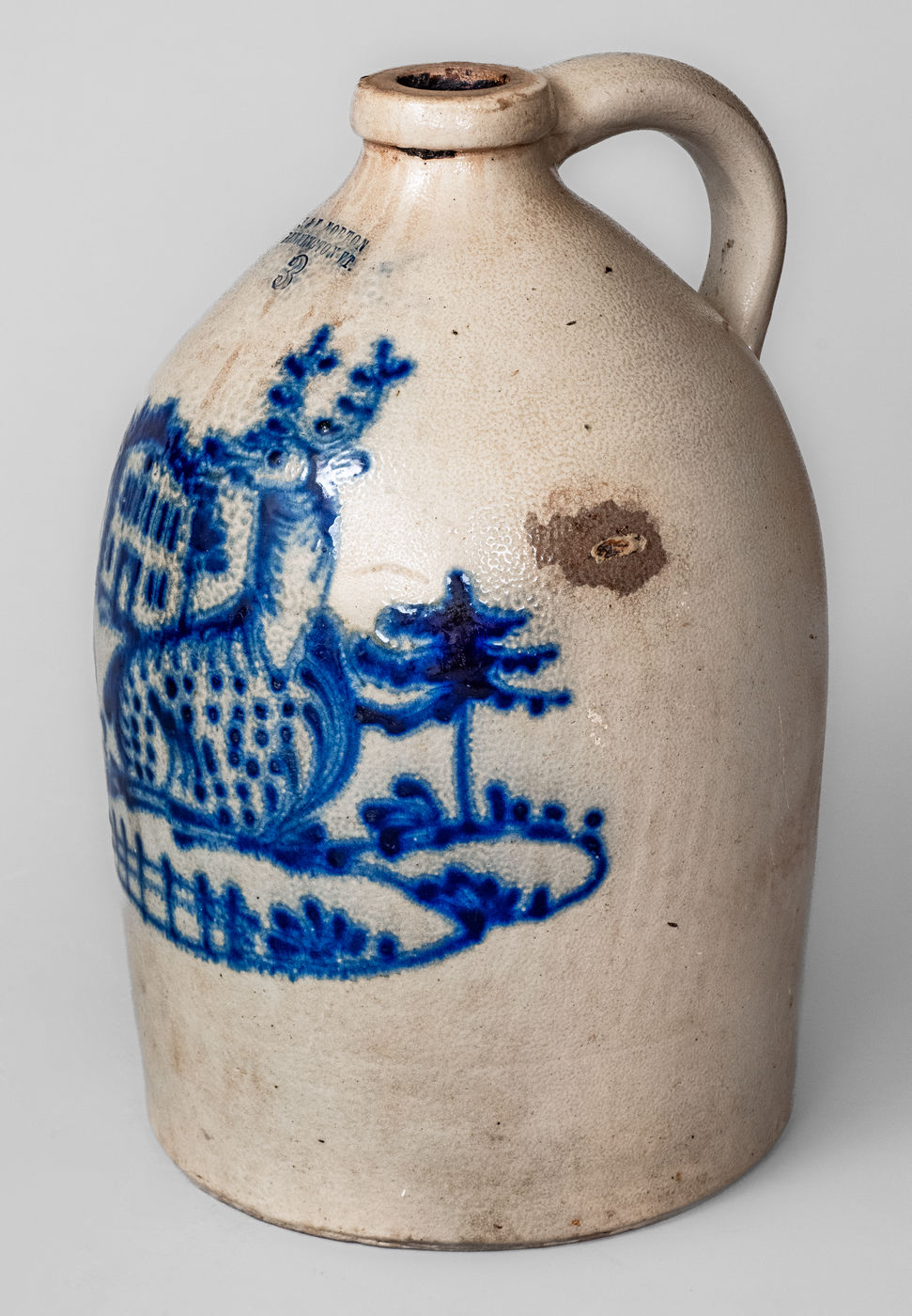 ×J. & E. NORTON / BENNINGTON VT Three-Gallon Stoneware Jug w/ Cobalt Deer Scene
