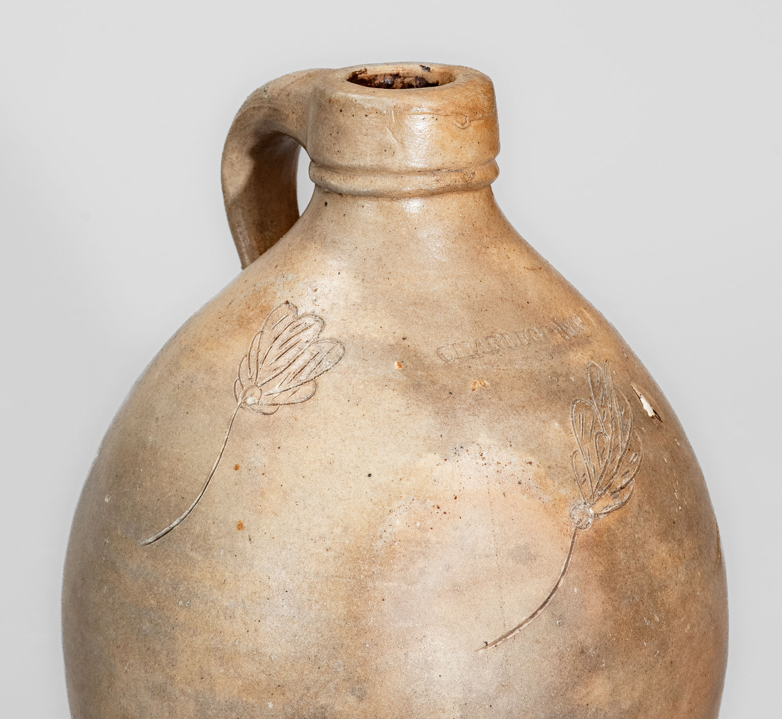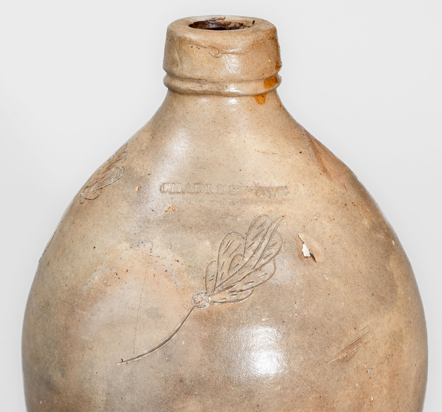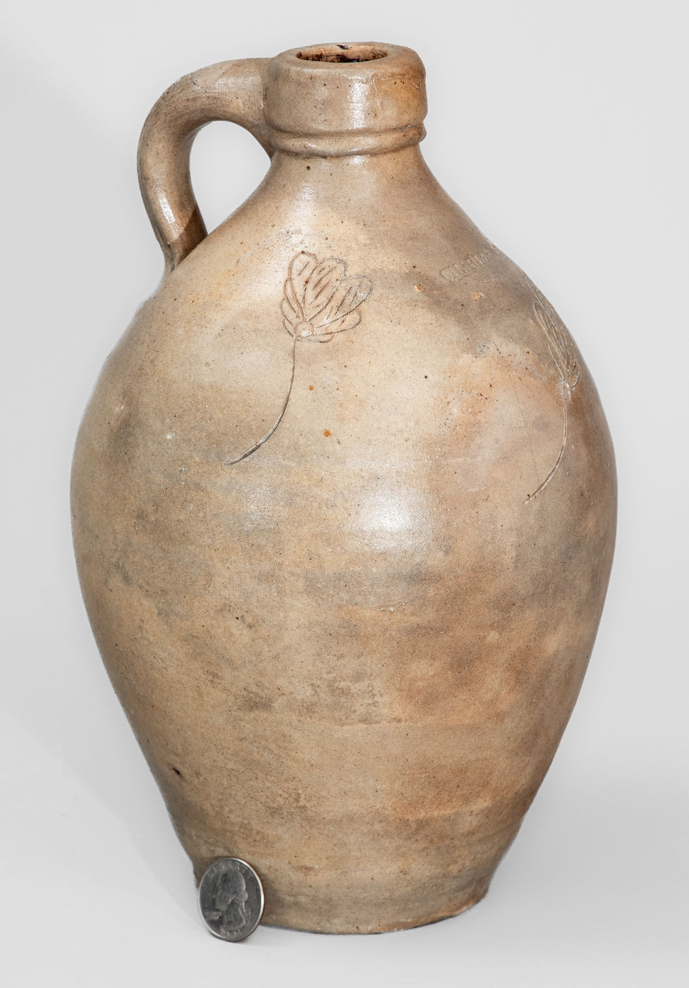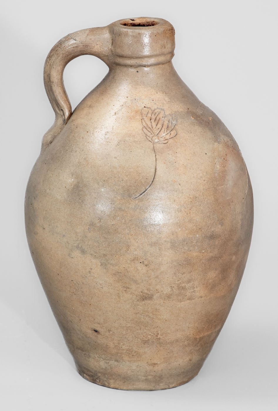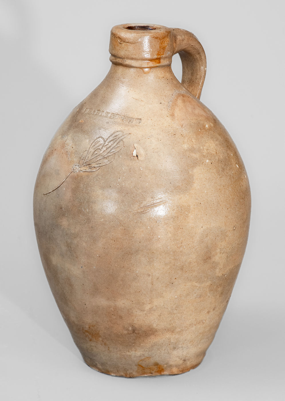×Rare CHARLESTOWN, MA Small-Sized Stoneware Jug w/ Incised Foliate Decoration, c1825