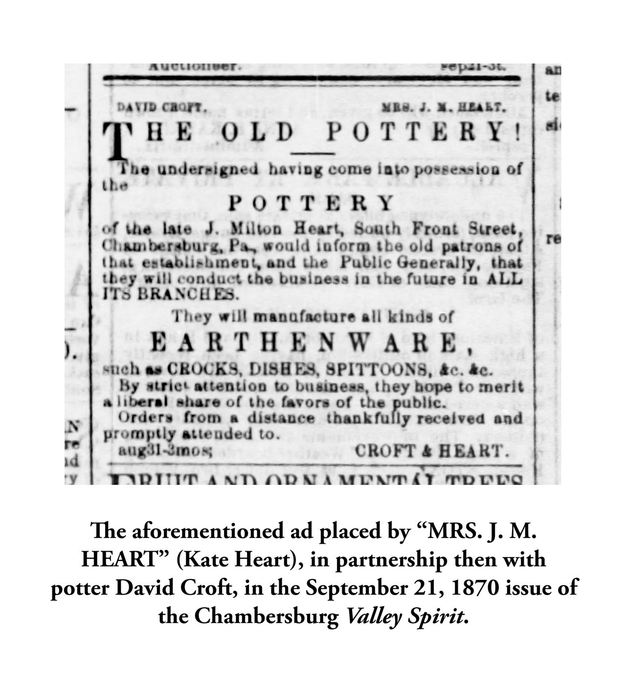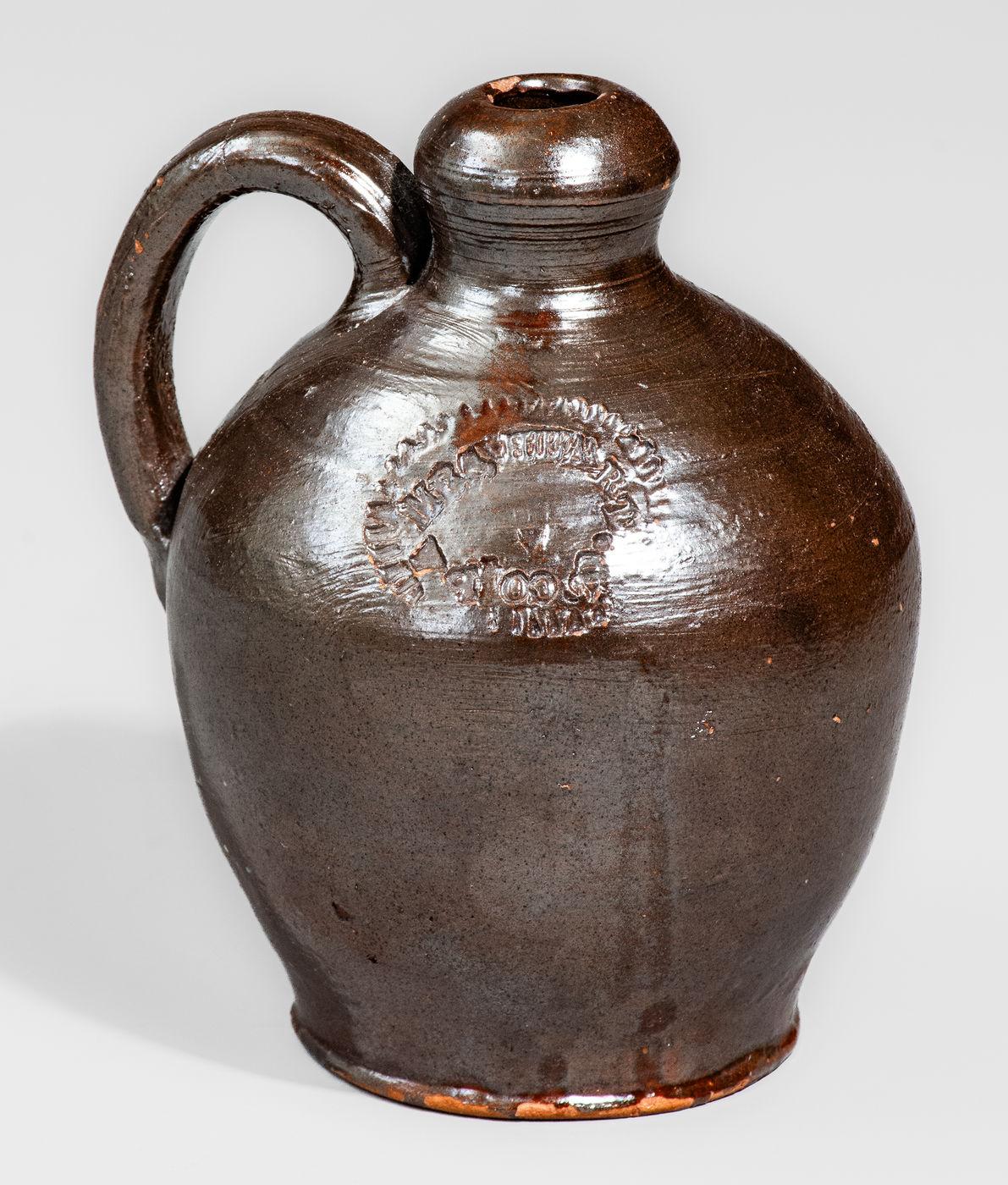 Extremely Rare and Important Small-Sized Redware Jug with Manganese Glaze, Stamped "MRS, HEART. & CO PA," Kate Heart Pottery, Chambersburg, PA, circa 1870-1872, highly ovoid jug with footed base, thick, rounded spout, and rounded handle with pointed lower terminal, the surface covered in a metallic brown lead-and-manganese glaze. Impressed at the shoulder with the oval maker's mark of the widow of J. Milton Heart, son of the more well-known redware potter Jacob Heart. Based on information in William S. Bowers, Craftsmen of Franklin County, Penna.: 1784-1884 (pp. 196-199), J. Milton Heart took up the mantle of his father in the wake of his 1865 death. J. Milton Heart appears in the 1870 federal census as a potter in Chambersburg with his wife, "Catherine" (given as "Kate" in more official documents) and three children, yet shortly after this census was taken (in June of that year) he died at the age of 38. By the following September, his widow, Kate, was advertising that she was operating "The Old Pottery" in partnership with local potter, David Croft. Since according to Bowers the pottery was sold in 1872, it is apparent that for some brief period between 1870 and 1872, Kate Heart was operating the shop under the name of "Mrs. Heart & Co." and having the ware stamped as such. Widows of craftsmen carrying on their husband's businesses in this manner was not uncommon in 19th century America, but the discovery of a signed example of such a business arrangement is extraordinary. (As an example, a highly important redware jar, bearing the incised signature, "Mary Adam," on the underside, resides in the collection of the Museum of Early Southern Decorative Arts in Winston Salem, North Carolina. As with Heart, Mary Adam of nearby Hagerstown, Maryland, assumed the operation of her husband Henry's pottery upon his death, running the shop from 1819 to 1825.) Mrs. Heart's jug, possibly thrown by Heart herself, serves as an historically significant work of Shenandoah Valley regional ware, highlighting the role of women as entrepreneurs in 19th century America. Only a few pieces bearing her stamp are known. Very nice condition. Glaze loss around foot. A few minor flecks of glaze loss elsewhere. A few glaze flakes to interior of spout. An in-the-firing surface line to top of handle, which does not extend through to handle's underside. H 5 7/8".