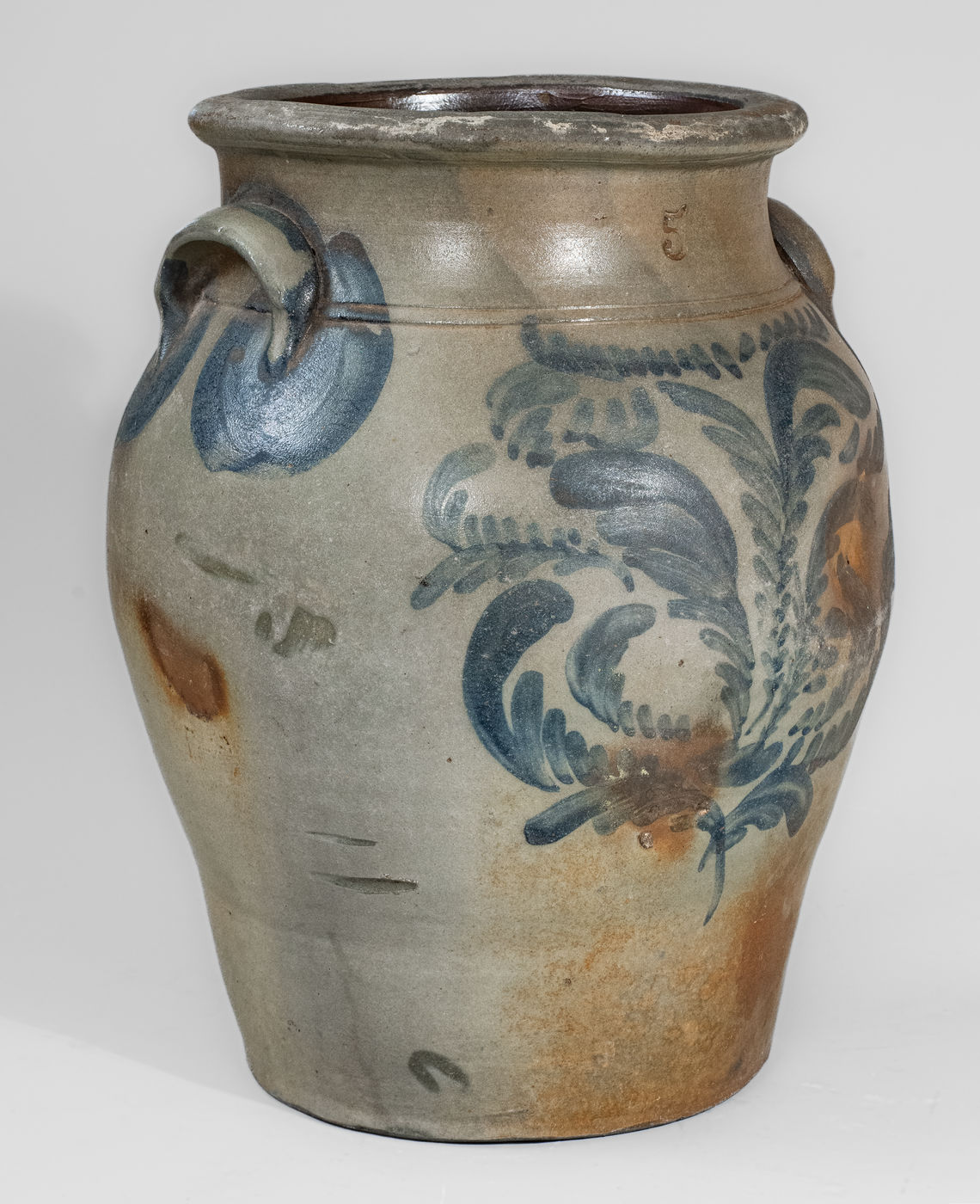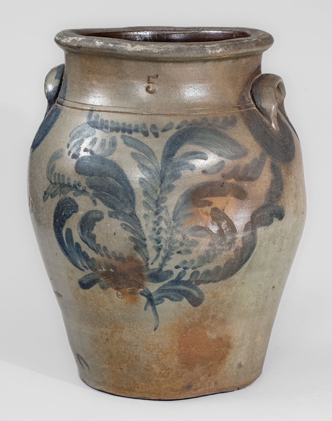×Five-Gallon Beaver, Pennsylvania Stoneware Jar w/ Elaborate Cobalt Foliate Decoration, c1860
