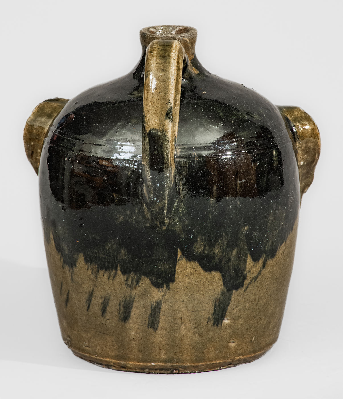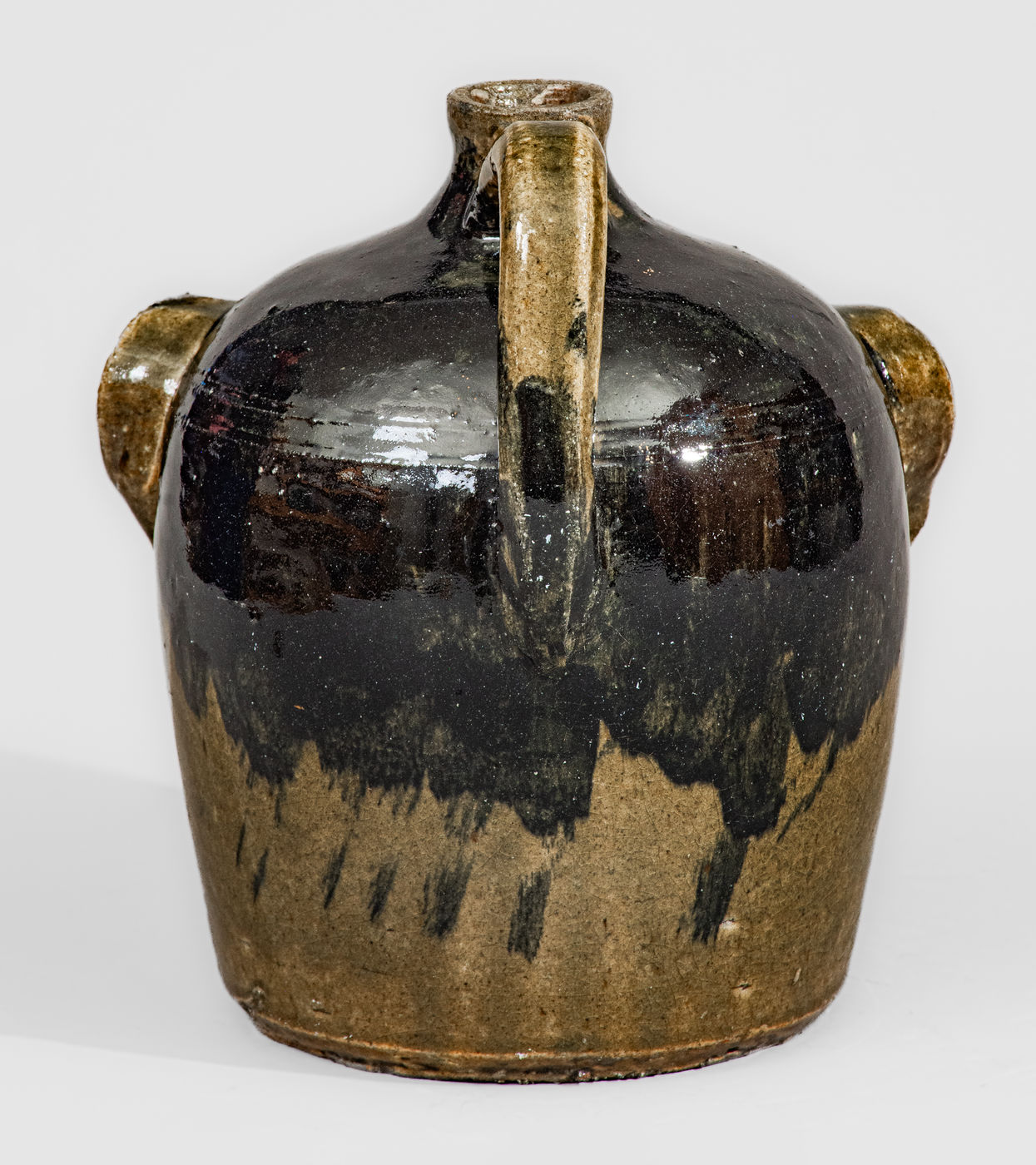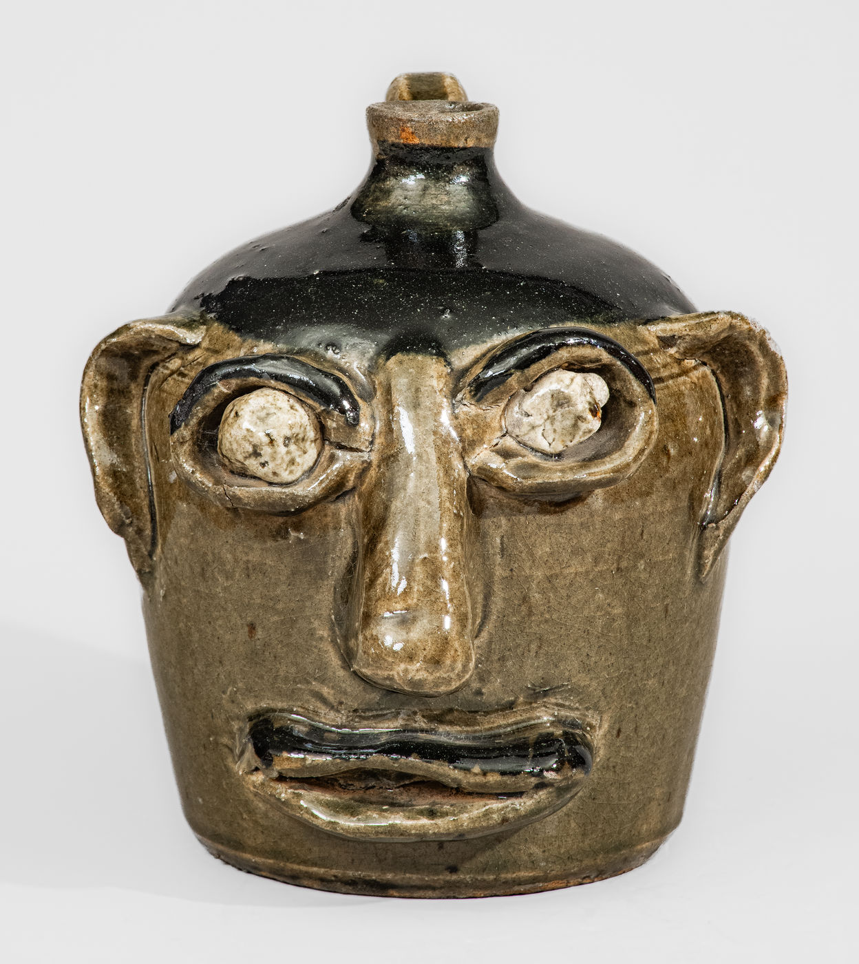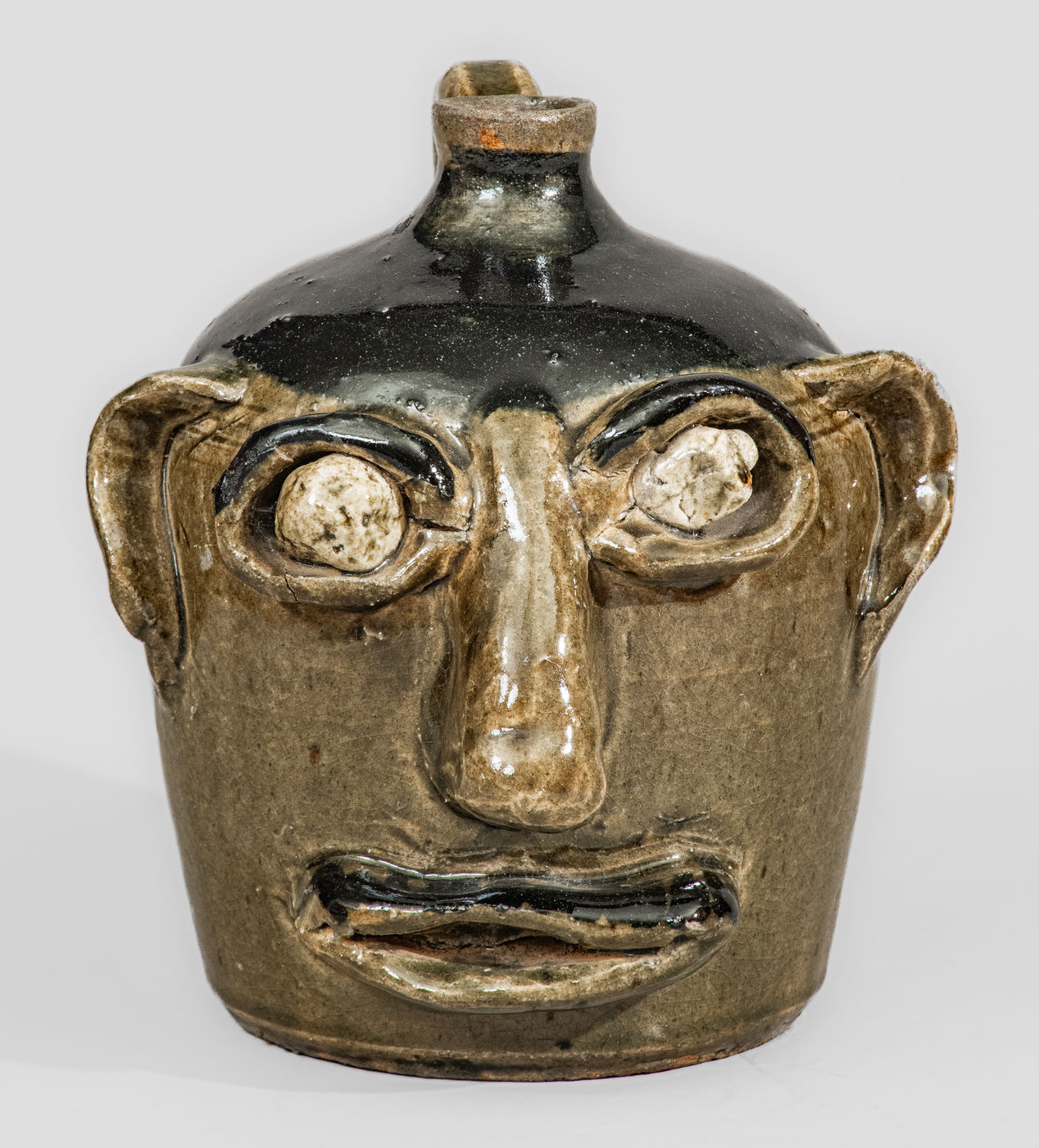 Exceedingly Rare and Important Early-Period Alkaline-Glazed Stoneware Face Jug with Rock Eyes and Black Slip Decoration, Signed "L.M.," Lanier and Arie Meaders, Cleveland, GA origin, circa late 1960s, ovoid jug with tooled shoulder and flaring spout, decorated with a hand-modeled and applied clay face including large rock eyes set within oval lids, a pronounced nose, curved ears, and rippled mouth; brush-decorated with highly unusual black-slip hair to the head, highlights to the upper eyelids, and a mustache along the upper lip. Surface covered in an olive-colored alkaline glaze with high gloss, applied over beige-colored clay. Underside inscribed with the script initials, "L.M.," in brushed blue slip, a desirable, early form of signature for Lanier Meaders. While the thrown and modeled face jug is his creation, showing the influence of his father, Cheever, in its large rock eyes, its slip decoration was likely applied by his mother, Arie, who used matching brushwork on her own face jugs. While a number of vases and other forms have been documented as made by Cheever and Arie working together, this collaboration between mother and son is more unusual. Indeed, this face jug is the first of its kind that we have seen combining the efforts of both of these Meaders family members. Its early period of manufacture, highly-prized rock eye treatment and exceedingly rare slip decoration, place it among the very best face jugs known by any member of this illustrious Southern potting dynasty. Provenance: Brunk Auctions, Asheville, NC, January 6, 2007; Frank W. White Collection. Two reglued pieces to proper right eyelid, typical of Meaders family rock-eyed face jugs. Two minor chips to proper left ear. Otherwise excellent condition. H 9".