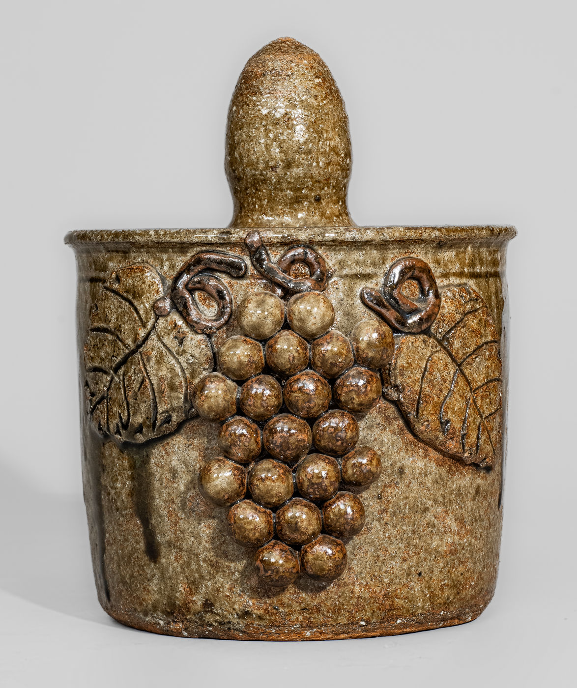 ×Scarce Early-Period "Lm" (Lanier Meaders) Alkaline-Glazed Stoneware Lidded Jar w/ Grapes Motif