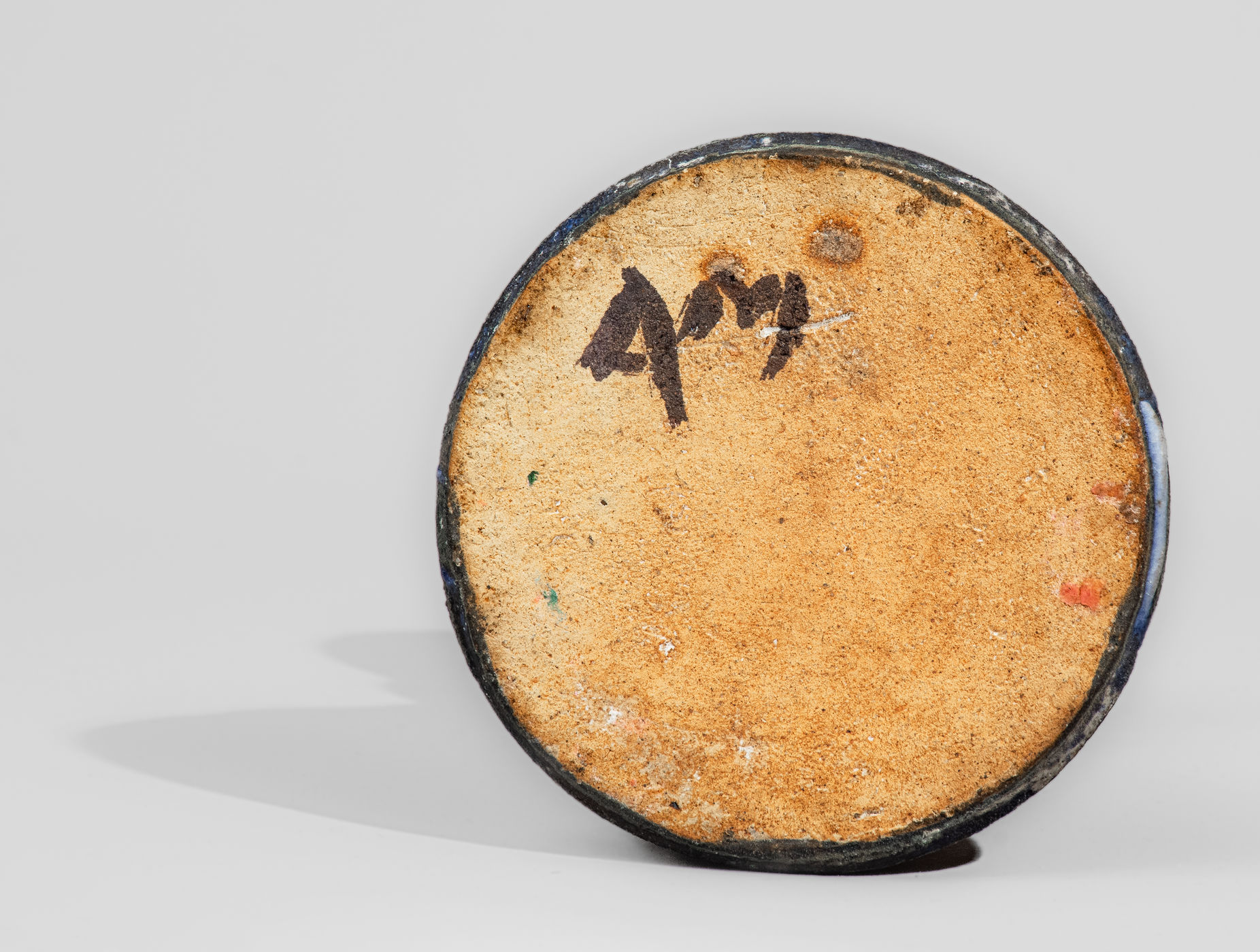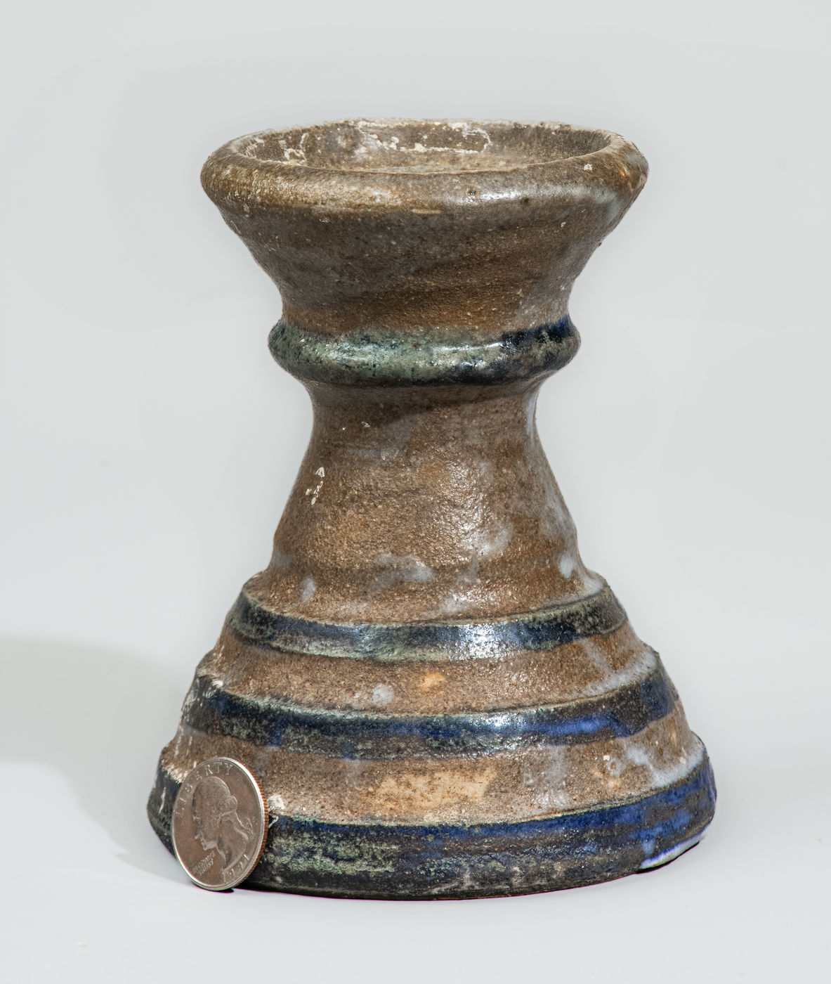 ×"AM" (Arie Meaders) Stoneware Candlestick w/ Blue Slip Decoration