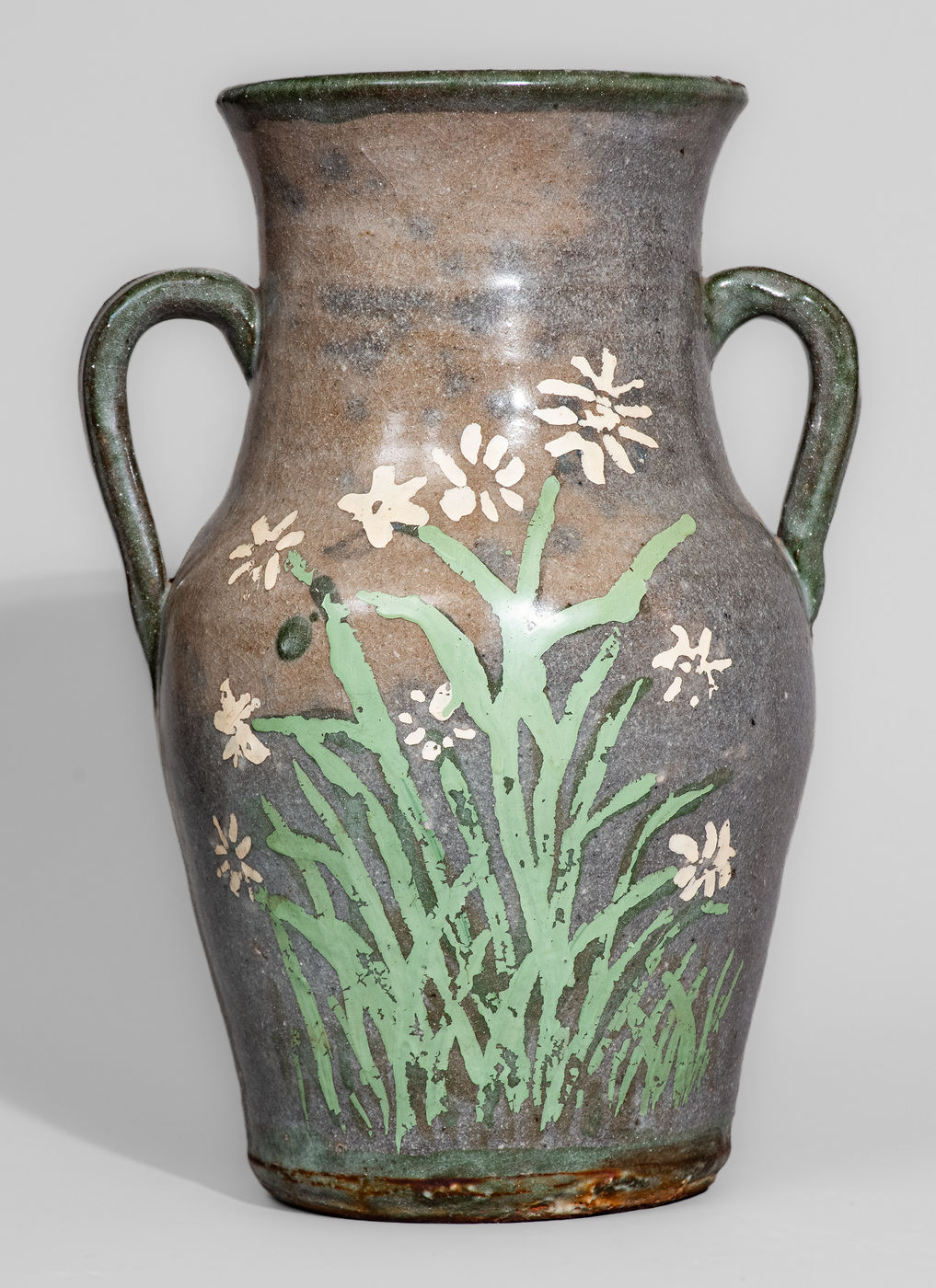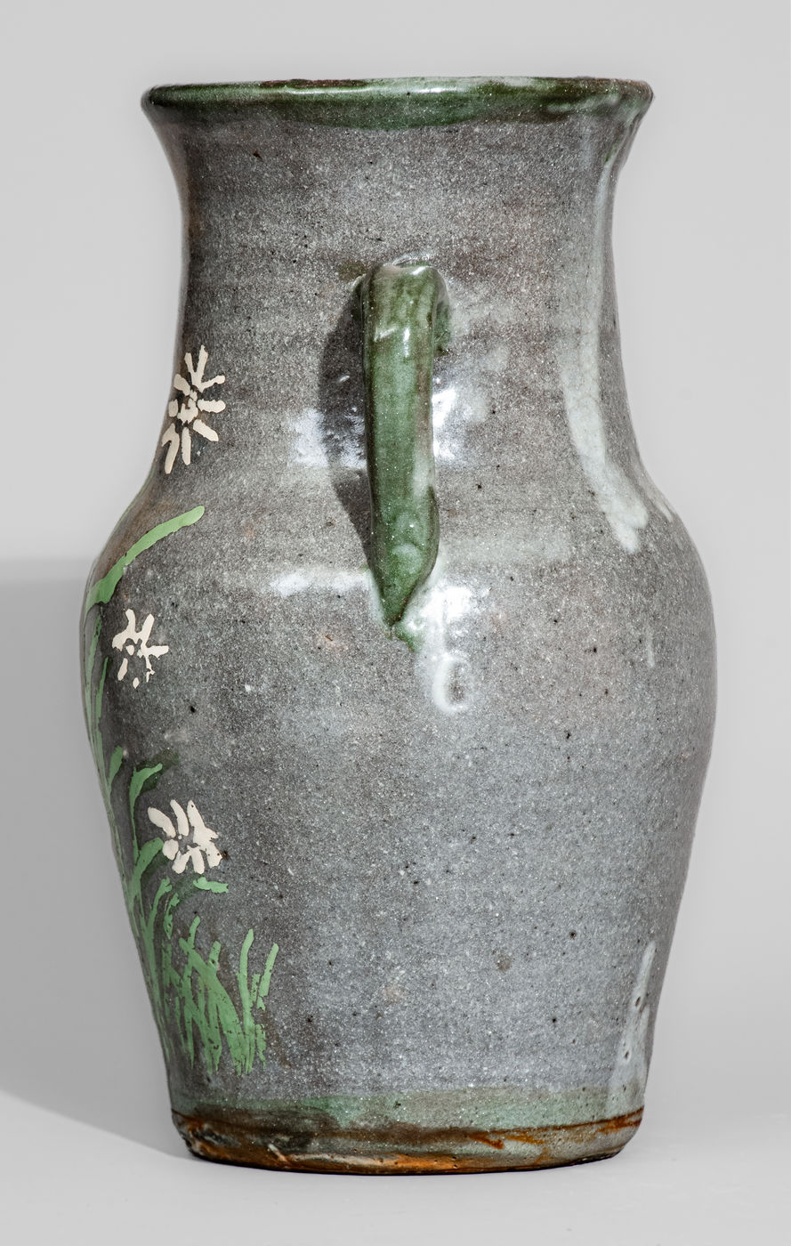 ×Alkaline-Glazed Stoneware Vase w/ Green-Slip Highlights and Painted Floral Decoration, Arie and/or Cheever Meaders
